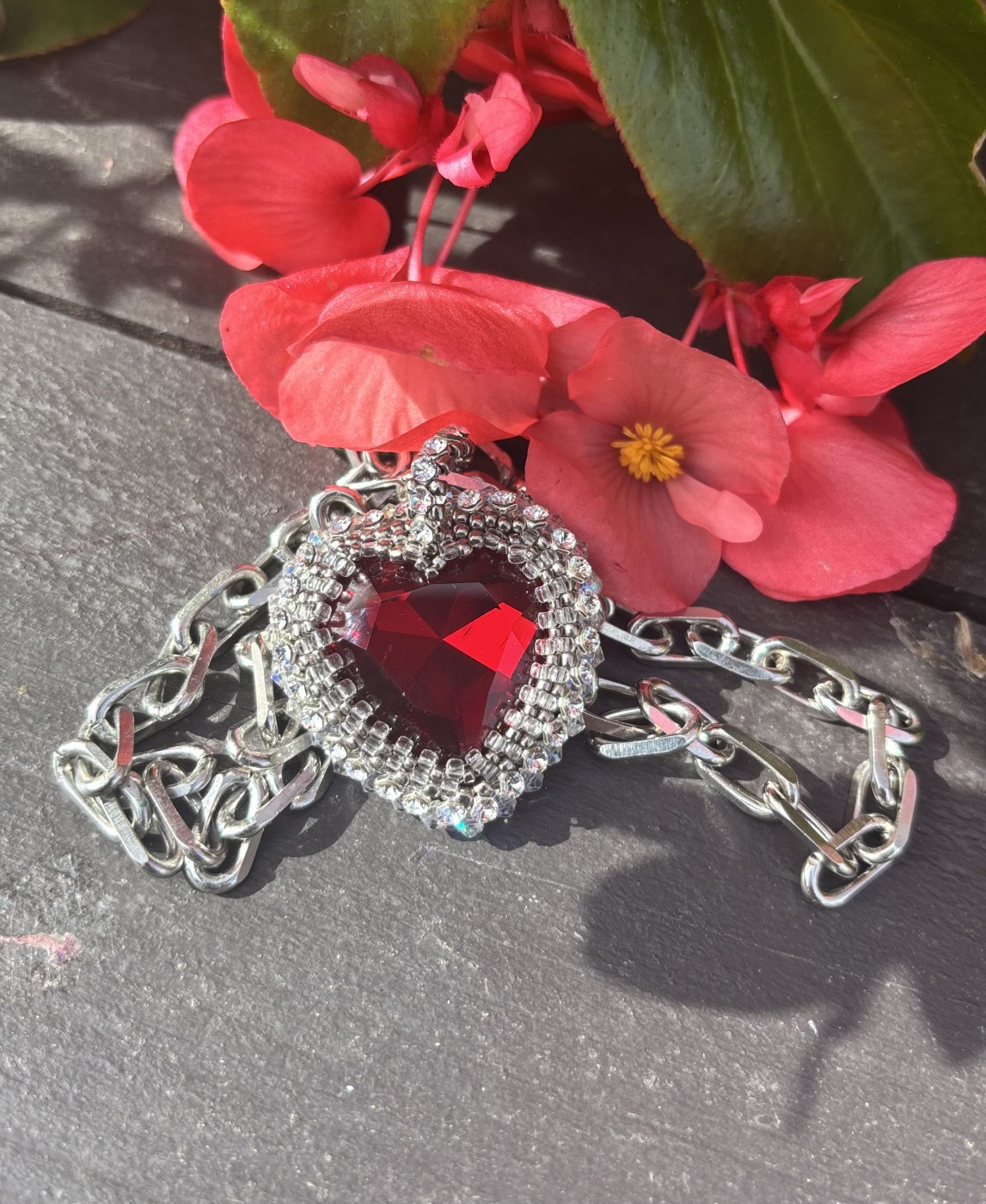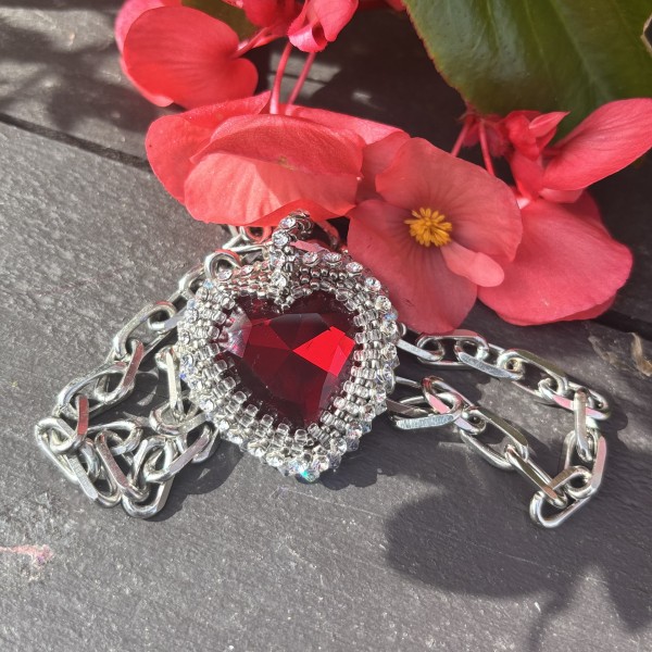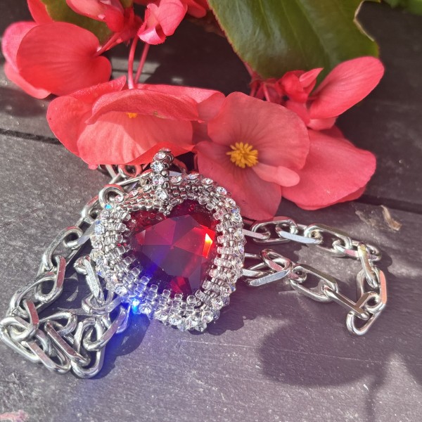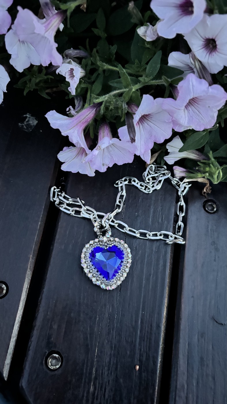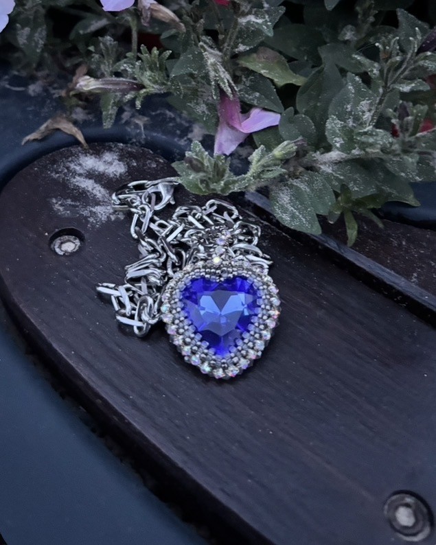 Kulons uz ķēdes “Okeāna sirds” izgatavots, izmantojot austriešu kristālus, sekliņpērlītes (ar niķeļa pārklājumu), pērles un Swarovski kristālus. Ķēdes garums ir regulējams.