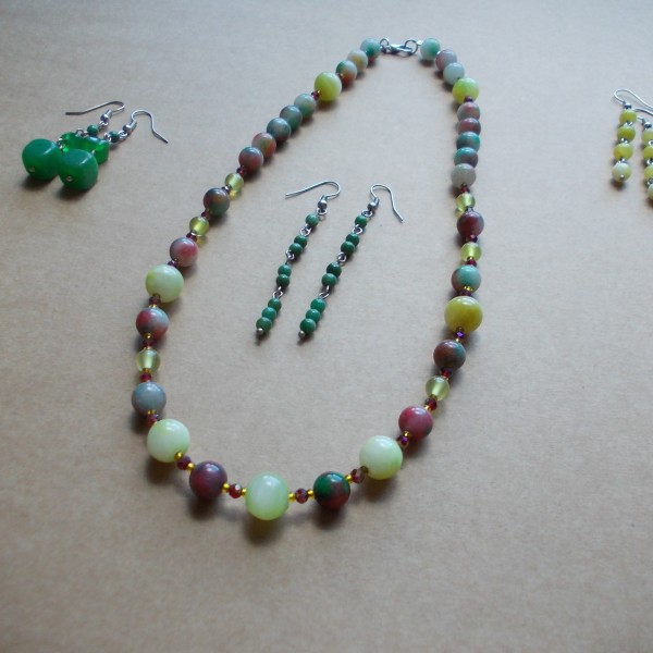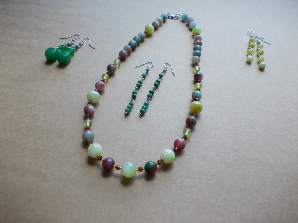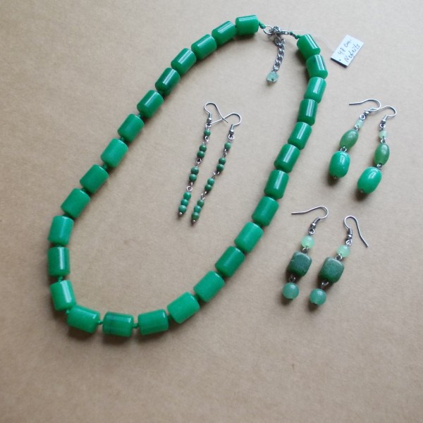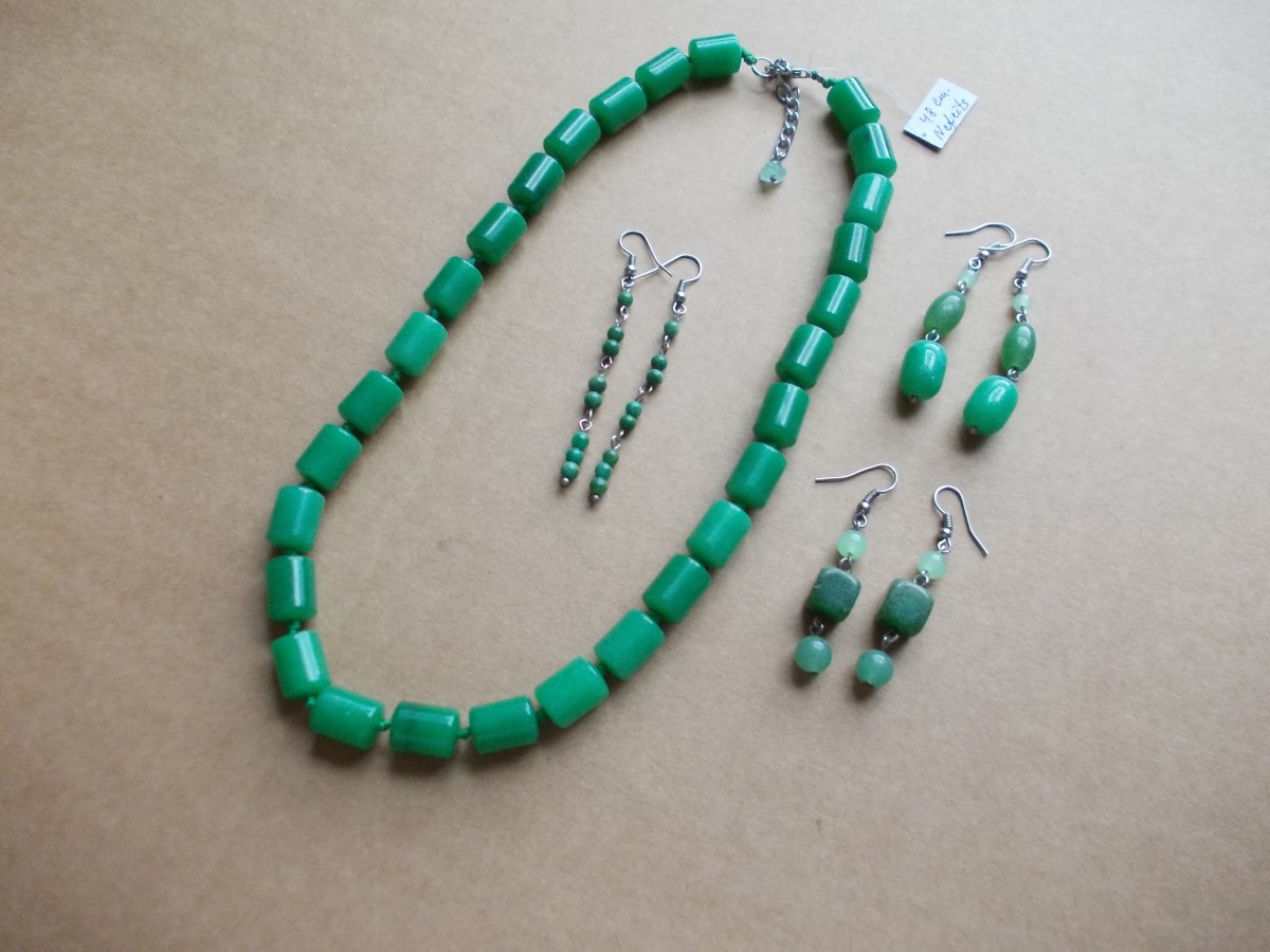 cena 62.00 eiro, 3. foto zaļas vienādas konusa pērles, 48 cm gara kaklarota, cena 85.00 eiro, auskari attēlos 12.00 - 15.00 eiro.