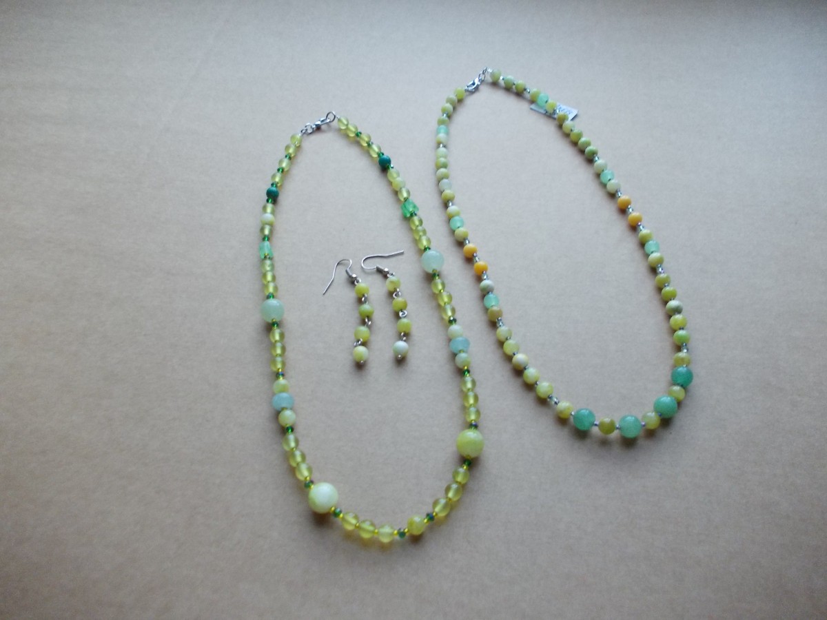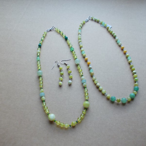 Galvenais foto, dažādu toņu nefrīta pērles ( Jade Persia) 4mm, 6 mm un 8 mm, garums 49 cm, cena 63.00 eiro, 1. foto zaļas dažādas formas nefrīta pērles, konusi, kvadrāti, 6mm, 4mm un AB kristāli, 45 cm gara, cena 63.00 eiro, 2. plakanas un 6mm, 4 mm pērles un AB kristāli, cena 52.00 eiro, 3. divas 48 cm garas rotas zaļais un citronu dzeltenais nefrīts, cena 45.00 eiro katra, auskari 9.00-12.00 eiro.