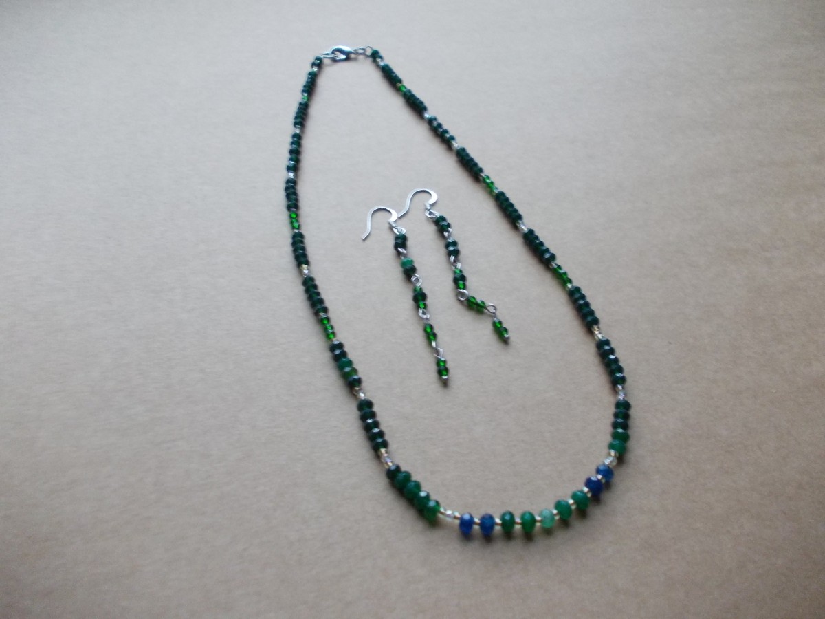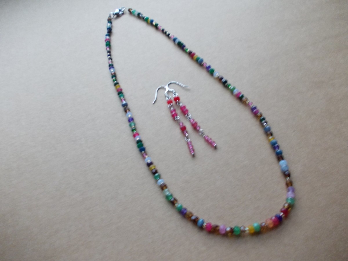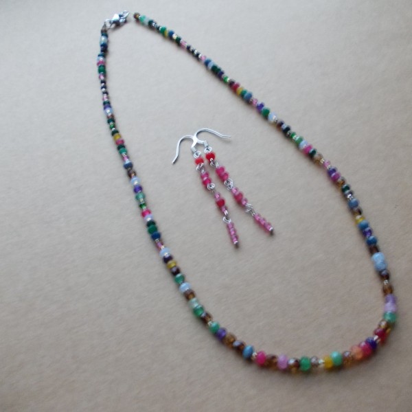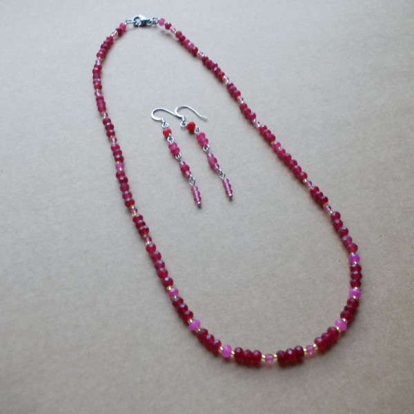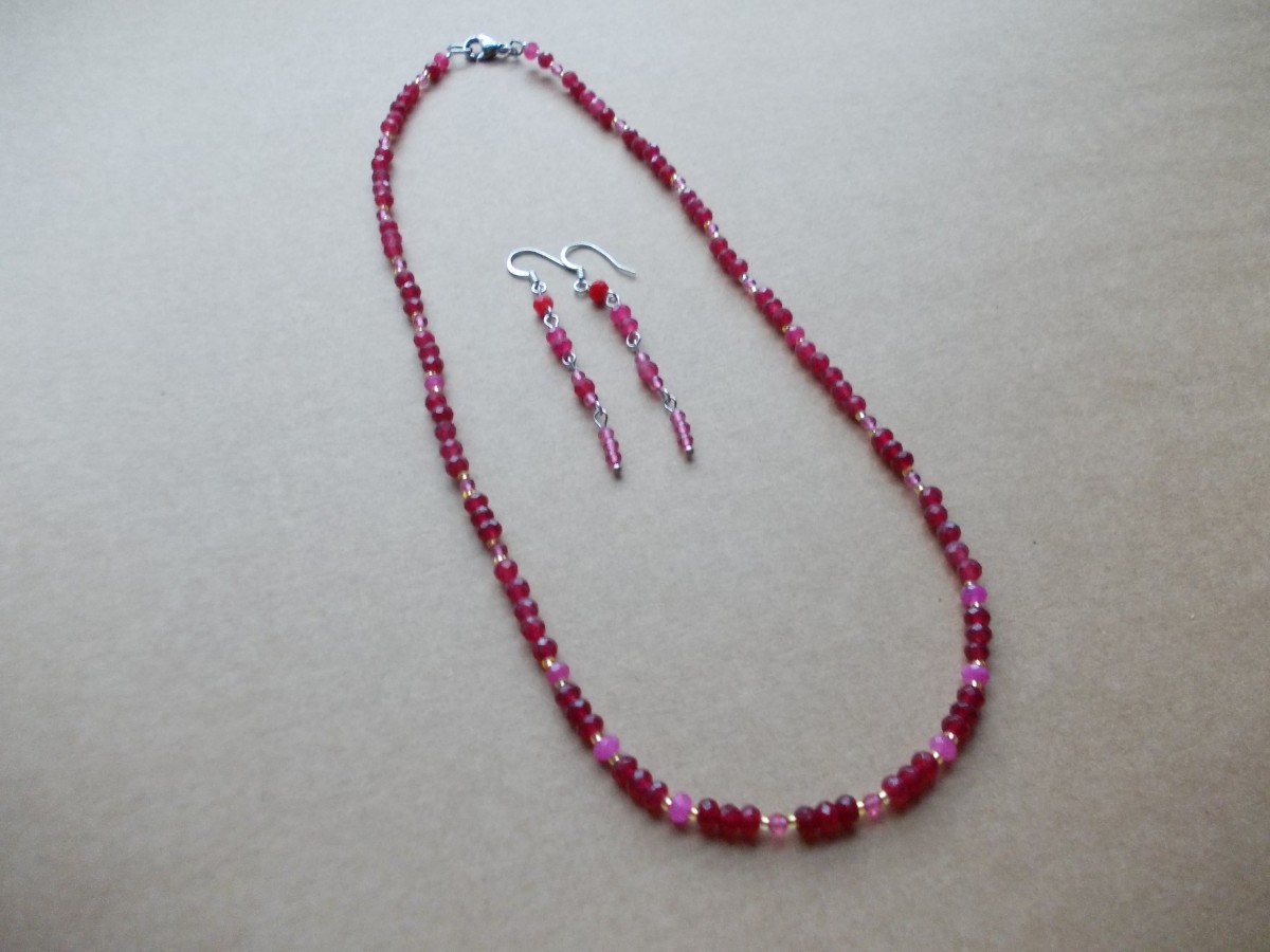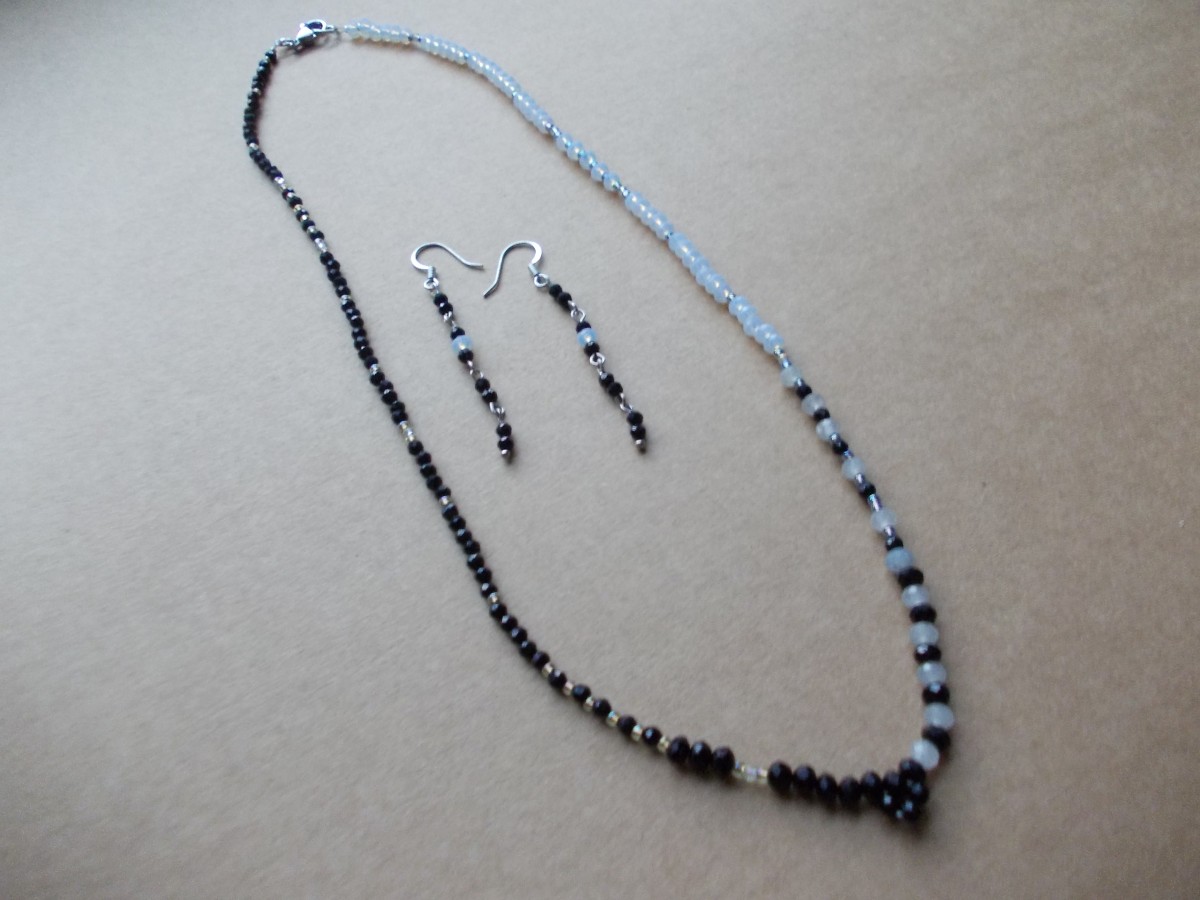 roku darbs - galvenā kaklarota divu melnā un baltā kopums, 49 cm gara, cena 70.00 eiro, auskari 15.00 eiro, 1. foto sarkans ar rozā,