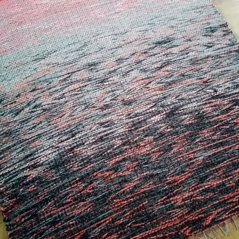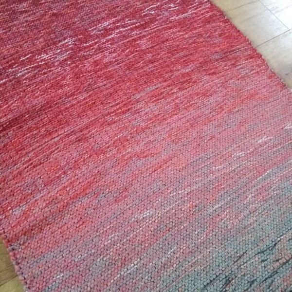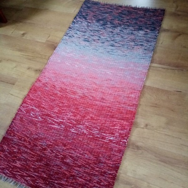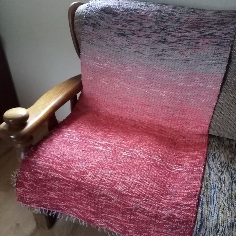 No diegiem un dzijas stellēs austs krēsla pārklājs 1,58 m x 0,73 m. Katrs gals citāds, var mainīt. Abas puses vienādas un lietojamas. Var klāt arī uz grīdas kā grīdas celiņu. Viegli tīrīt, var saudzīgi mazgāt.