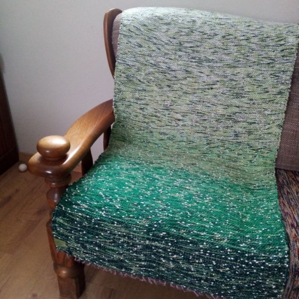 No diegiem un dzijas stellēs austs krēsla pārklājs 1,57 m x 0,73 m. Katrs gals citāds, var mainīt. Abas puses vienādas un lietojamas. Var klāt arī uz grīdas kā grīdas celiņu. Viegli tīrīt, var saudzīgi mazgāt.