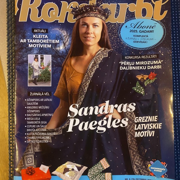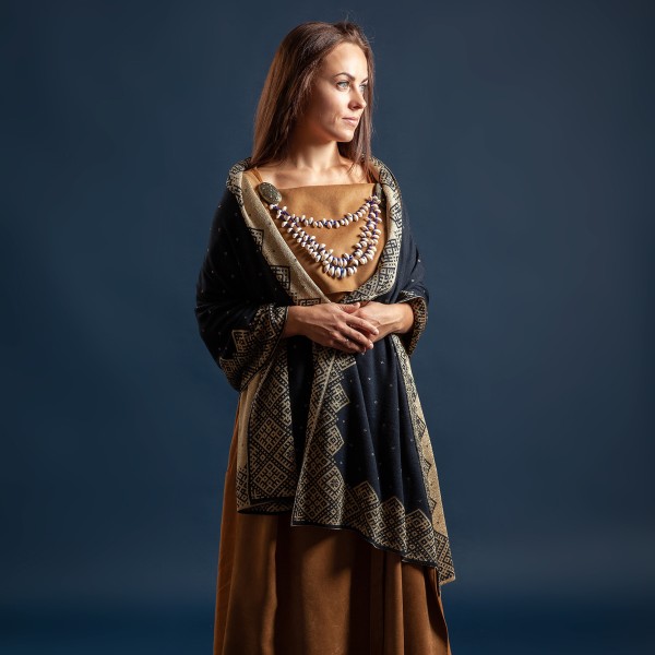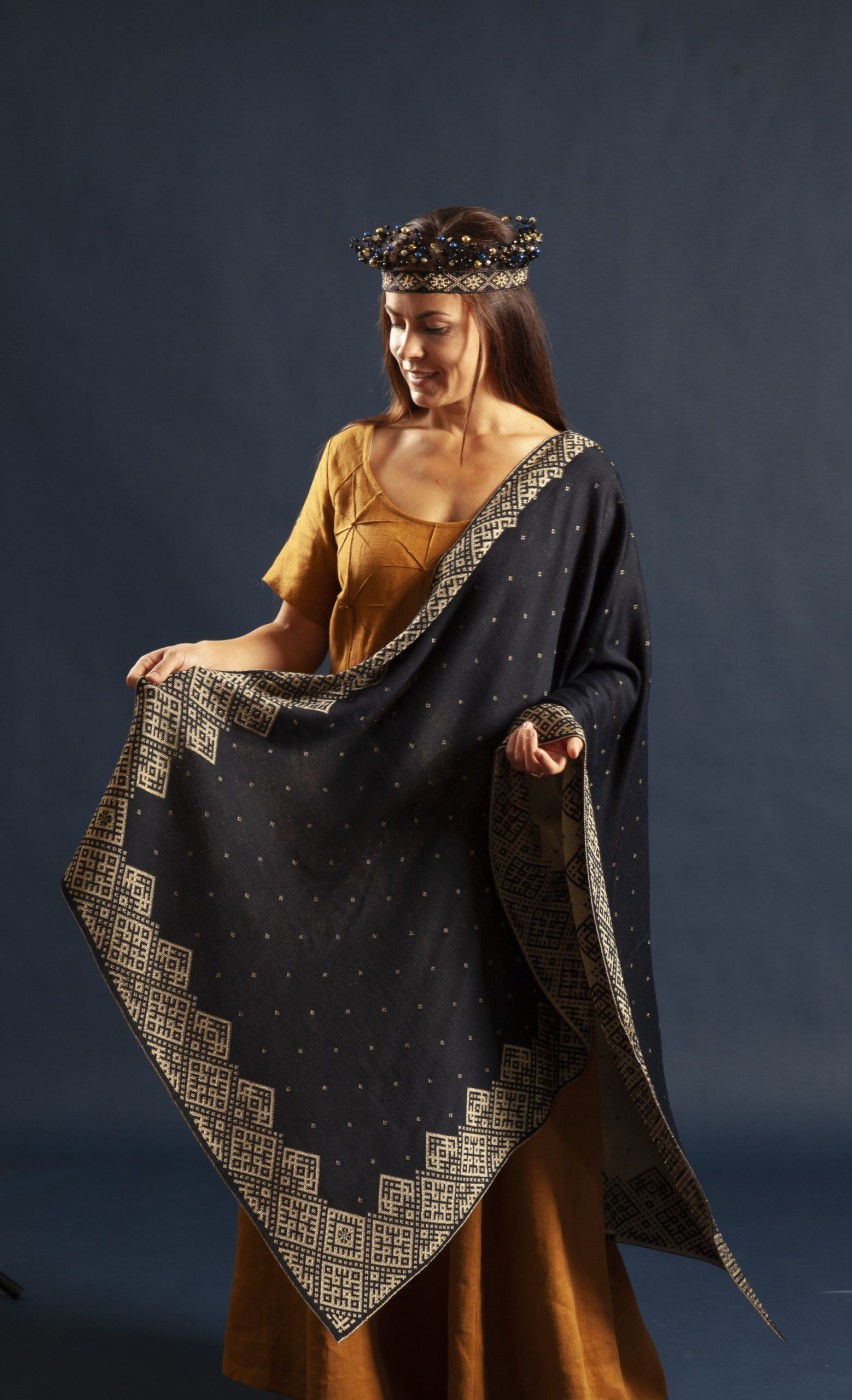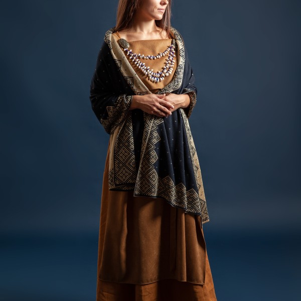 Jaunrade, Sēļu villaine tumši zila ar bronzu, var nēsāt no abām pusēm jo zīmējums reversā. Merino dzijas plāns pavediens ar viskozes bronzas krāsas pavedienu 190x75 cm.