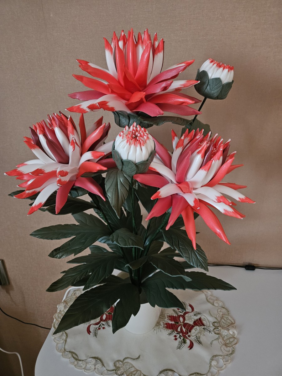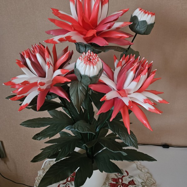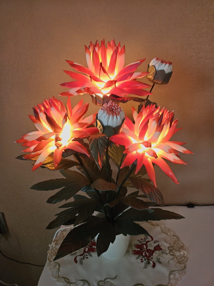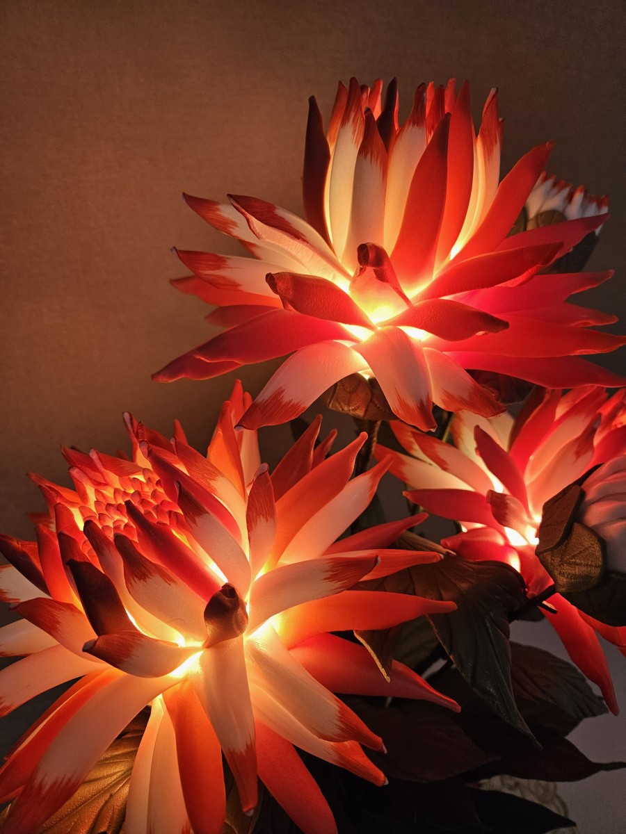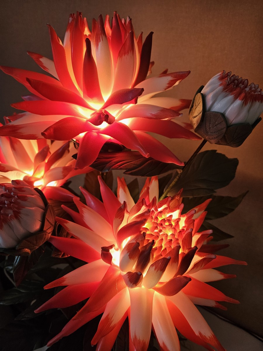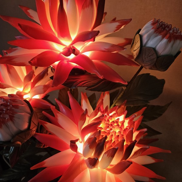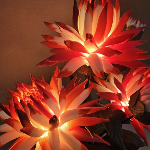 Šīs spilgti sarkanbaltās dālijas piešķirs telpai dzīvību, enerģiju un vizuālo akcentu. Katrs zieds veidots rūpīgi, lai saglabātu dabisko formu , faktūru un eleganci. Iedegtā veidā dālijas izstaro maigu, siltu gaismu, kas telpā rada mājīgu un priecīgu noskaņu. Izslēgtas tās saglabā dekoratīvo skaistumu, kas piesaista skatienu. Šī lampiņa piemērota jebkurai telpai, kurai nepieciešams spilgts akcents vai oriģinālai, pārsteidzošai dāvanai.