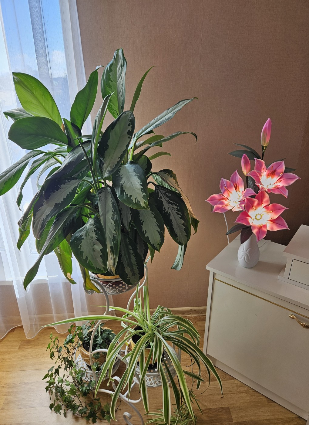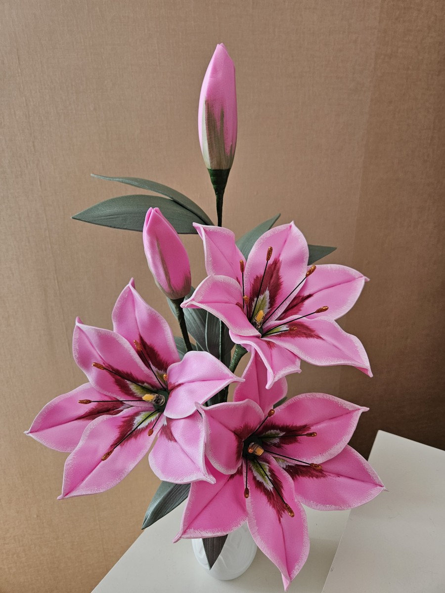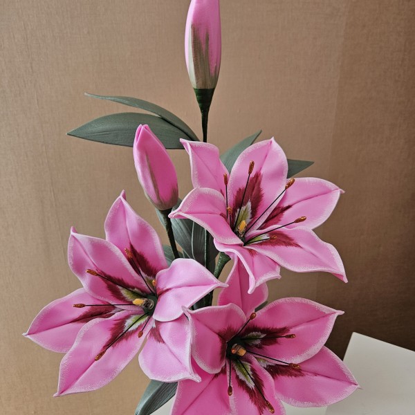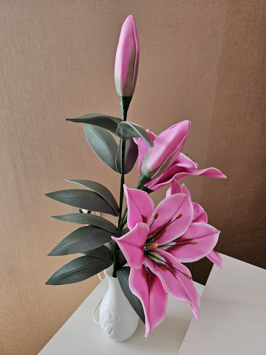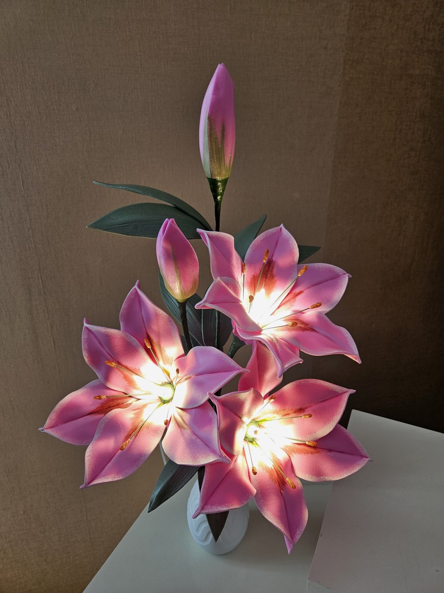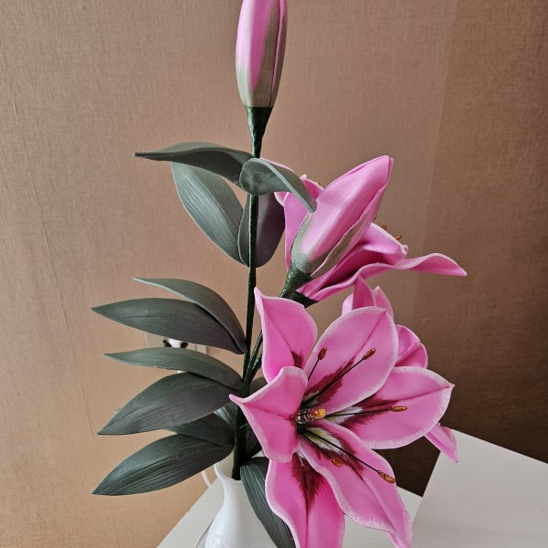 Trīs atvērtie liliju ziedi ar pumpuriem uz viena kāta būs skaists interjera akcents uz galda, kumodes vai naktsskapīša, piešķirot telpai eleganci un piepildot to ar noskaņu veidojošu gaismu. Katrs zieds ir tonēts un rūpīgi veidots, lai panāktu dabiskuma efektu.