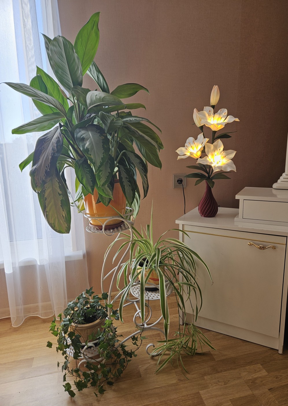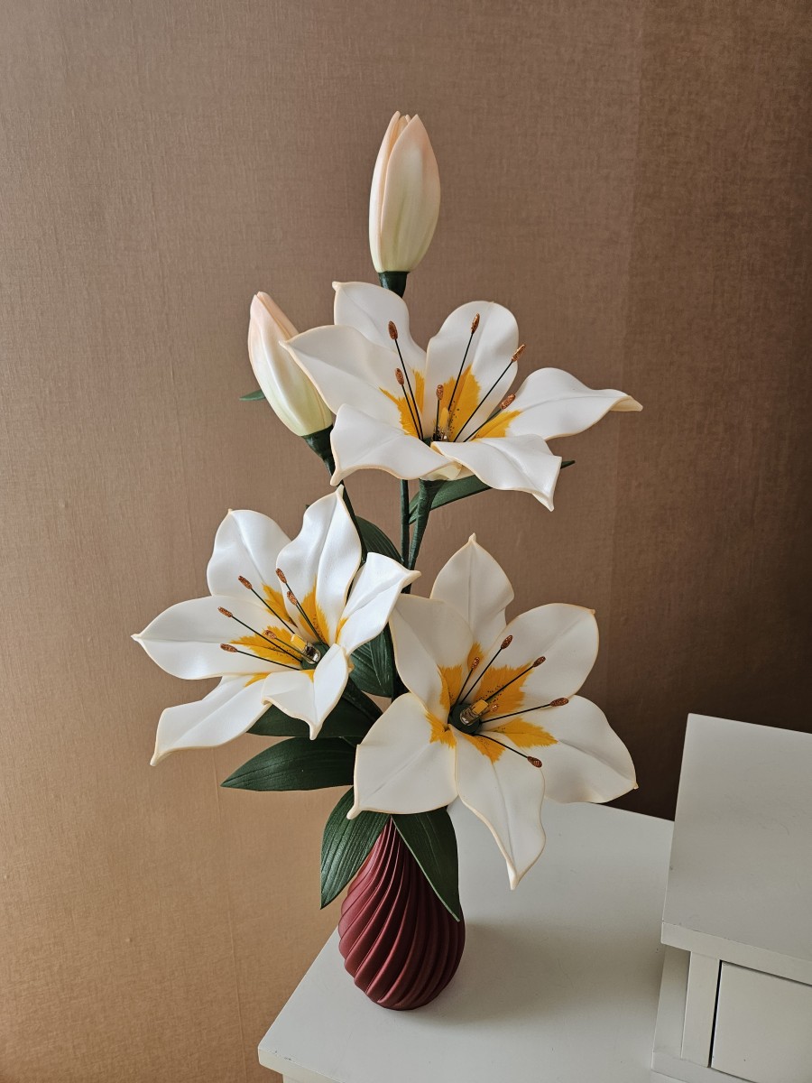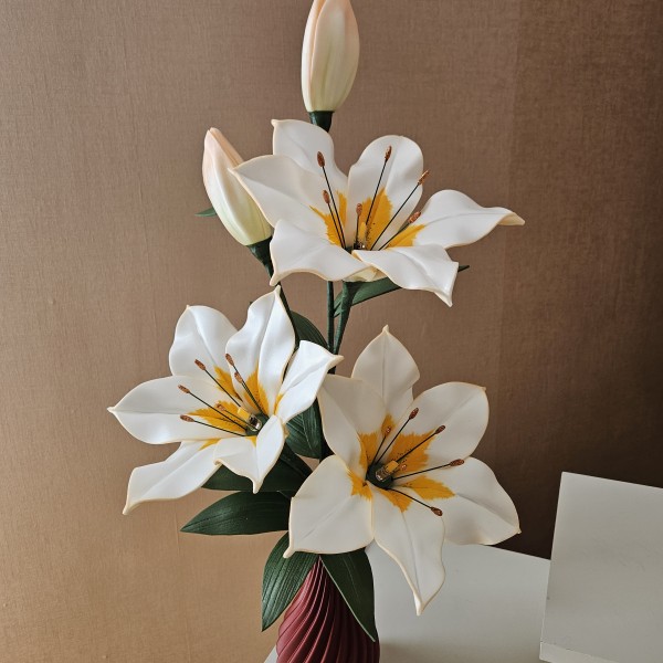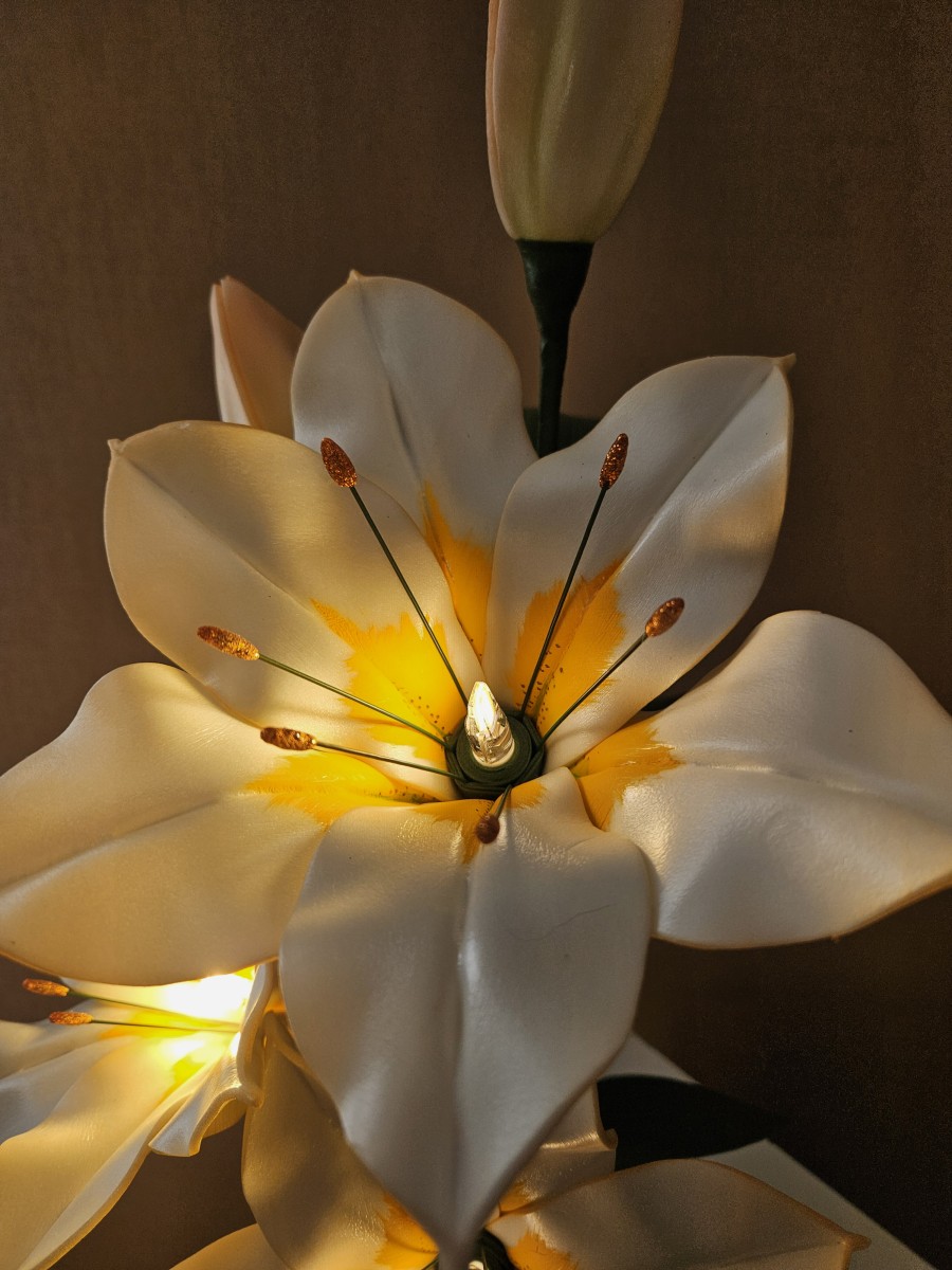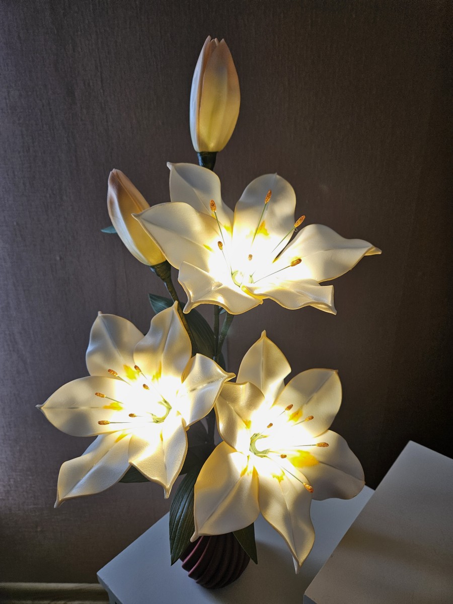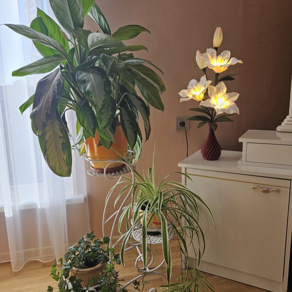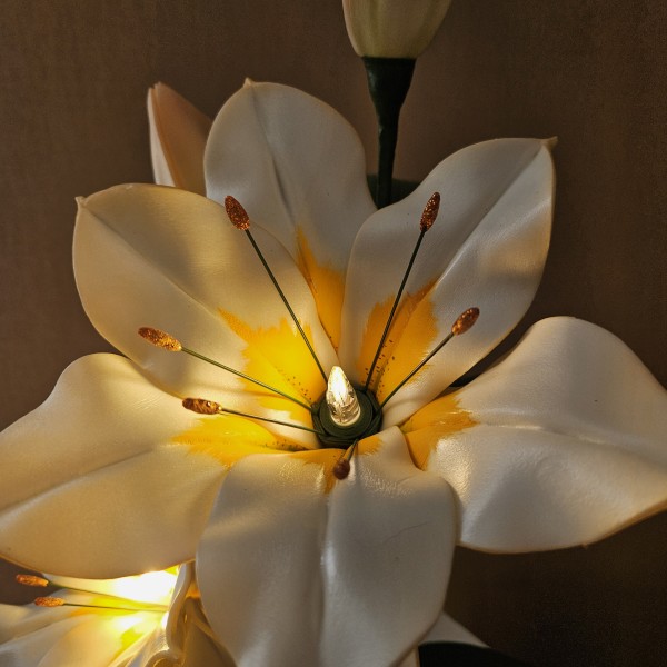 Trīs atvērtie liliju ziedi ar pumpuriem uz viena kāta būs skaists interjera akcents uz galda, kumodes vai naktsskapīša, piešķirot telpai eleganci un piepildot to ar noskaņu veidojošu gaismu. Katrs zieds ir tonēts un rūpīgi veidots, lai panāktu dabiskuma efektu.