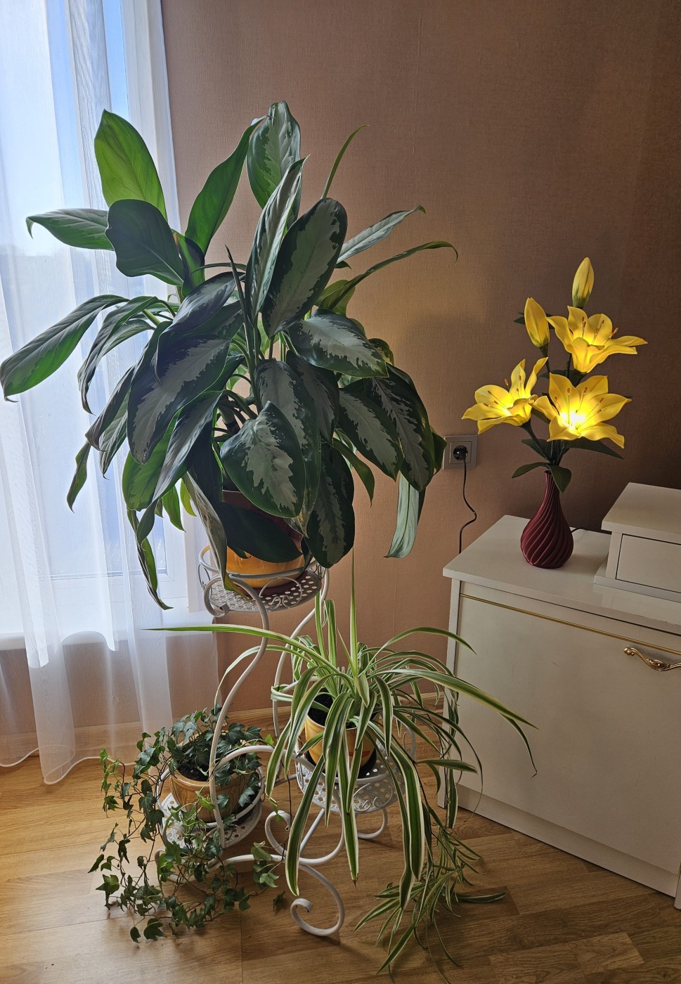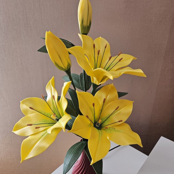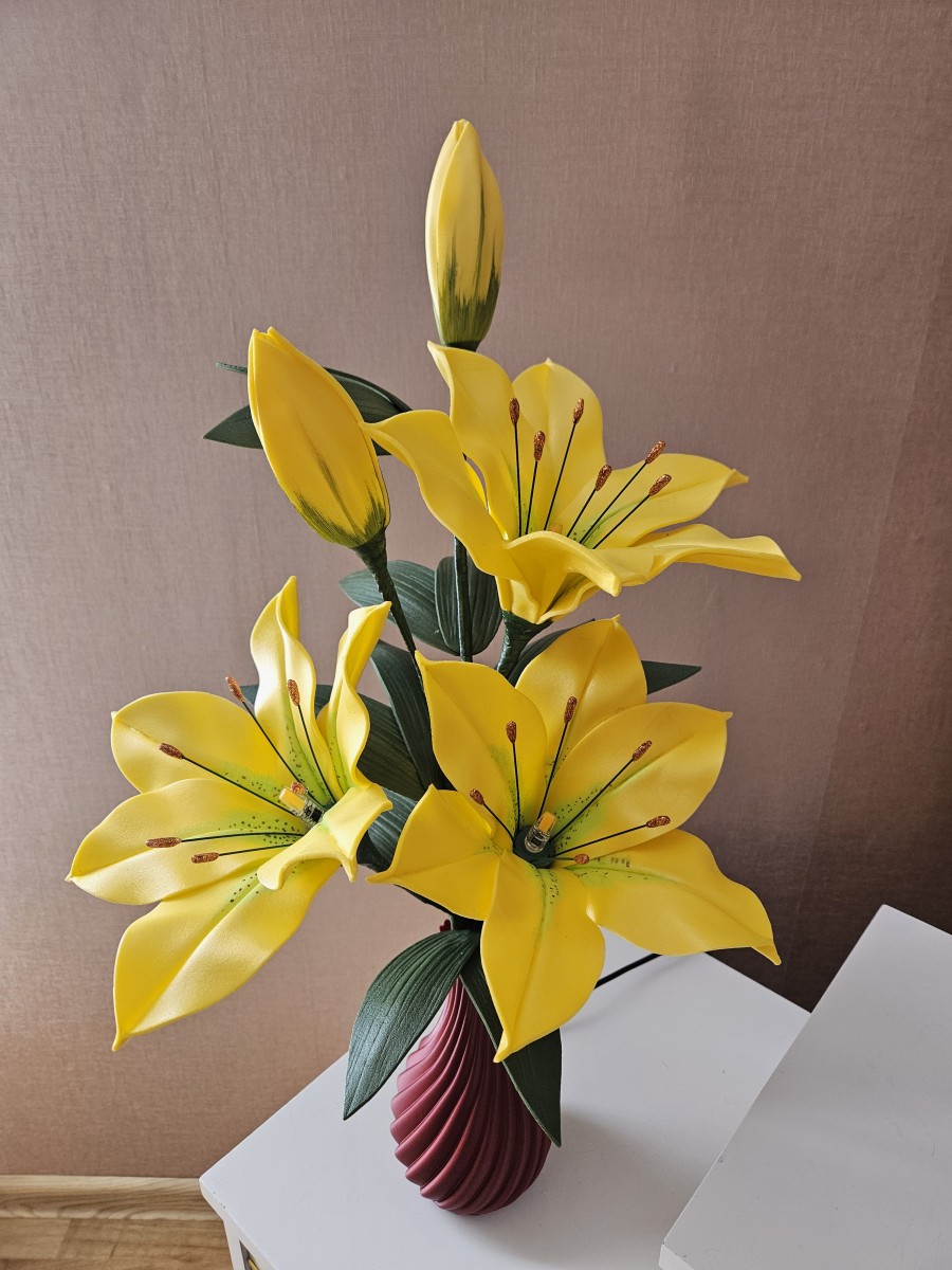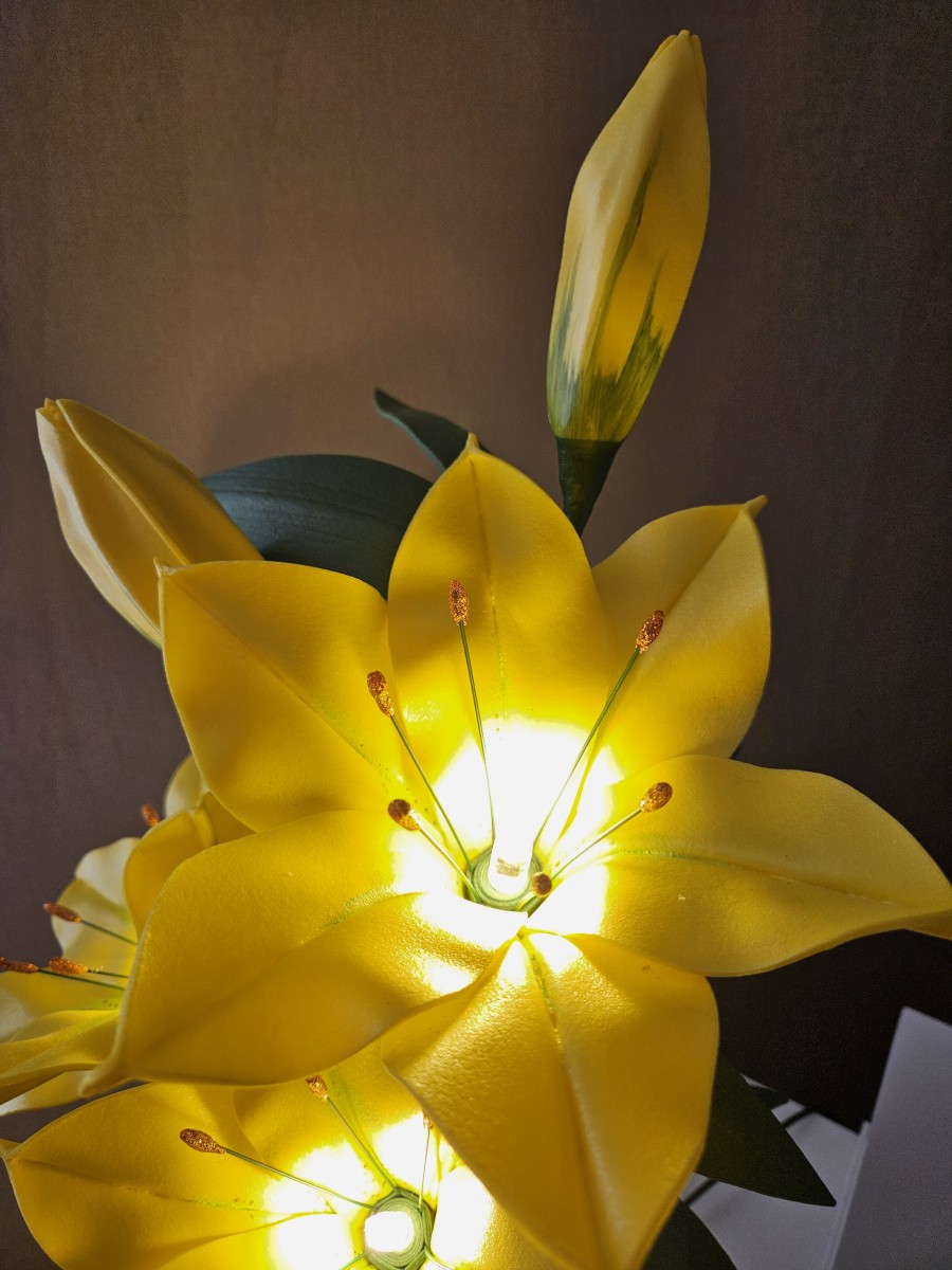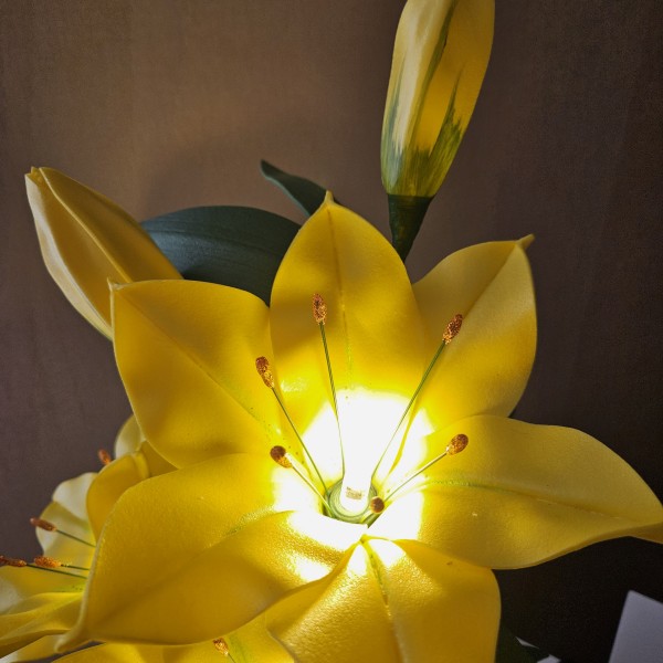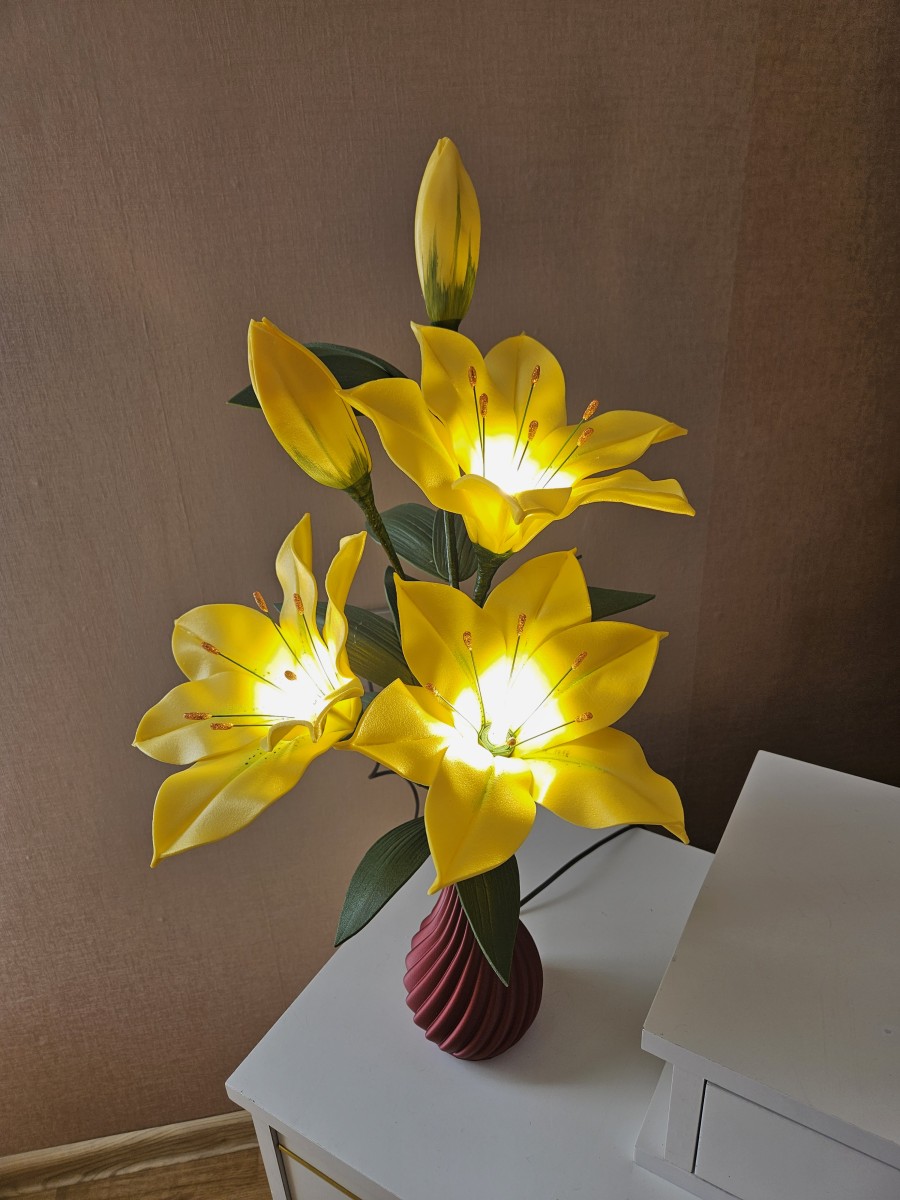 Trīs atvērtie liliju ziedi ar pumpuriem uz viena kāta būs skaists interjera akcents uz galda, kumodes vai naktsskapīša, piešķirot telpai eleganci un piepildot to ar noskaņu veidojošu gaismu. Katrs zieds ir tonēts un rūpīgi veidots, lai panāktu dabiskuma efektu. Būs arī kā neaizmirstama un pārsteidzoša dāvana.