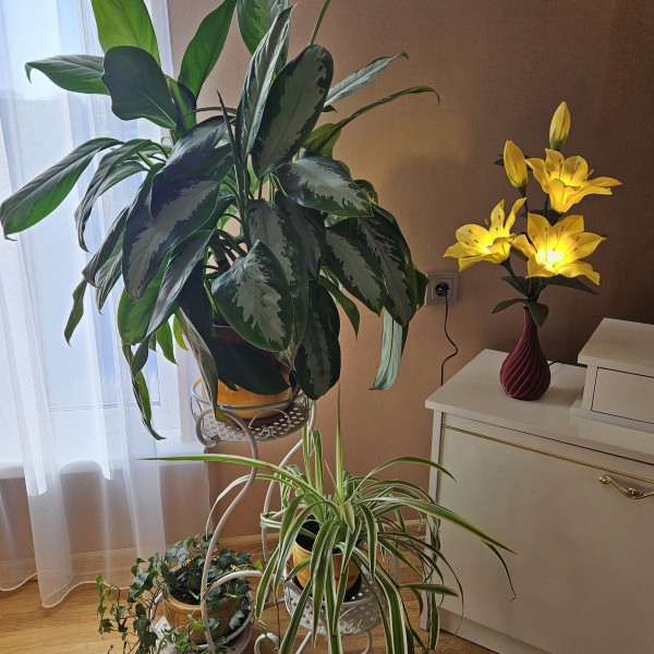 Lampiņa izgatavota no izolona. Tās augstums ~ 63 cm, zieda diametrs ~ 20 cm. Spuldzītes maināmas (3W).