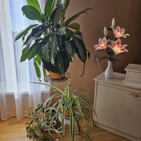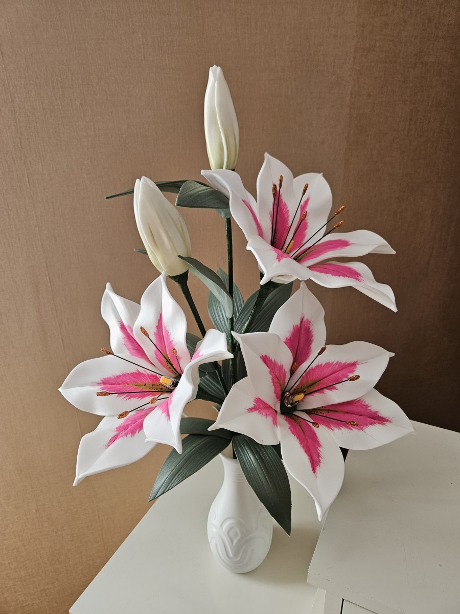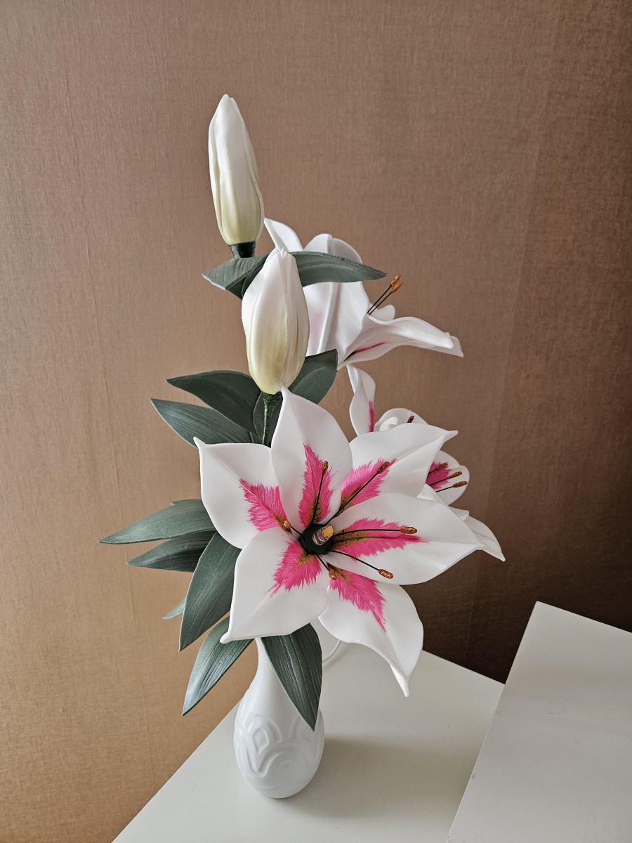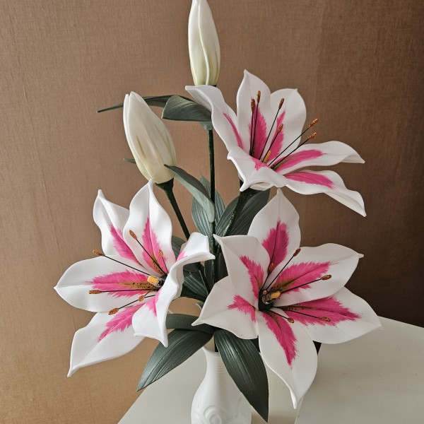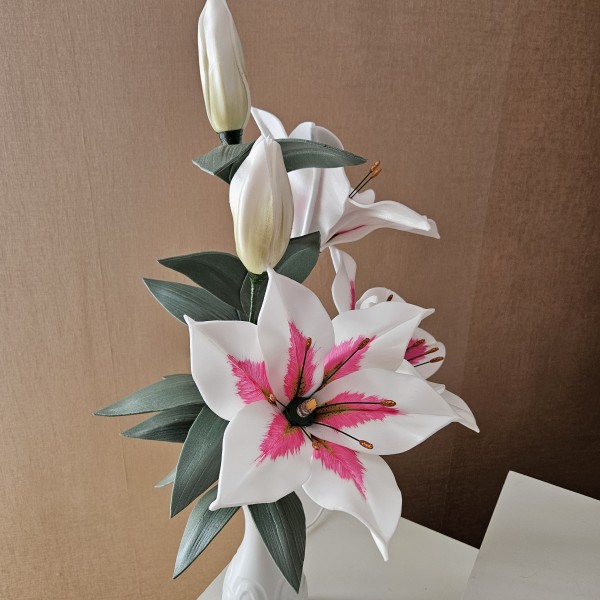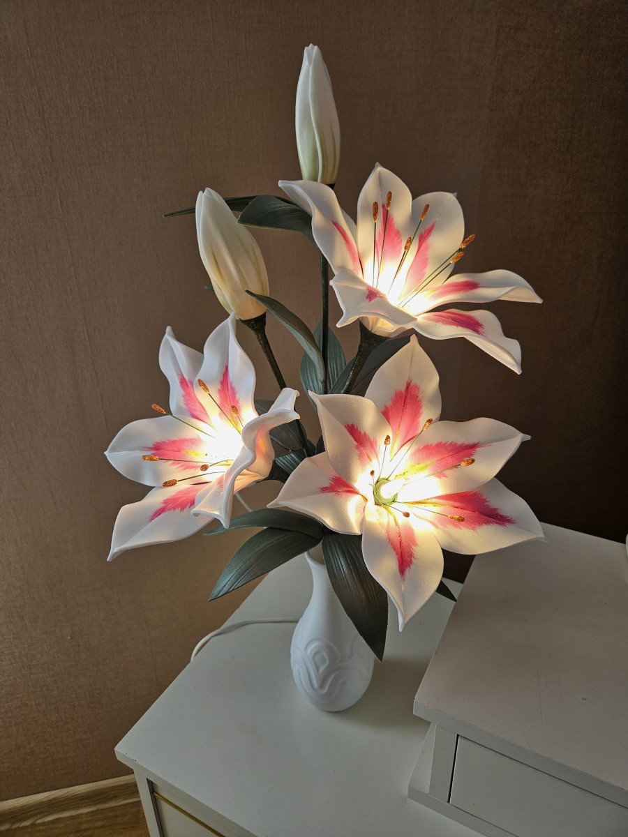Trīs atvērtie liliju ziedi ar pumpuriem uz viena kāta būs skaists interjera akcents uz galda, kumodes vai naktsskapīša, piešķirot telpai eleganci un piepildot to ar noskaņu veidojošu gaismu. Katrs zieds ir tonēts un rūpīgi veidots, lai panāktu dabiskuma efektu. Būs arī kā oriģināla un pārsteidzoša dāvana.