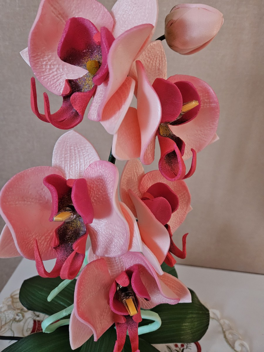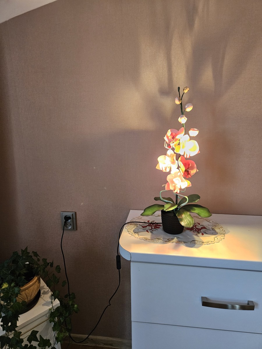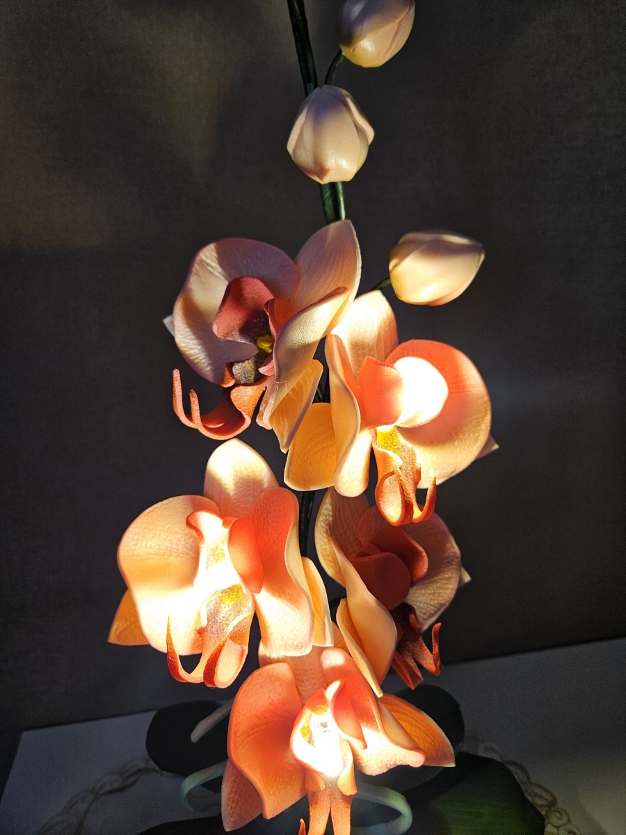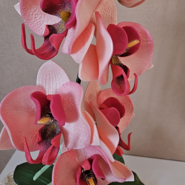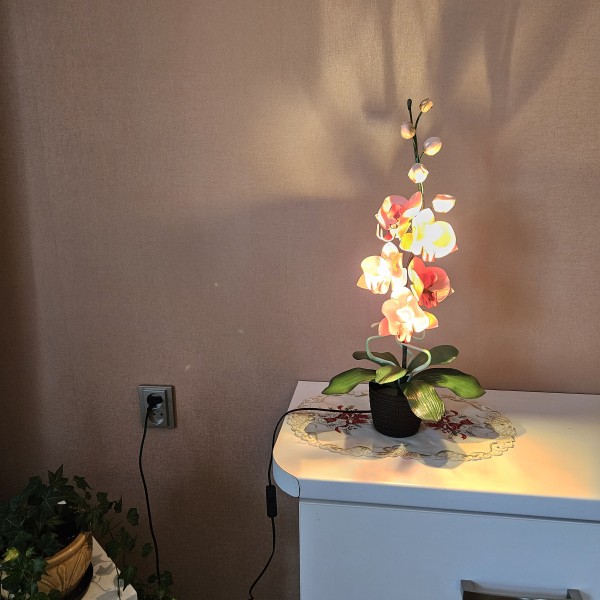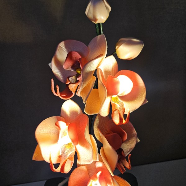 Šai rozīgajai orhidejai katrs zieds ir tonēts un rūpīgi veidots, lai atspoguļotu īsta zieda smalkumu un krāsu nianses. Siltais gaismas starojums un krāsu rotaļas radīs burvīgu akcentu un romantisku atmosfēru jebkurā telpā. Izslēgtā veidā tā kalpos kā košs, pamanāms un oriģināls interjera akcents, kas piesaista skatienu.