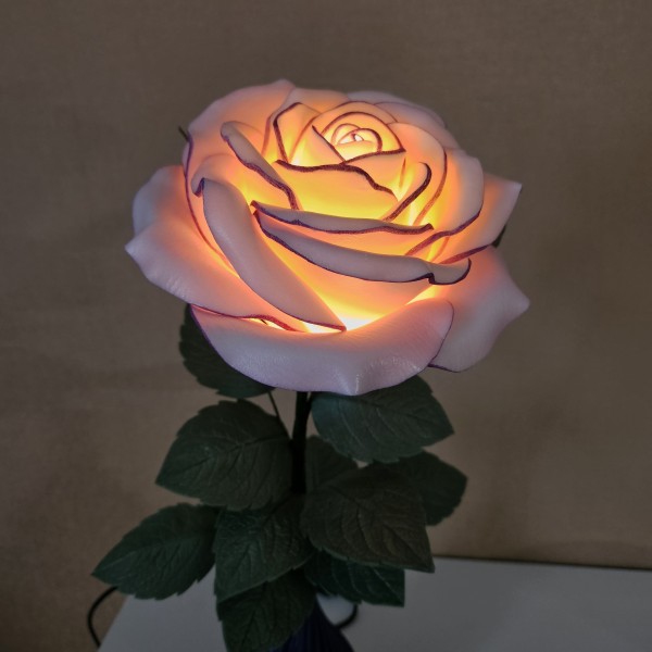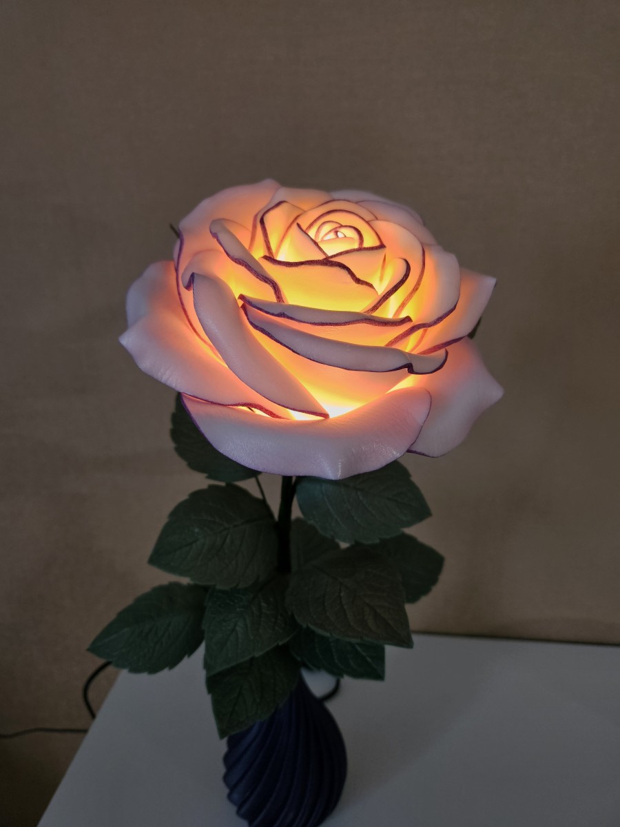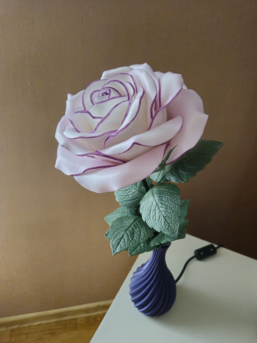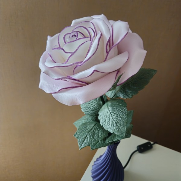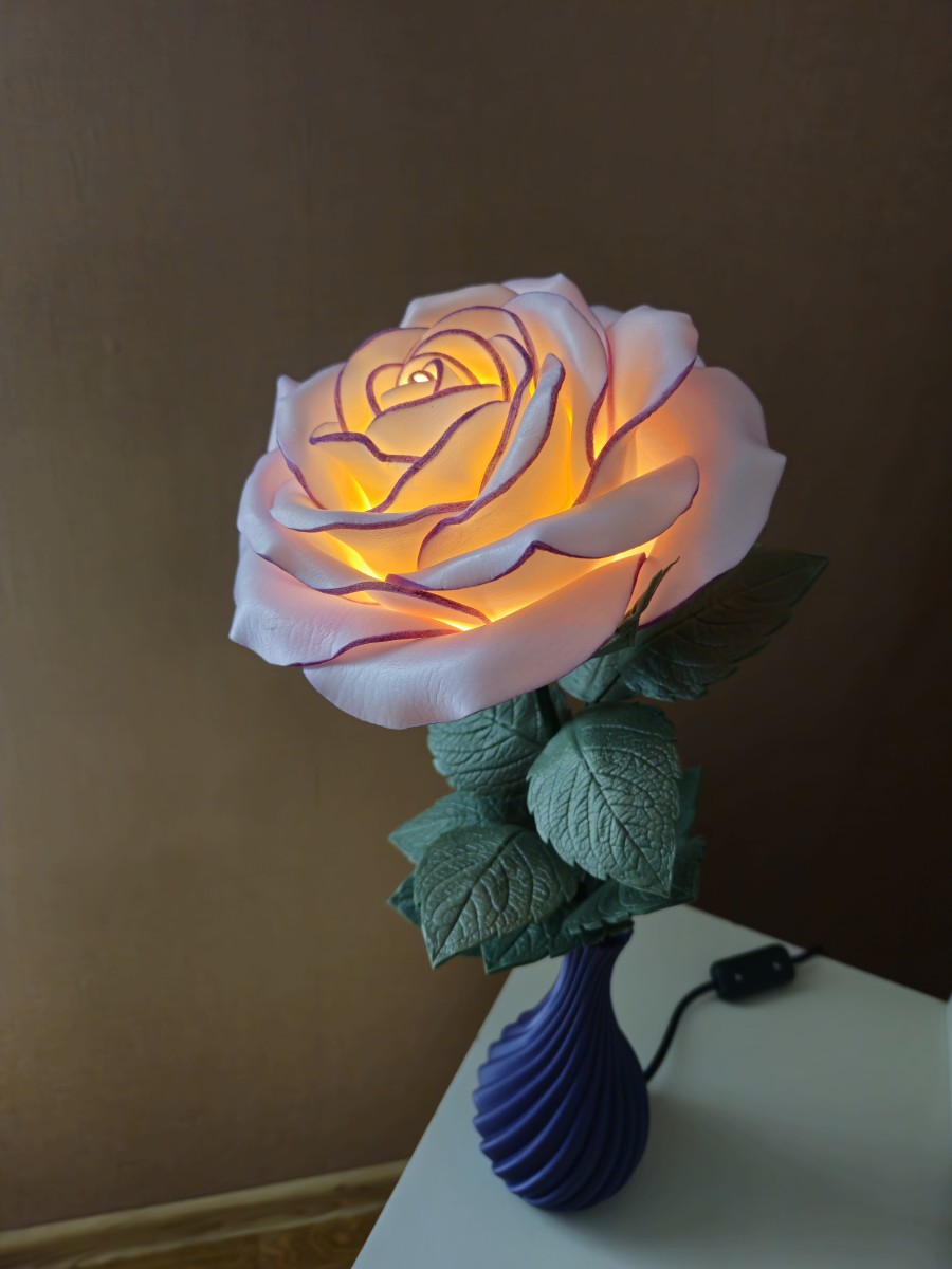 Šķiet neticami, ka šāda maza rozīte, novietota uz naktsskapīša vai kumodes, spētu radīt telpā siltu, mājīgu un romantisku noskaņu, bet tā tas tiešām ir! Arī neieslēgta tā kalpos kā košs un pamanāms interjera elements. Katra ziedlapiņa ar rokām veidota, maliņa krāsota, Būs piemērota arī kā mīļa dāvana īpašam cilvēkam.