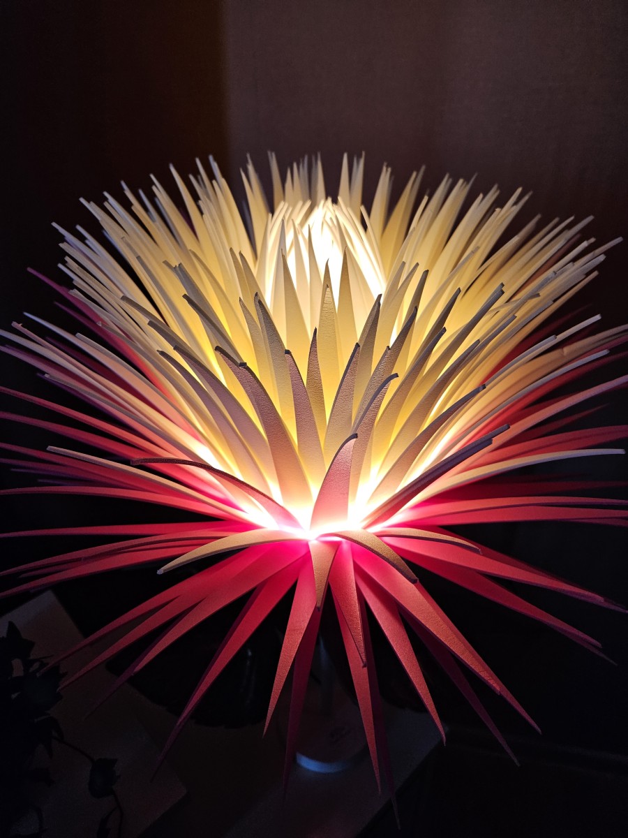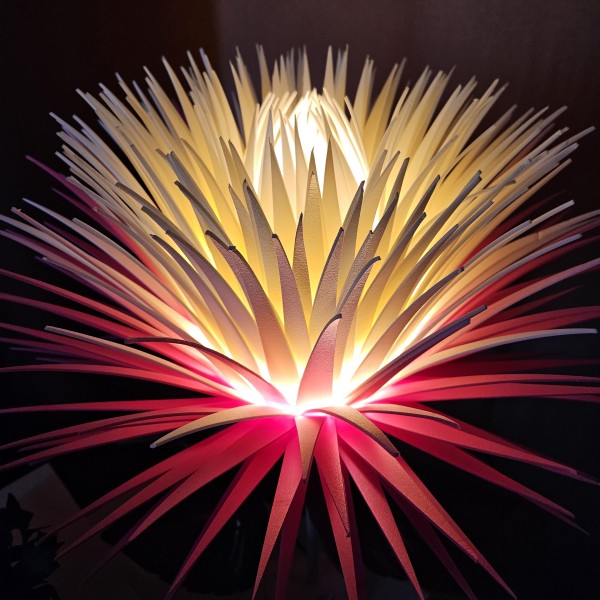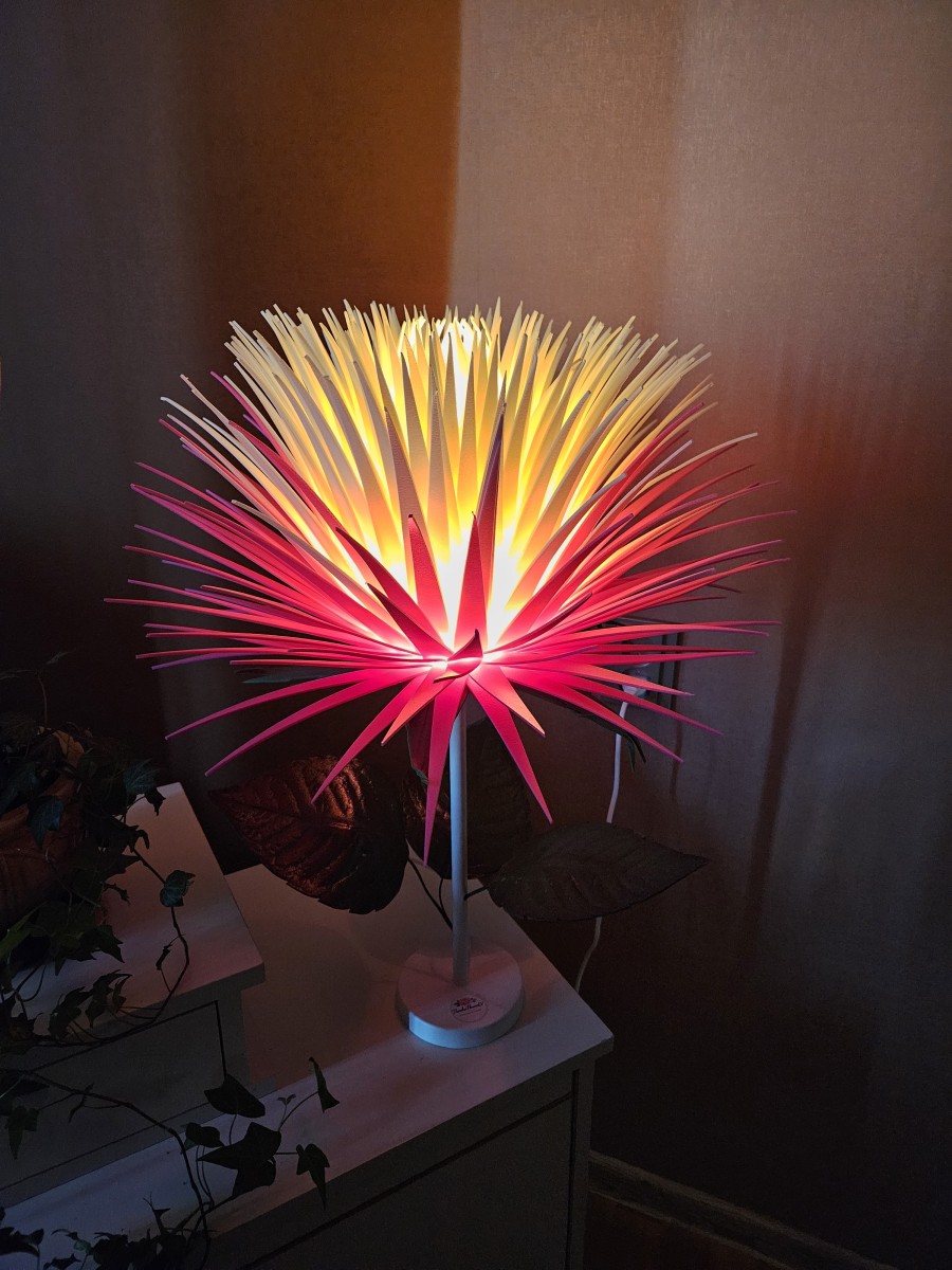 Mazliet noslēpumains, mazliet rotaļīgs- šis mazais “spociņš”patiesībā ir ļoti draudzīgs. Iedegoties lampiņai, tas telpā rada maigu, siltu gaismu un neviļus liek pasmaidīt ikvienam, kurš to uzlūko. Lampiņa ir veidota ar rūpību un fantāziju, piešķirot tai savu īpašo raksturu. Tā var lepoties arī ar tonētām, tumši zaļām lapiņām. Šāda lampiņa lieliski iederēsies guļamistabā, bērnu istabā, vai kā neparasts interjera akcents, kas vakarā piešķir telpai mājīgu un mazliet pasakainu noskaņu. Būs arī kā pārsteidzoša un oriģināla dāvana. “Spociņš” nav biedējošs- tas ir mazs gaismas sargs, kas klusiņām uzrauga vakara mieru.