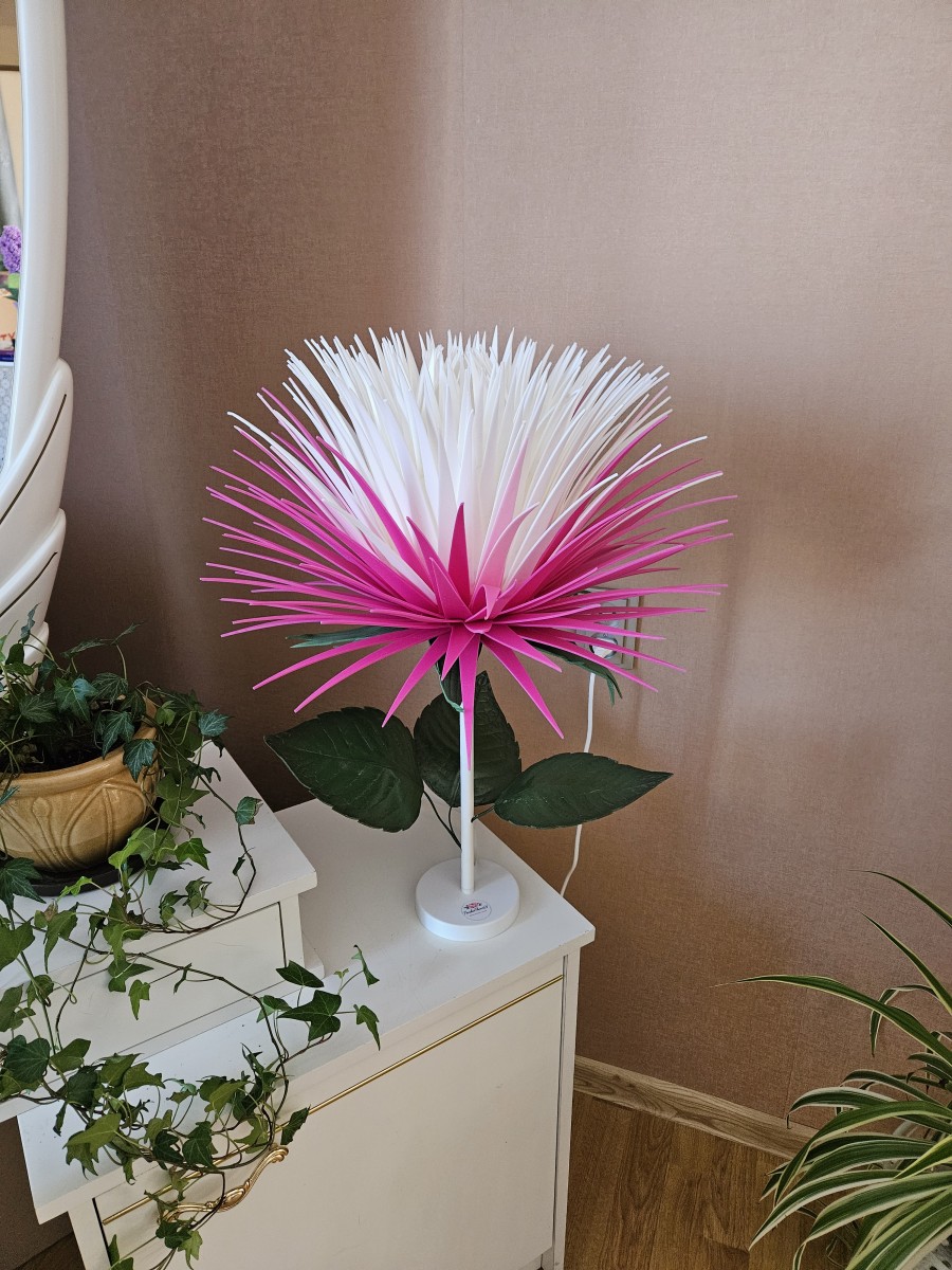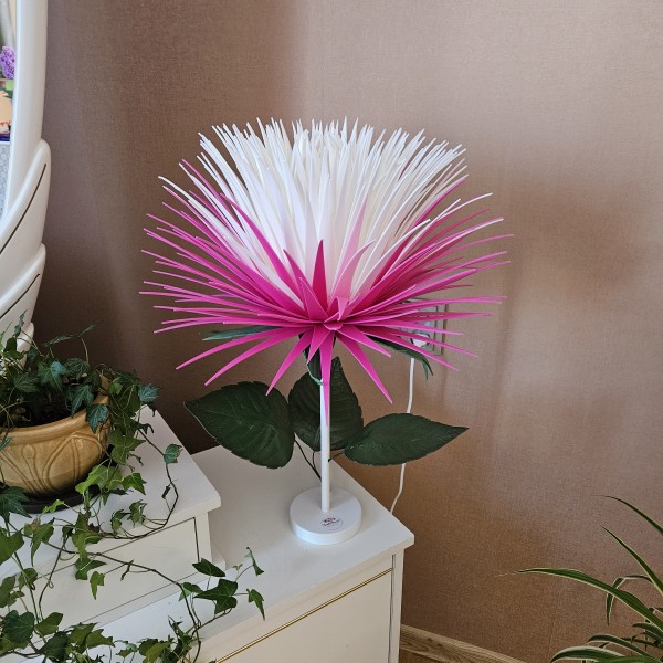 Lampiņa izgatavota no izolona, tās augstums ir 62 cm, zieda diametrs- 50 cm. Spuldzīte E14- 4,5W (“kukurūza”)