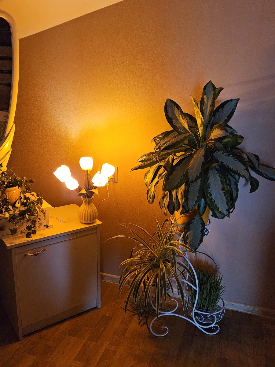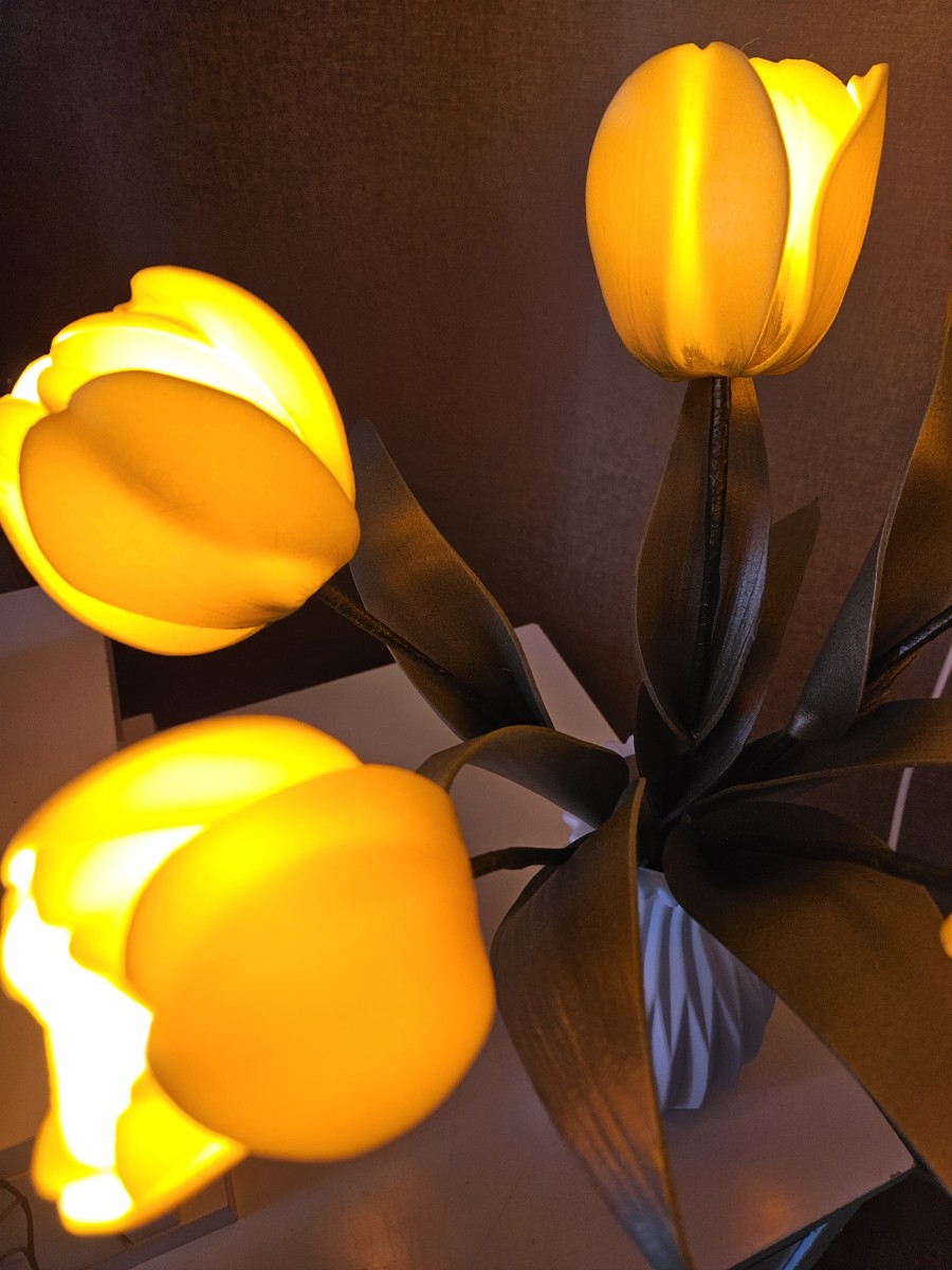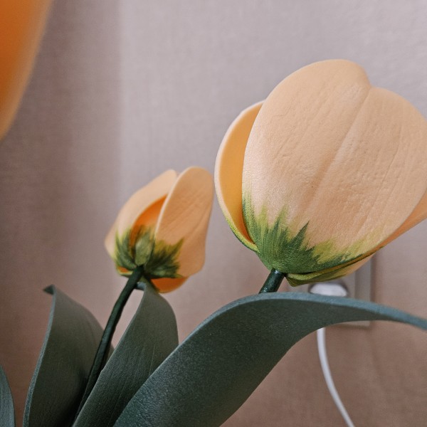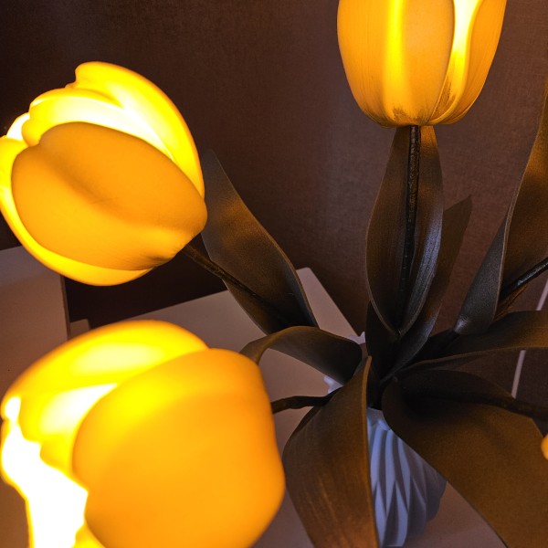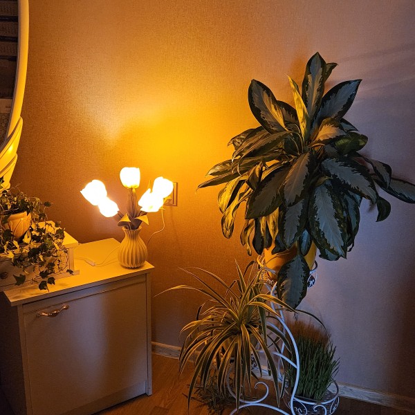 Dekoratīvā galda lampiņa ar 5 košajām tulpēm ir kā neliels pavasarīgs pušķis, kas ienes telpā svaigumu, krāsu un dzīvesprieku. Iedegoties lampiņām, tās izstaro maigu, siltu gaismu, radot īpaši mājīgu atmosfēru vakarā. Šī lampiņa ir ne tikai gaismas avots, bet arī skaists interjera akcents, kas piesaista skatienu un piešķir telpai dzīvīgumu.