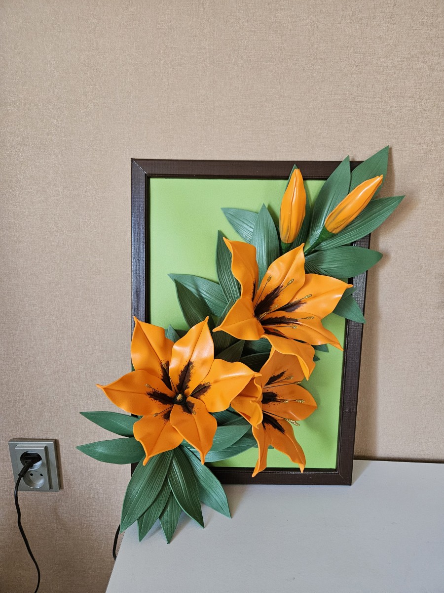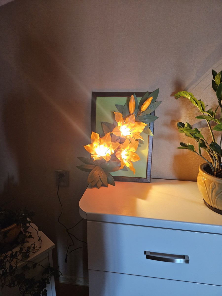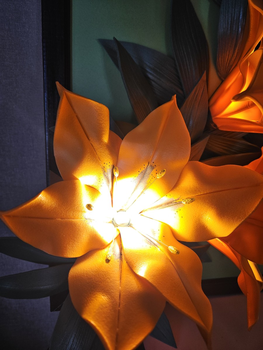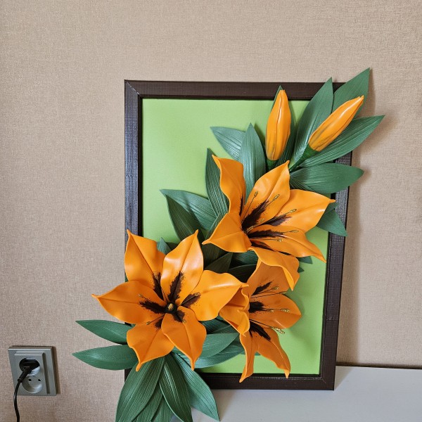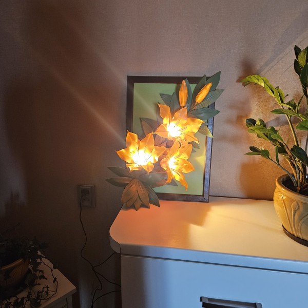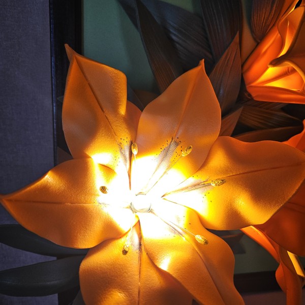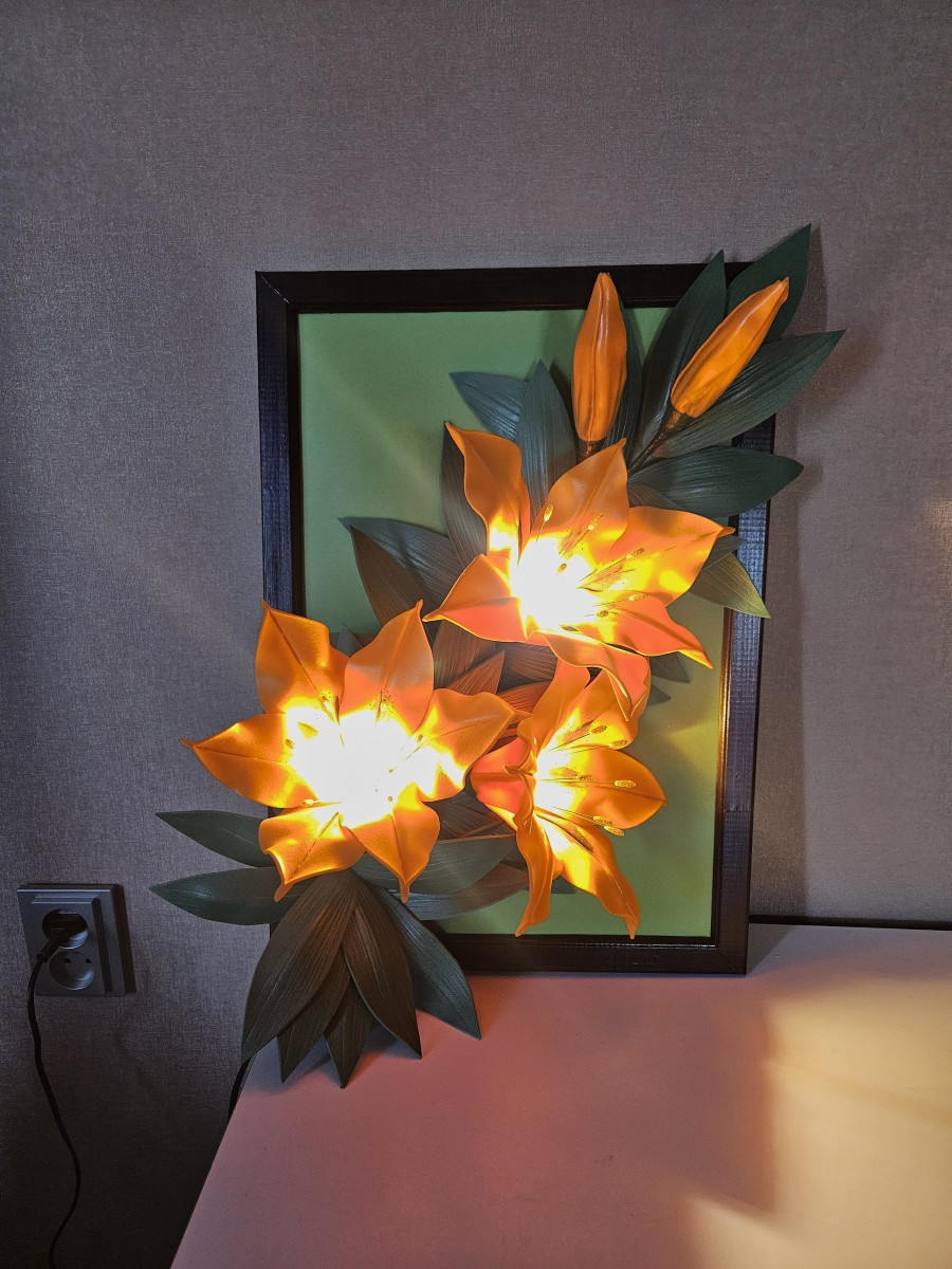 Oriģināls sienas dekors ar apgaismojumu, kas apvieno ziedu eleganci ar mūsdienīgu un efektīgu interjera elementu. Katrs zieds ir individuāli izstrādāts, saglabājot dabisku krāsu, formu un plastiku. Šis darbs ir vairāk nekā dekorācija- tas ir spilgts interjera akcents ar raksturu.