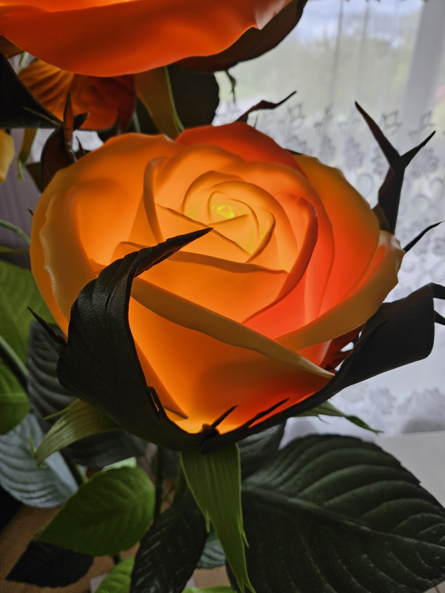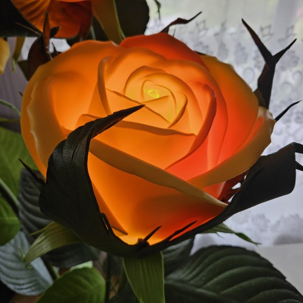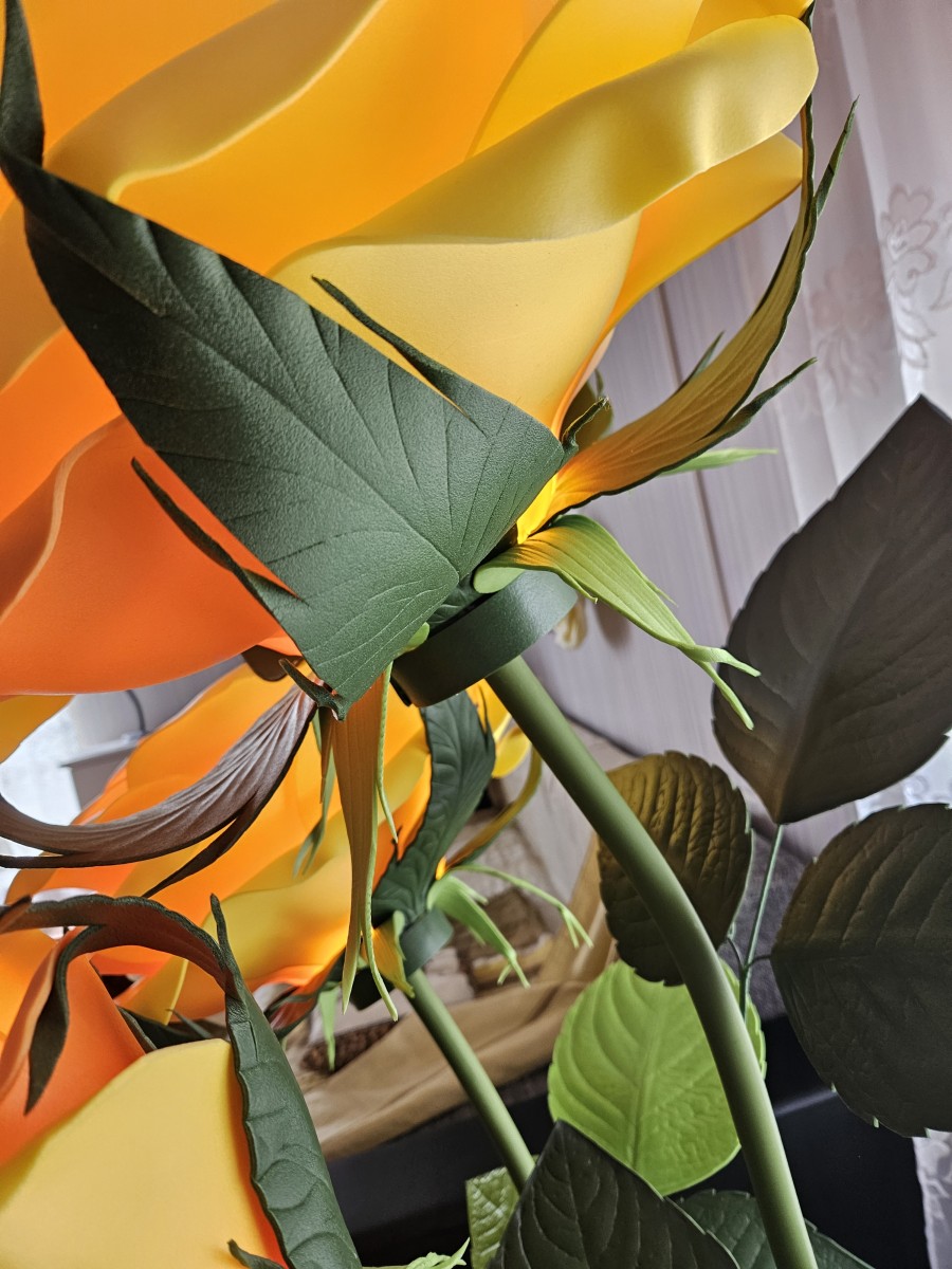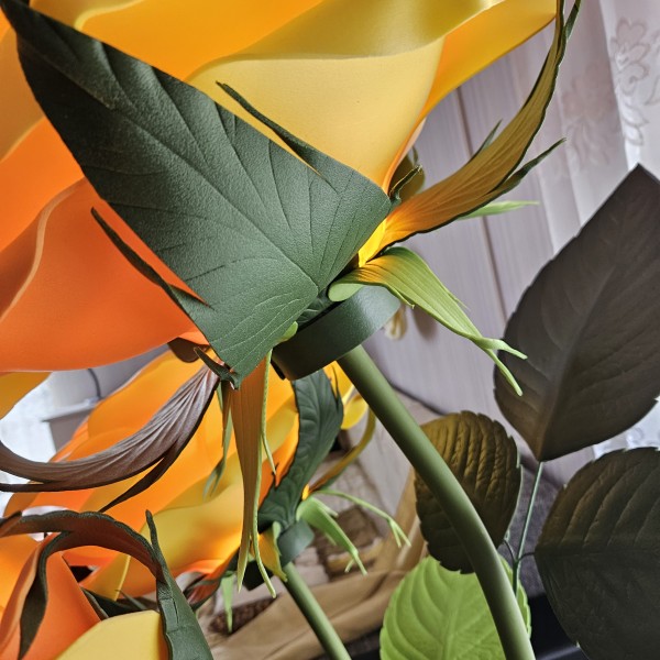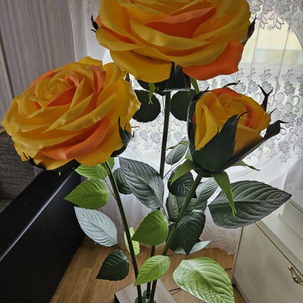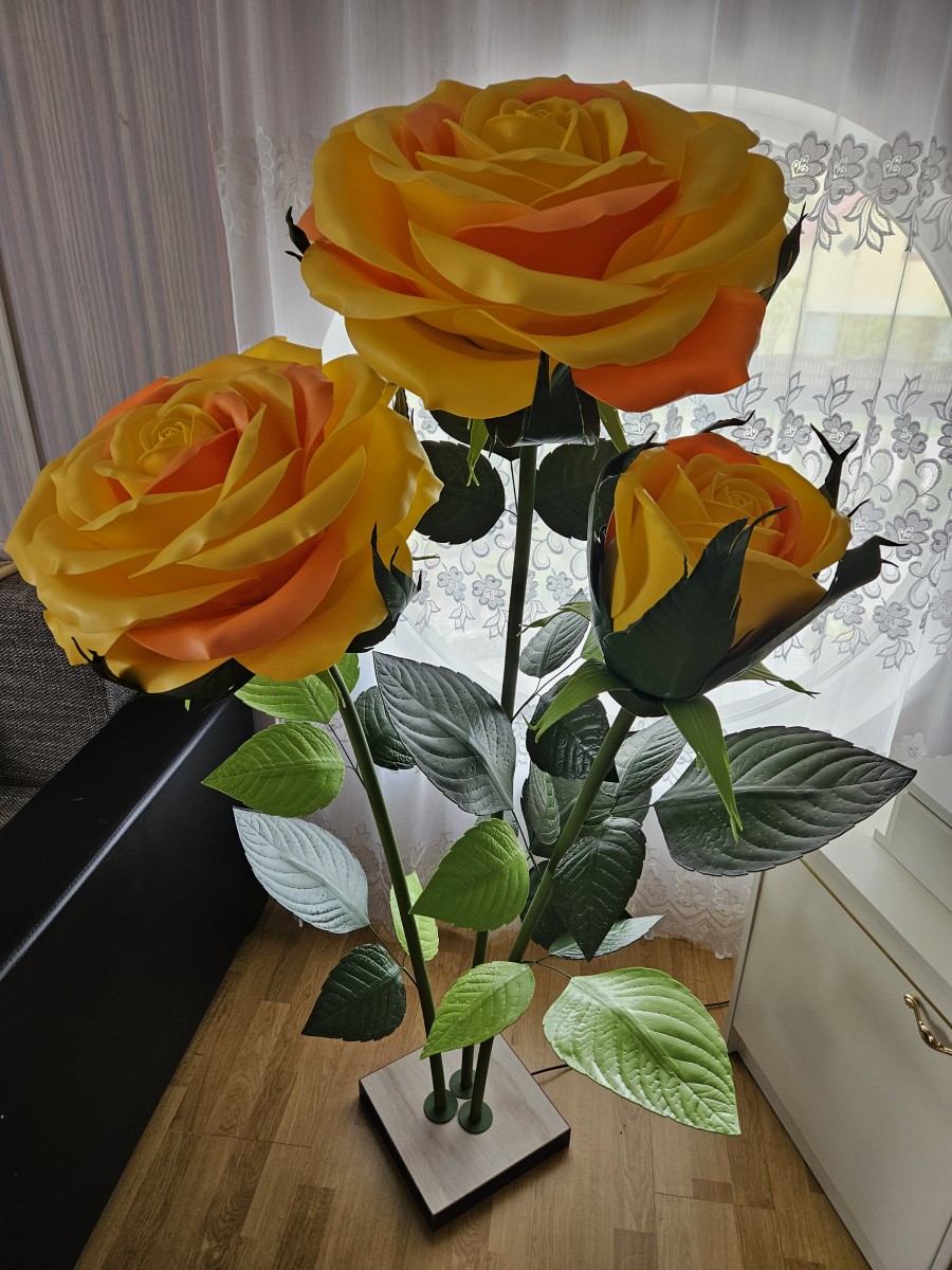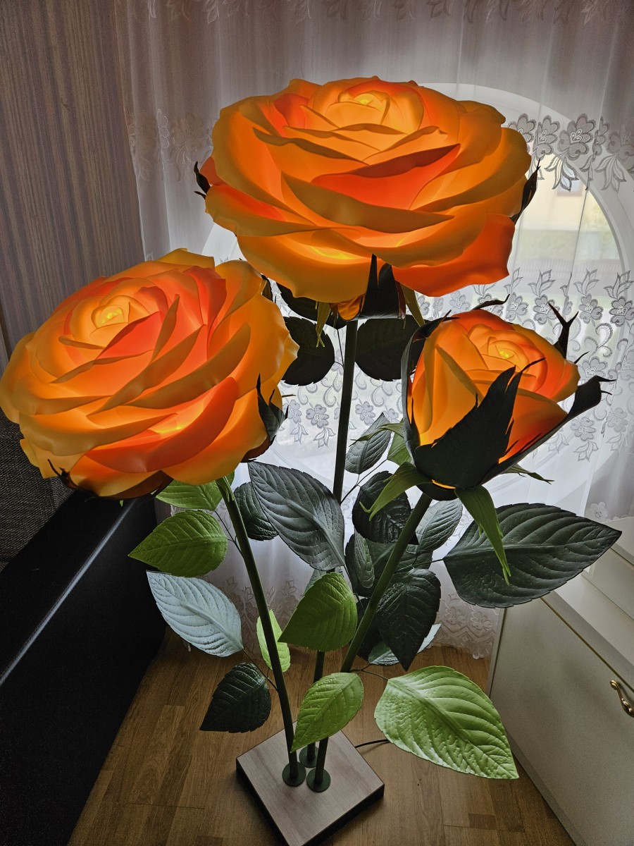 Iespaidīga stāvlampa ar diviem izplaukušiem dzelteni oranžīgiem ziediem un pumpuru - izteiksmīgs un dekoratīvs interjera akcents. Katrs zieds veidots individuāli, rūpīgi izstrādājot ziedlapu formu un kompozīciju. Lampa rada maigu, siltu gaismu un kļūst par telpas centrālo elementu. Šī lampa apvieno funkcionalitāti ar māksliniecisku izteiksmi- piemērota tiem, kas vēlas interjerā ko patiesi īpašu un neatkārtojamu.