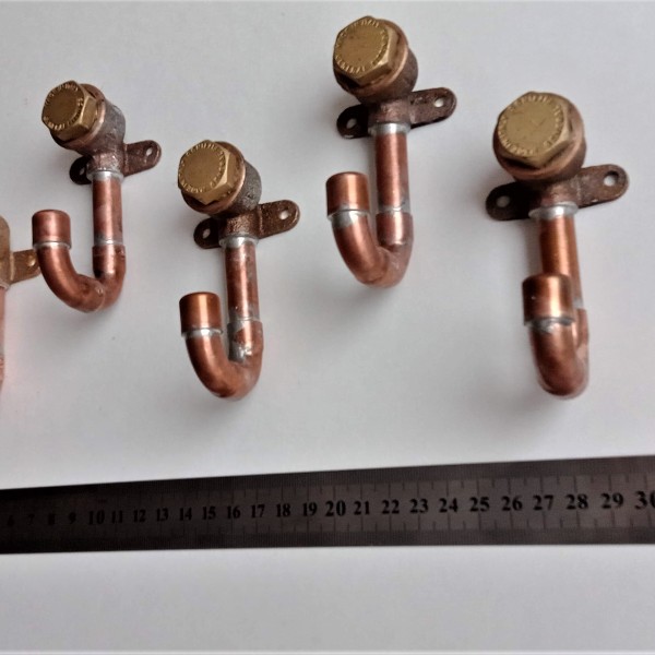 Pieci, pamatīgi no 12 mm kapara caurules izveidoti pakaramie. Varat tos pieskrūvēt pie kāda glīta dēļa, kas Jums patīk, vai arī tieši pie sienas. Lieliski saderēsies ar šobrīd aktuālajiem virtuves un vannas istabas maisītājiem kapara, bronzas un melnā krāsā.