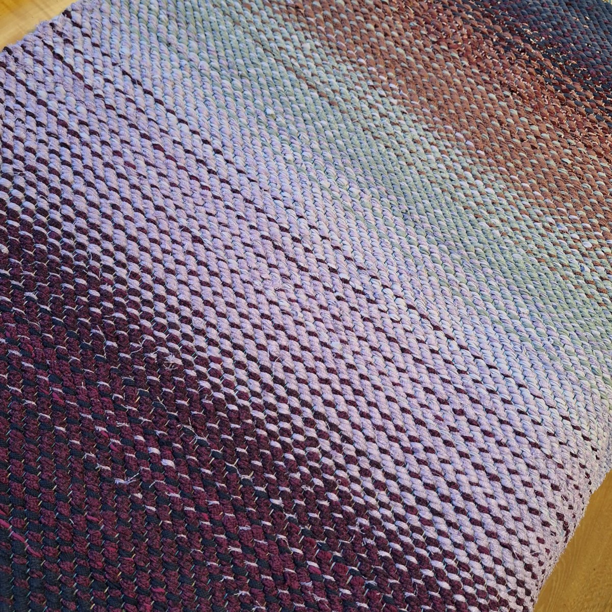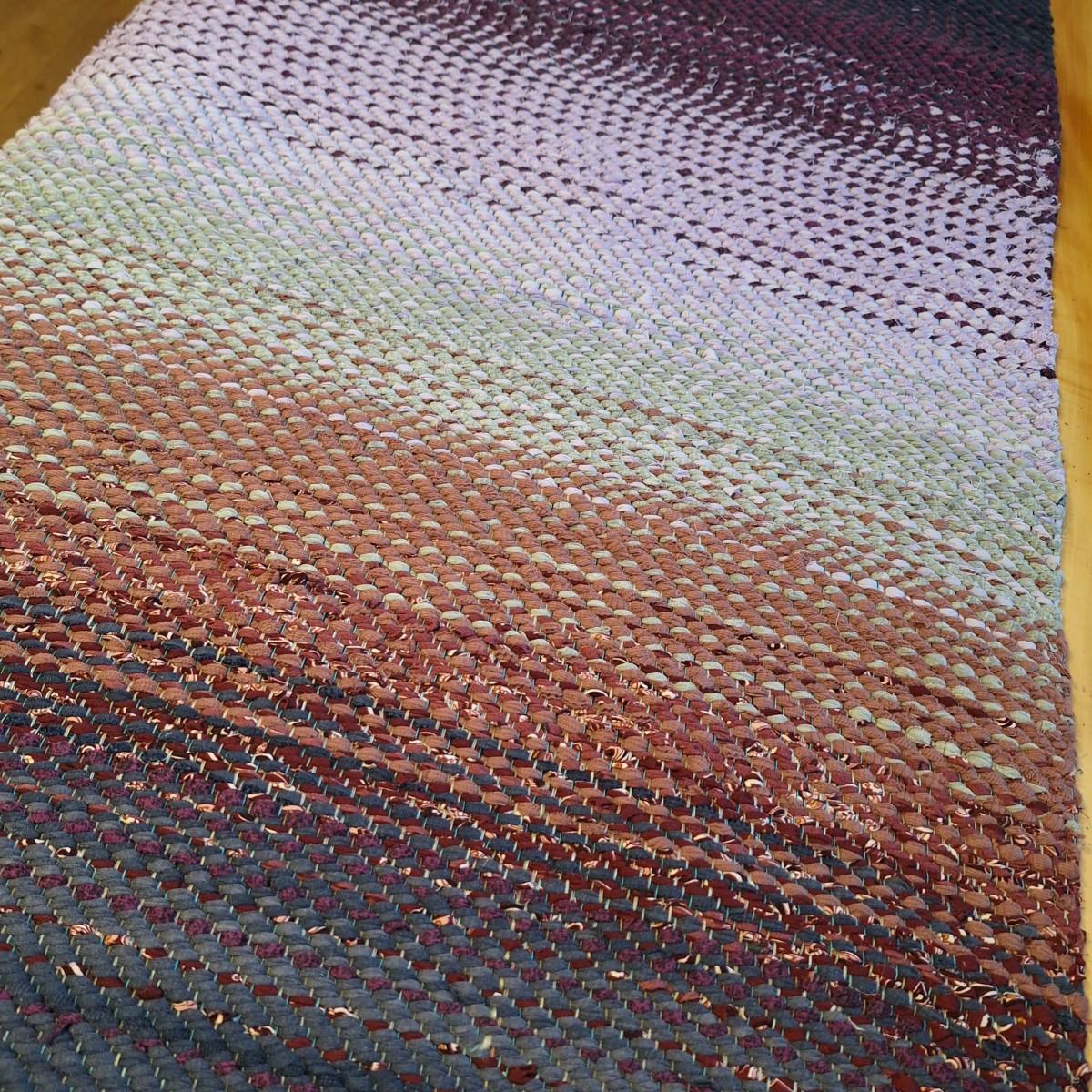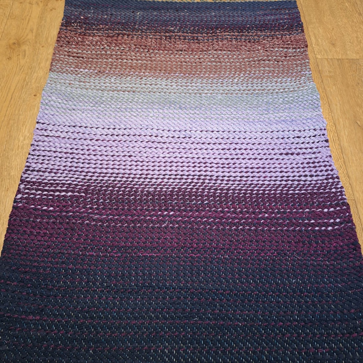 No pārstrādāta tekstila kokvilnas-linu velkos austs paklājs- grīdas celiņš ceriņaini brūnganu toņu pārejās. Māksliniecisks un praktisks akcents jūsu mājās. 0.66m x 0.94m. Praktisks #lupatu_paklajs #grīdas-celiņš #austs-grīdceliņš . Iespējams nosūtīt ar omnivu vai pēc vienošanās.