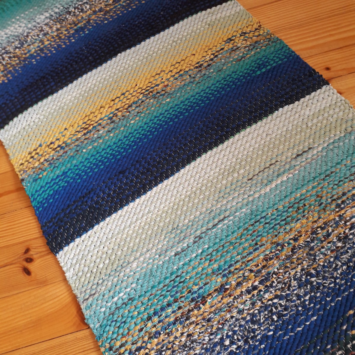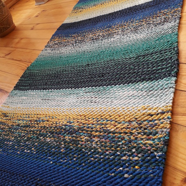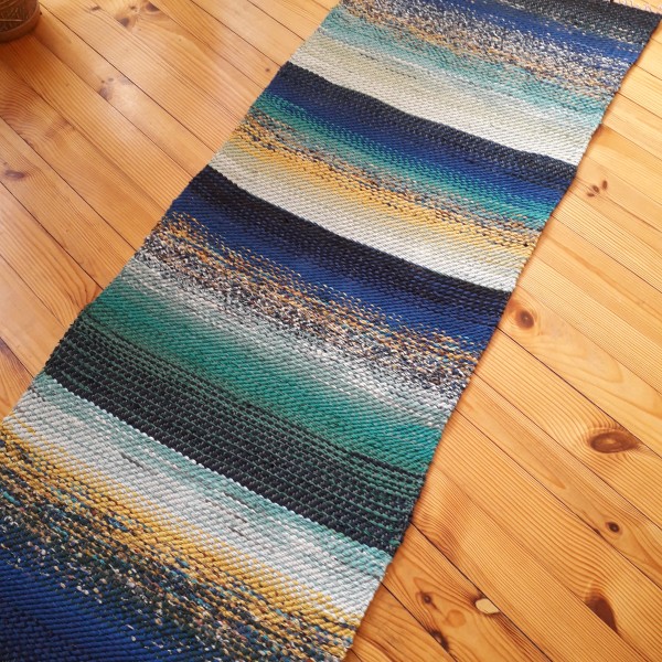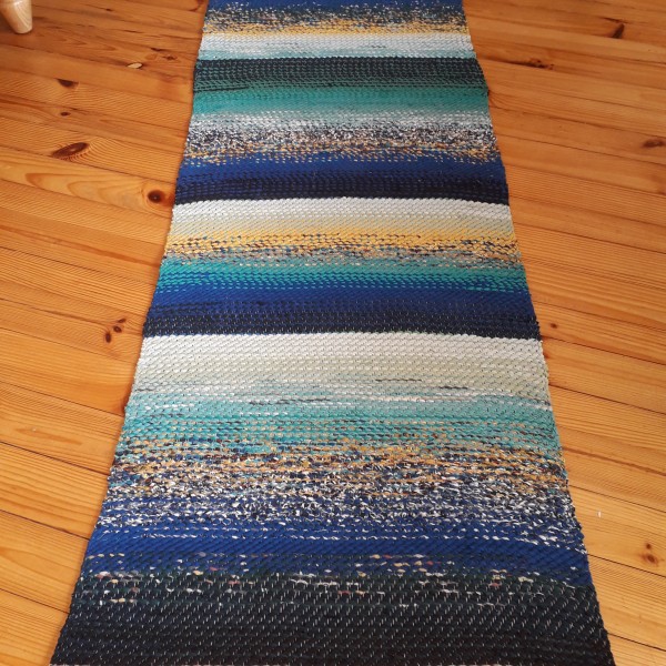 No pārstrādāta tekstila kokvilnas-linu velkos austi paklājs- grīdas celiņš jūrmalas toņos. 1.65 x 0.61m. Cena 46 eiro. Praktisks #lupatu_paklājs #grīdas-celiņš. Iespējams nosūtīt ar omnivu vai pēc vienošanās.