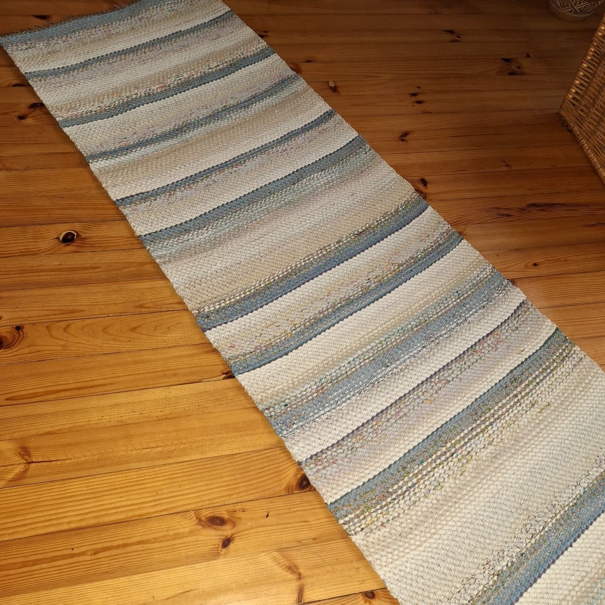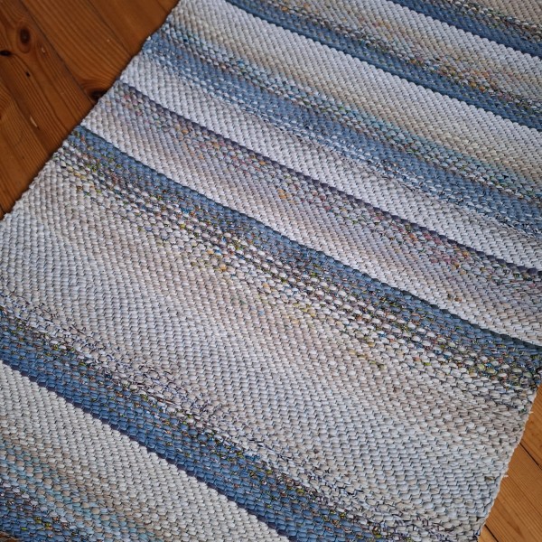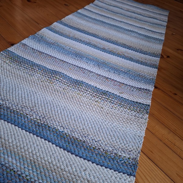 No pārstrādāta tekstila kokvilnas-linu velkos austs paklājs- grīdas celiņš balti bēšīgās toņu pārejās. Māksliniecisks un praktisks akcents jūsu mājās. 0.66m x 1.98m. Praktisks #lupatu_paklajs #grīdas-celiņš. Iespējams nosūtīt ar omnivu vai pēc vienošanās.
