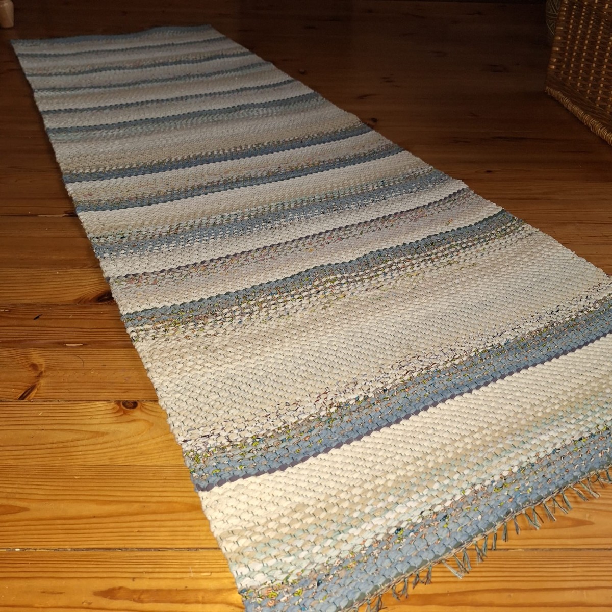No pārstrādāta tekstila kokvilnas-linu velkos austs paklājs- grīdas celiņš balti bēšīgās toņu pārejās. Māksliniecisks un praktisks akcents jūsu mājās. 0.66m x 1.98m. Praktisks #lupatu_paklajs #grīdas-celiņš. Iespējams nosūtīt ar omnivu vai pēc vienošanās.