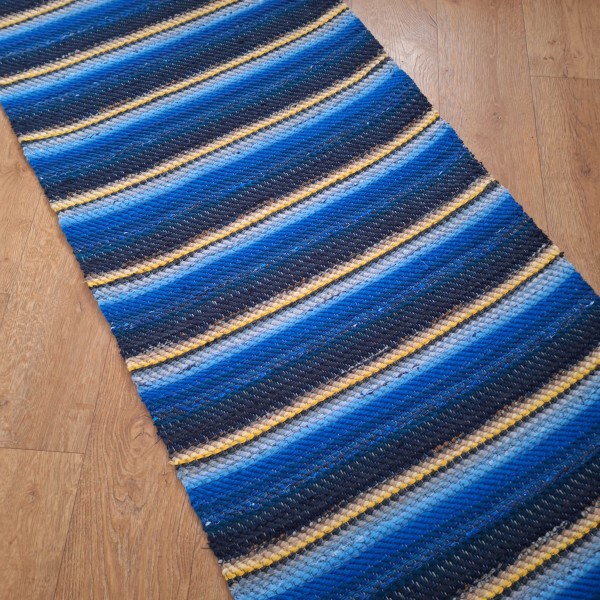 No pārstrādāta tekstila kokvilnas-linu velkos austs garš grīdas celiņš zilo jūras un dzintariņu toņu pārejās- praktisks akcents jūsu mājās. 3.20m x 0.66m. #lupatu_paklajs #grīdas-celiņš #austs_lupatu_grīdceliņš Iespējams nosūtīt ar omnivu vai pēc vienošanās.