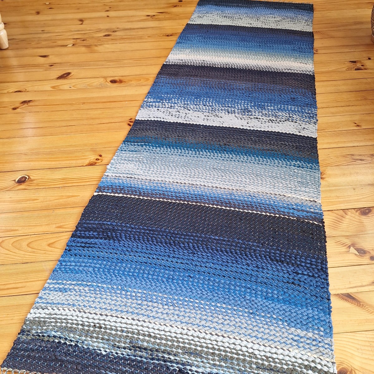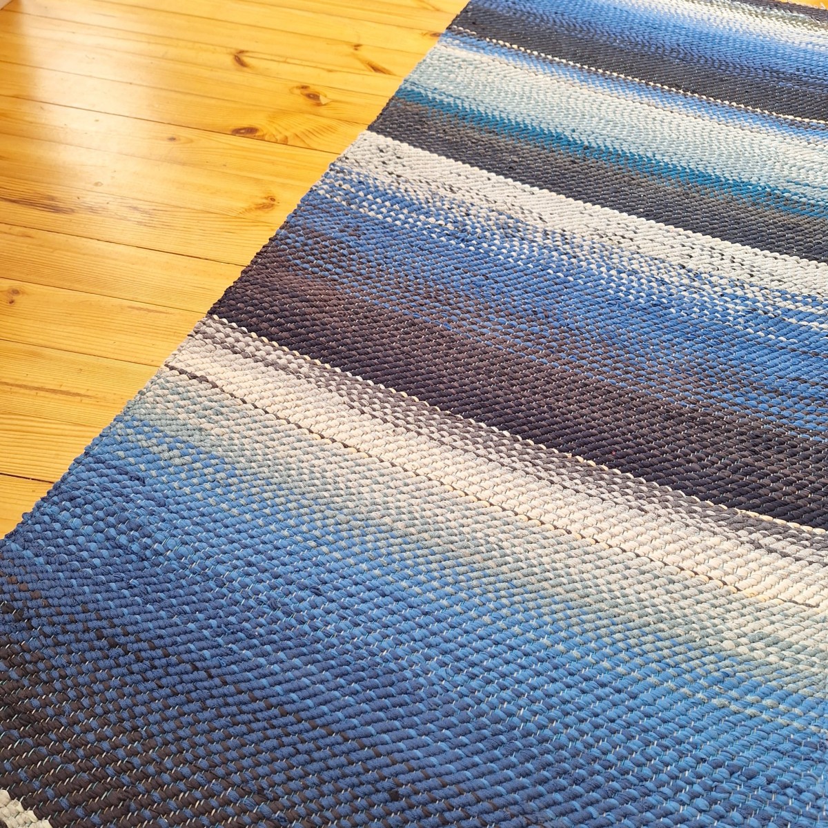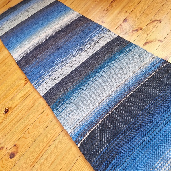 No pārstrādāta tekstila kokvilnas-linu velkos austs paklājs- grīdas celiņš jūras zilgano toņu pārejās. Māksliniecisks un praktisks akcents jūsu mājās. 0.66m x 2.15m. Praktisks #lupatu_paklajs #grīdas-celiņš #austs-grīdceliņš . Iespējams nosūtīt ar omnivu vai pēc vienošanās.
