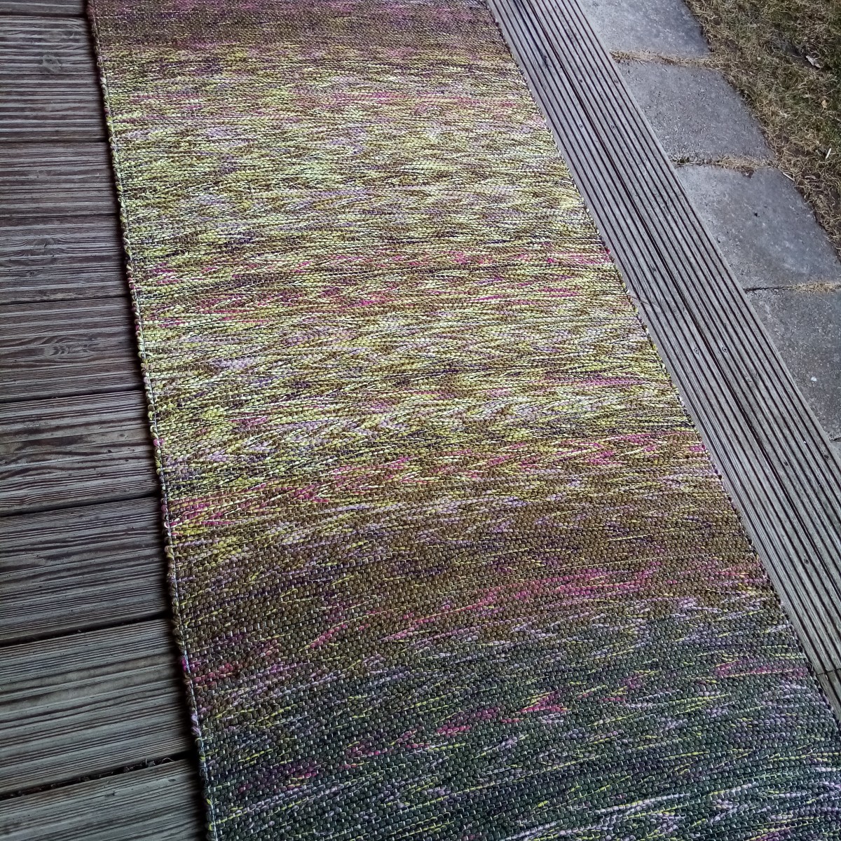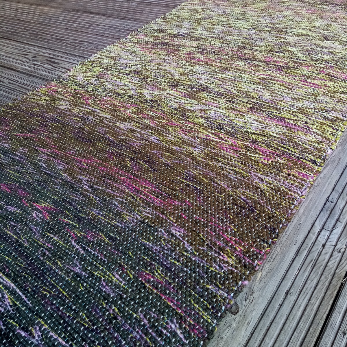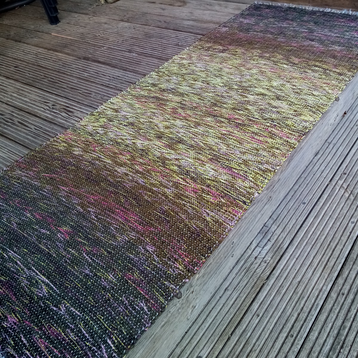 Krāsu pārejās austs grīdas celiņš ar batiku veidos dabas gleznu Jūsu interjerā. Diegu materiāli otrreiz pārstrādāti, tāpēc nemainīs formu un krāsu, saudzīgi mazgājot. Izmērs : 1,98 m x 0,73 m.