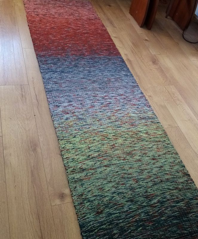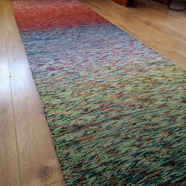 Krāsu pārejās austs grīdas celiņš veidos dabas gleznu Jūsu interjerā. Diegu materiāli otrreiz pārstrādāti, tāpēc nemainīs formu un krāsu, saudzīgi mazgājot. Izmērs : 2,73 m x 0,73 m.
