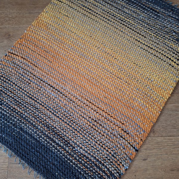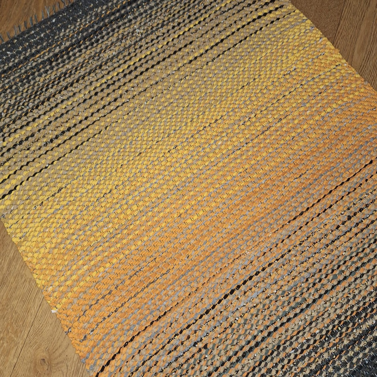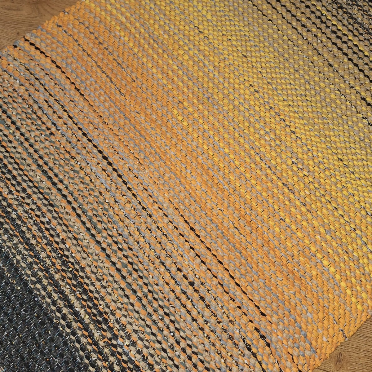 No pārstrādāta tekstila kokvilnas-linu velkos austs paklājs- grīdas dzelteni oranžīgo toņu pārejās. Māksliniecisks un praktisks akcents jūsu mājās. Praktisks #lupatu_paklajs #grīdas-celiņš. Iespējams nosūtīt ar omnivu vai pēc vienošanās.