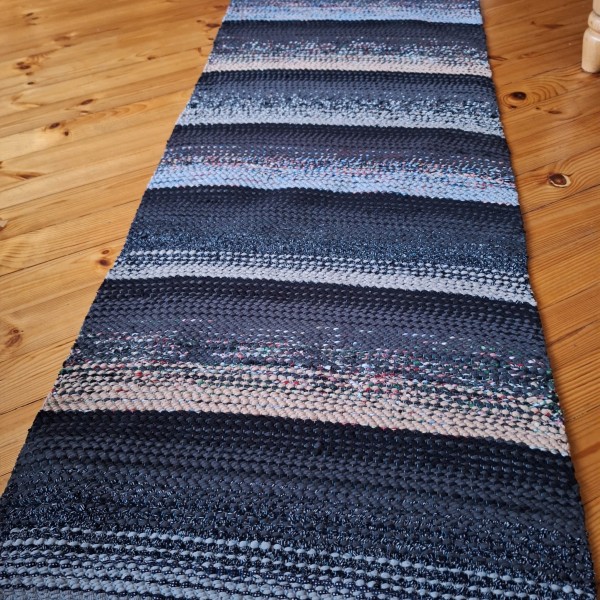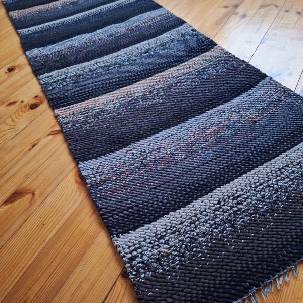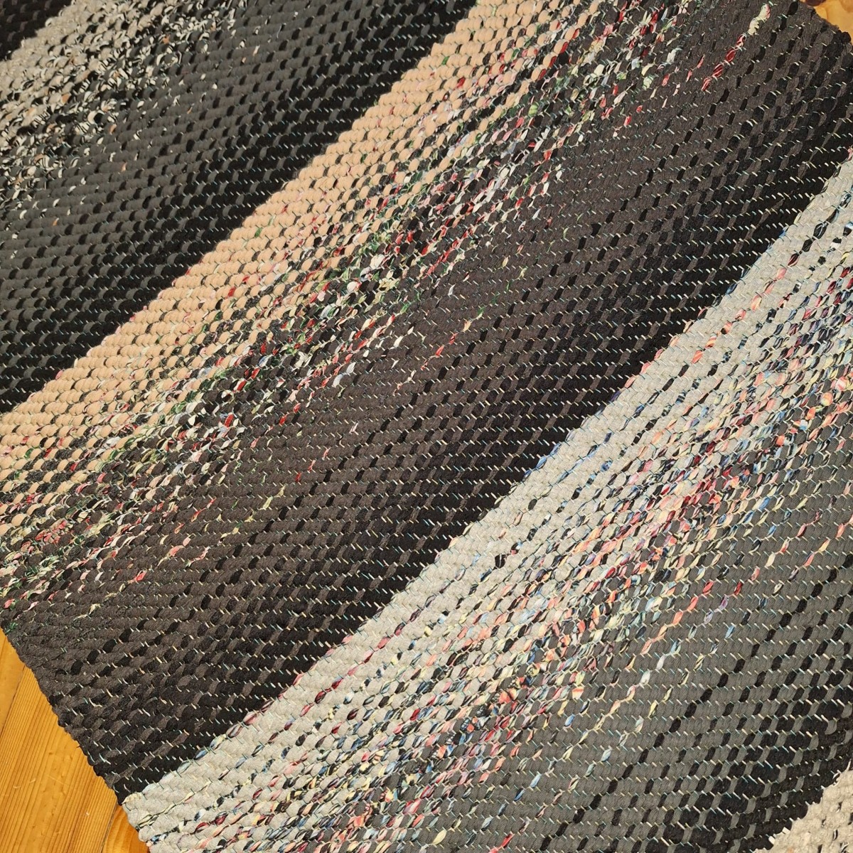 No pārstrādāta tekstila kokvilnas-linu velkos austs paklājs- grīdas celiņš melnraibās toņu pārejās. Māksliniecisks un praktisks akcents jūsu mājās. Divi foto ar zibspuldzi, divi- bez. Patiesie toņi kaut kur pa vidu, bet zilgans tur noteikti nav. Praktisks #lupatu_paklajs #grīdas-celiņš. Iespējams nosūtīt ar omnivu vai pēc vienošanās.