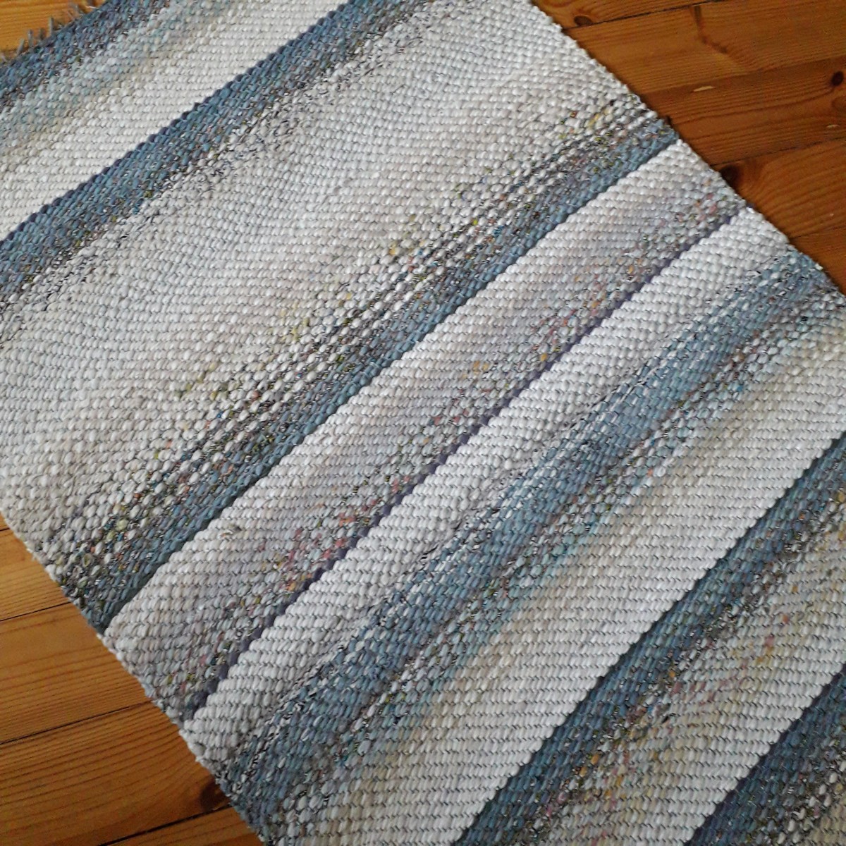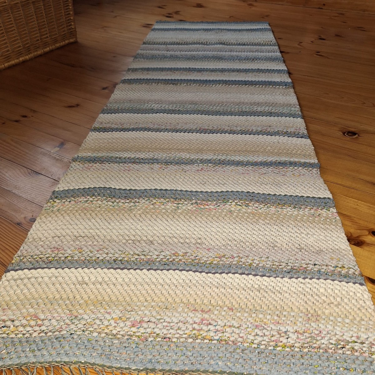 No pārstrādāta tekstila kokvilnas-linu velkos austs paklājs- grīdas celiņš balti bēšīgās toņu pārejās. Māksliniecisks un praktisks akcents jūsu mājās. Divi foto ar zibspuldzi, divi- bez. Patiesie toņi kaut kur pa vidu. Praktisks #lupatu_paklajs #grīdas-celiņš. Iespējams nosūtīt ar omnivu vai pēc vienošanās.