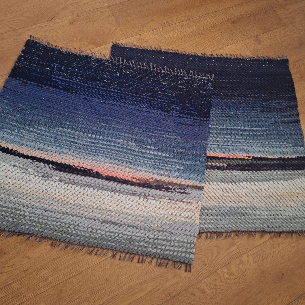 No pārstrādāta tekstila kokvilnas-linu velkos austi mazi paklājiņi kā nelielas ainavas ar ziemas debesīm.0.63 x 0.68 un 0.61x 0.68m. Cena 20 eiro par vienu. Neparastas un praktiskas dāvaniņas. Praktisks #lupatu_paklājs #grīdas-celiņš. Iespējams nosūtīt ar omnivu vai pēc vienošanās.