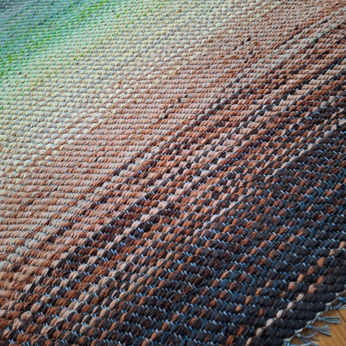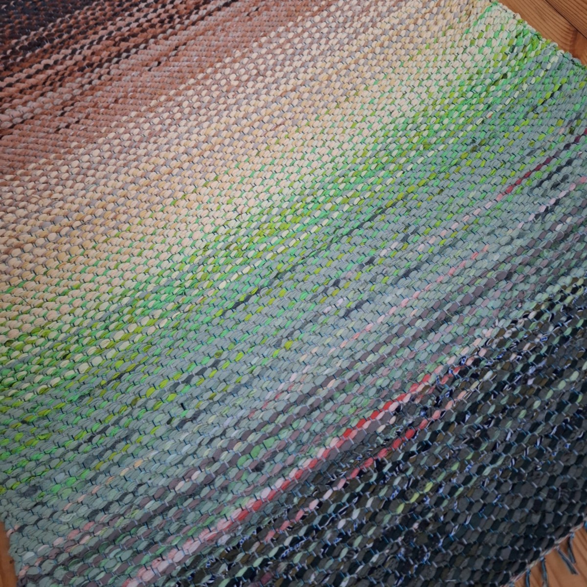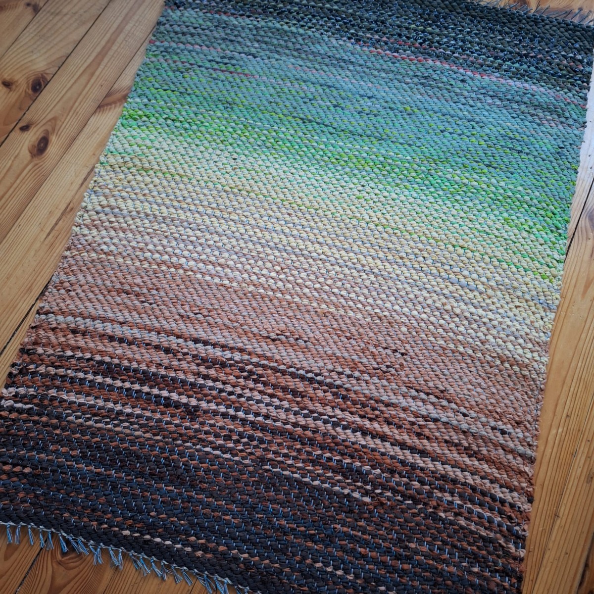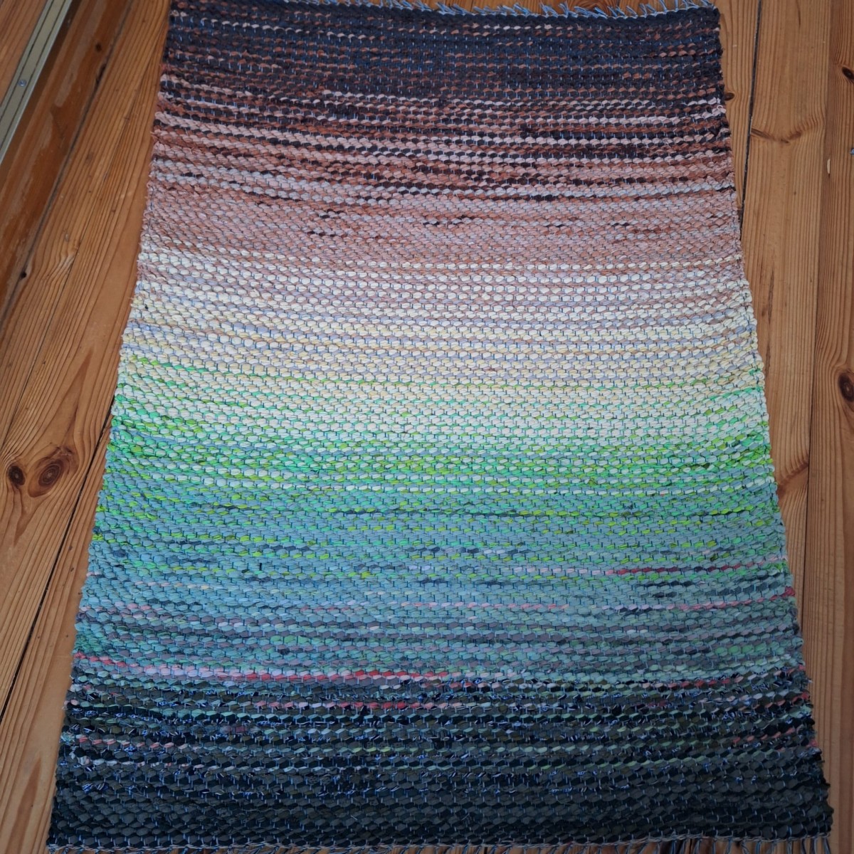 No pārstrādāta tekstila kokvilnas-linu velkos austs neliels paklājiņš kā neliela ainava dabas toņu pārejās. 0.90x 0.65m. Cena 27 eiro. Neparasta un praktiska dāvana. Praktisks #lupatu_paklājs #grīdas-celiņš. Iespējams nosūtīt ar omnivu vai pēc vienošanās.