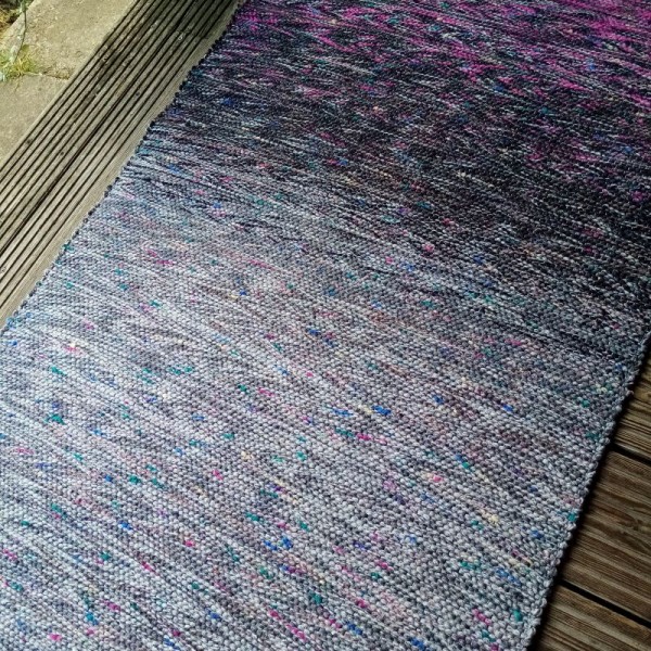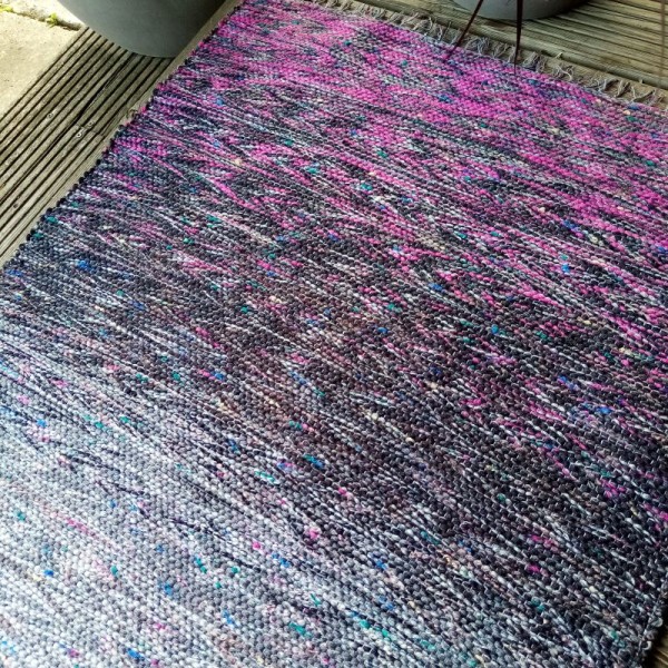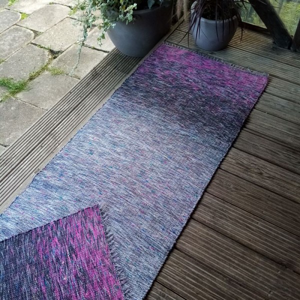 Pelēcīgs grīdas celiņš ar violetiem galiem no otrreiz pārstrādātiem diegiem kokvilnas velkos. #grīdceliņi #austi_grīdas_celiņi #roku_darbs #mājas_tekstils #lupatiņu_paklāji #zero_waste #dizaina_paklāji #otrreizējie_materiali