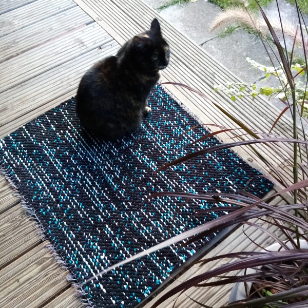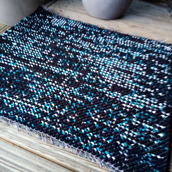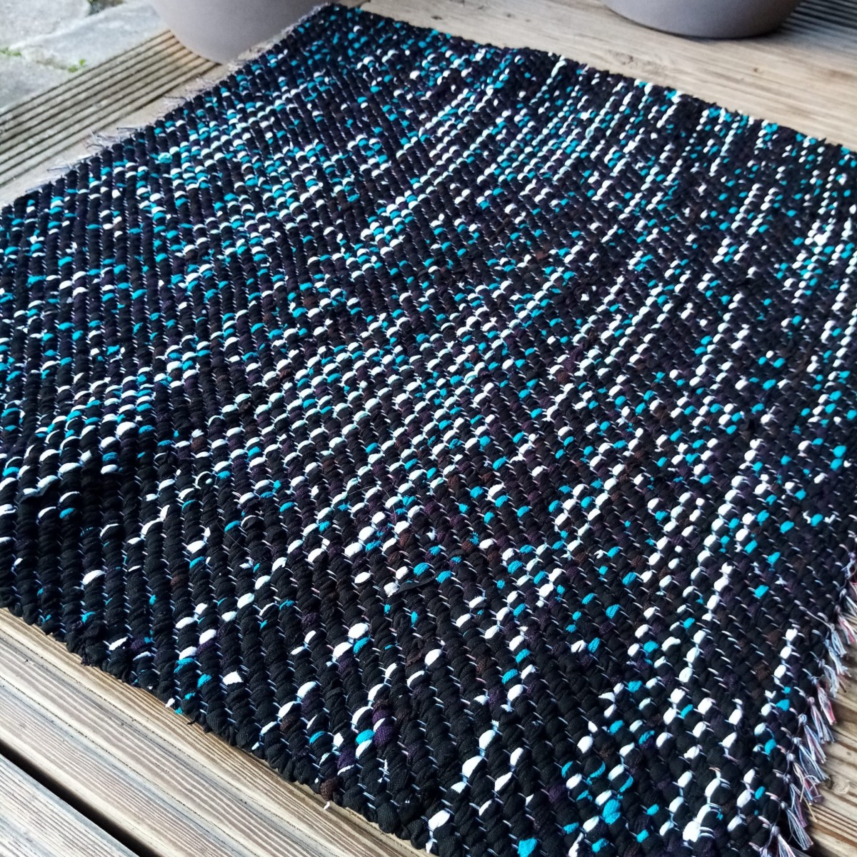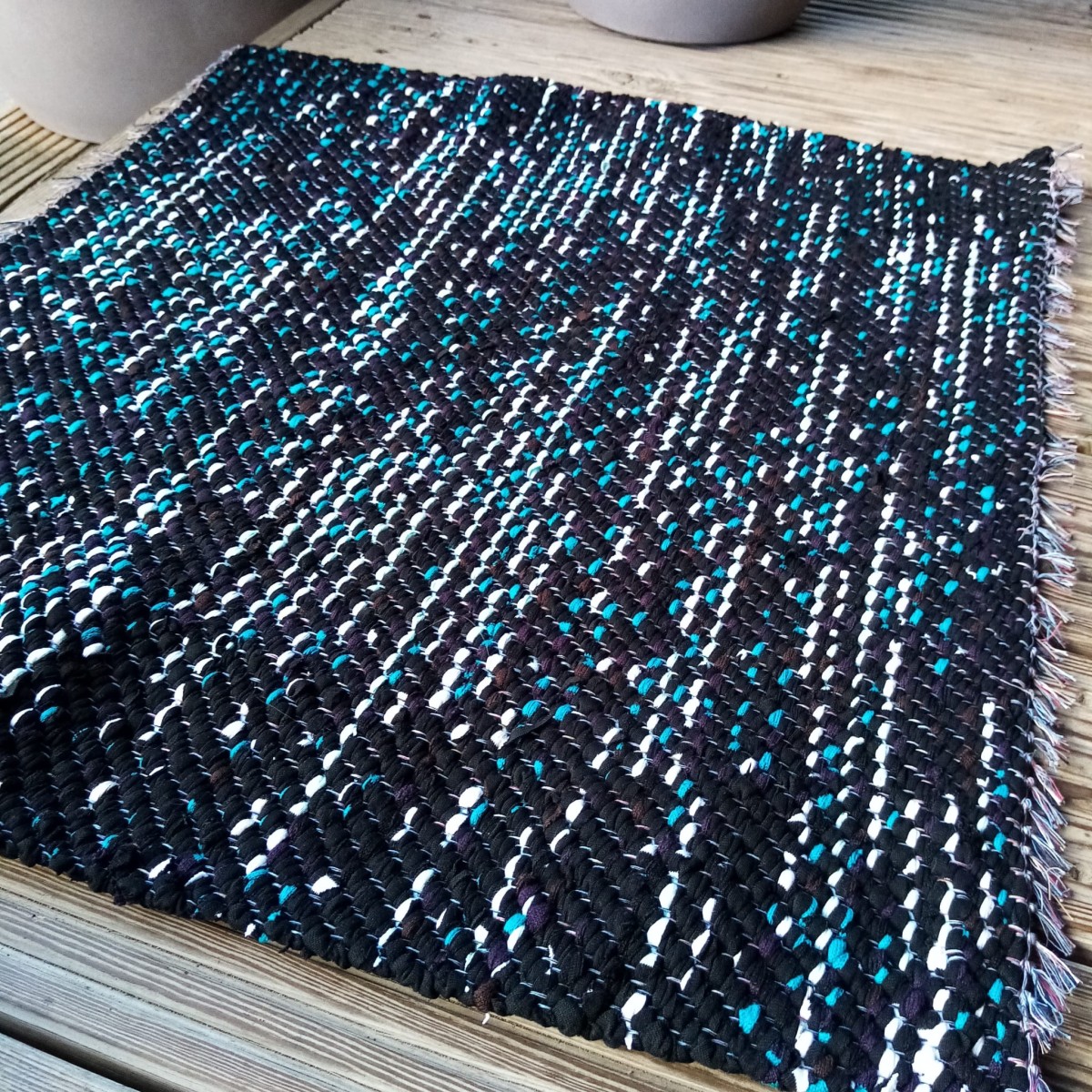 No pārstrādāta tekstila kokvilnas-linu velkos austs neliels paklājiņš melns ar tirkīza krāsas un baltiem raibumiņiem. Praktisks #lupatu_paklājs #grīdas-celiņš. Iespējams nosūtīt ar omnivu vai pēc vienošanās.