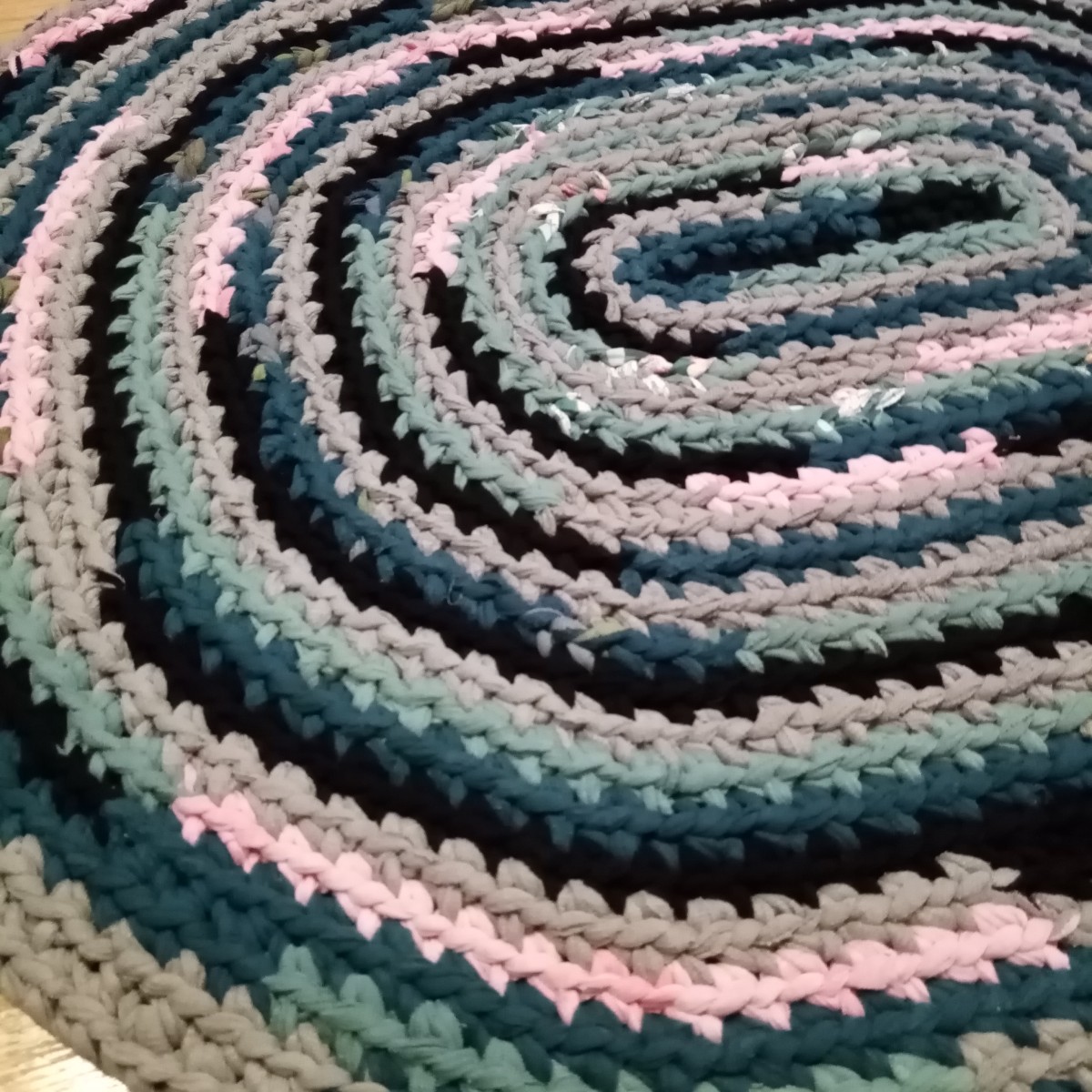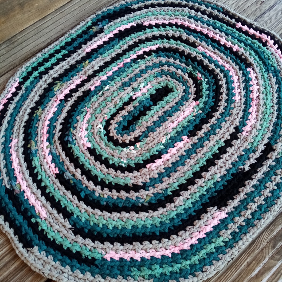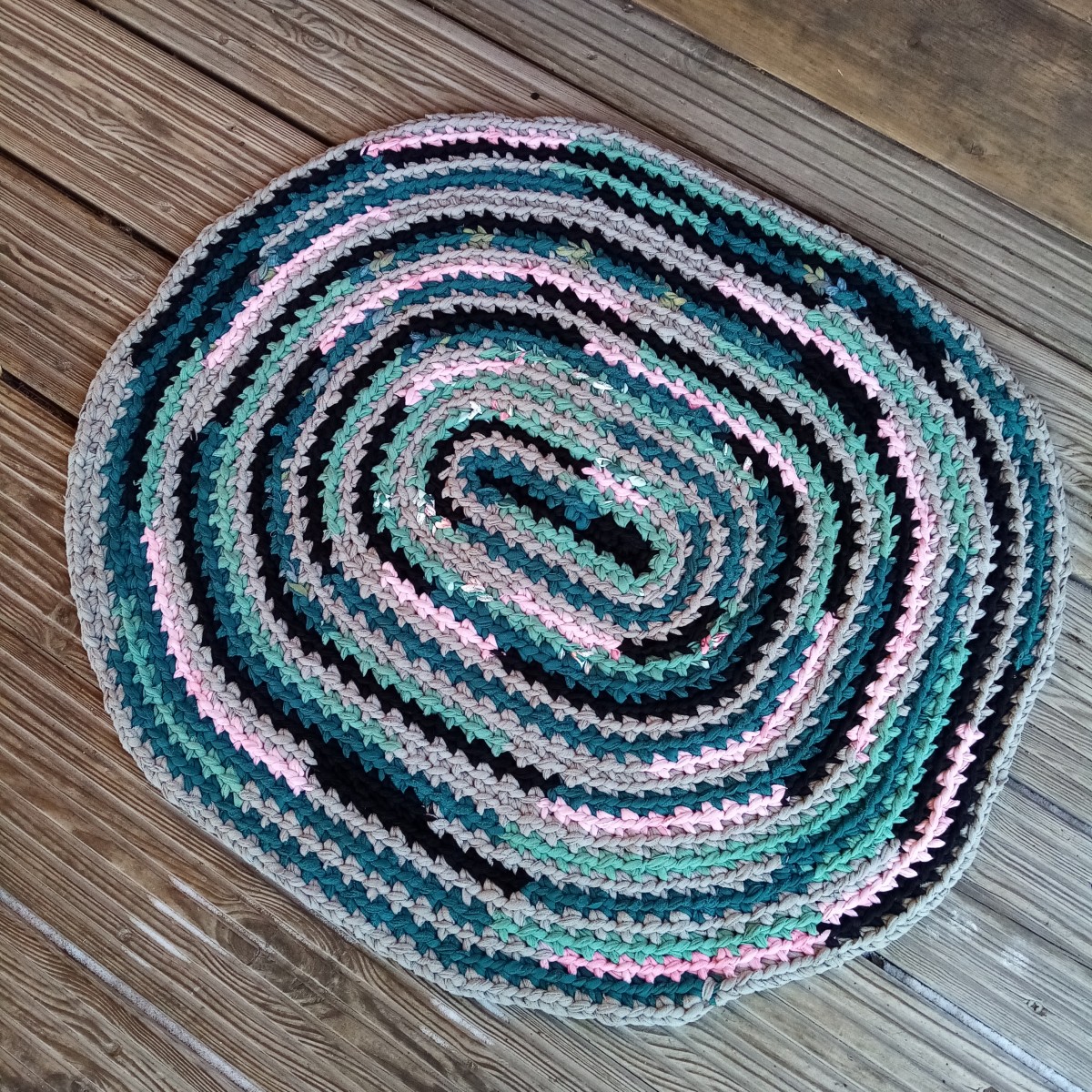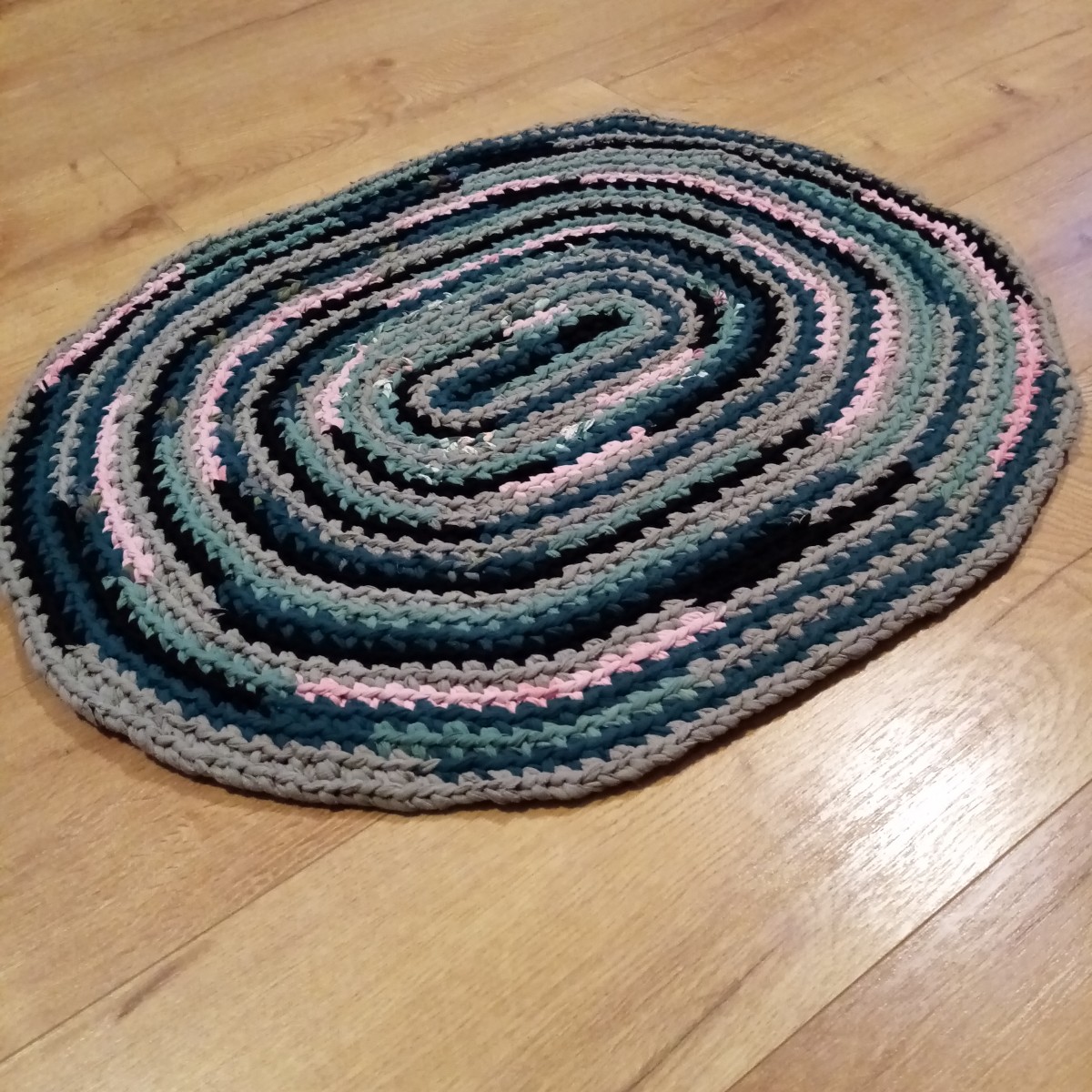 No trikotāžas materiāliem tamborēts ovāls paklājiņš 72 x 61 cm. Visi tamborējamie pavedieni sašūti kopā.
