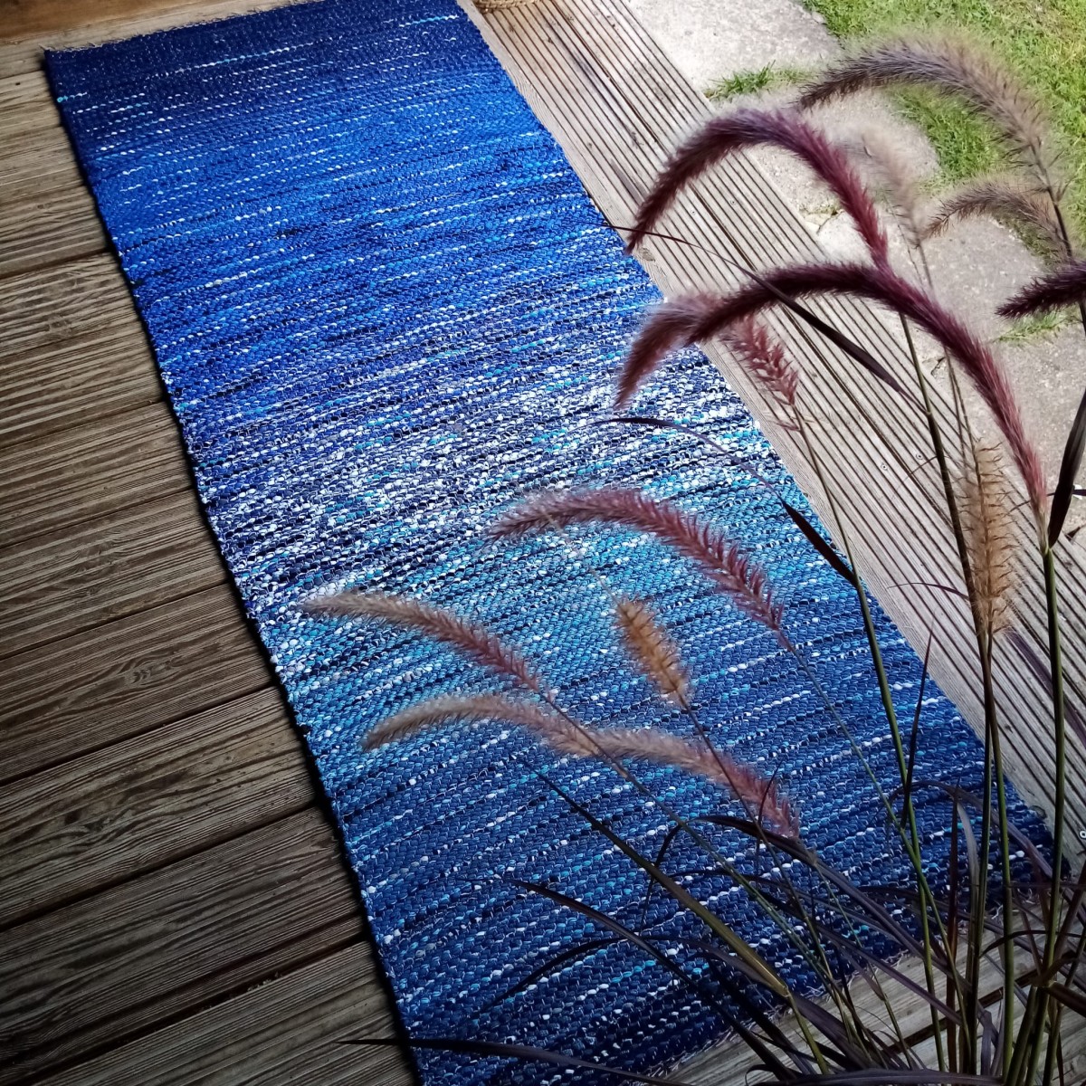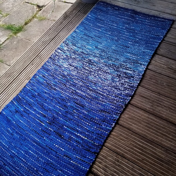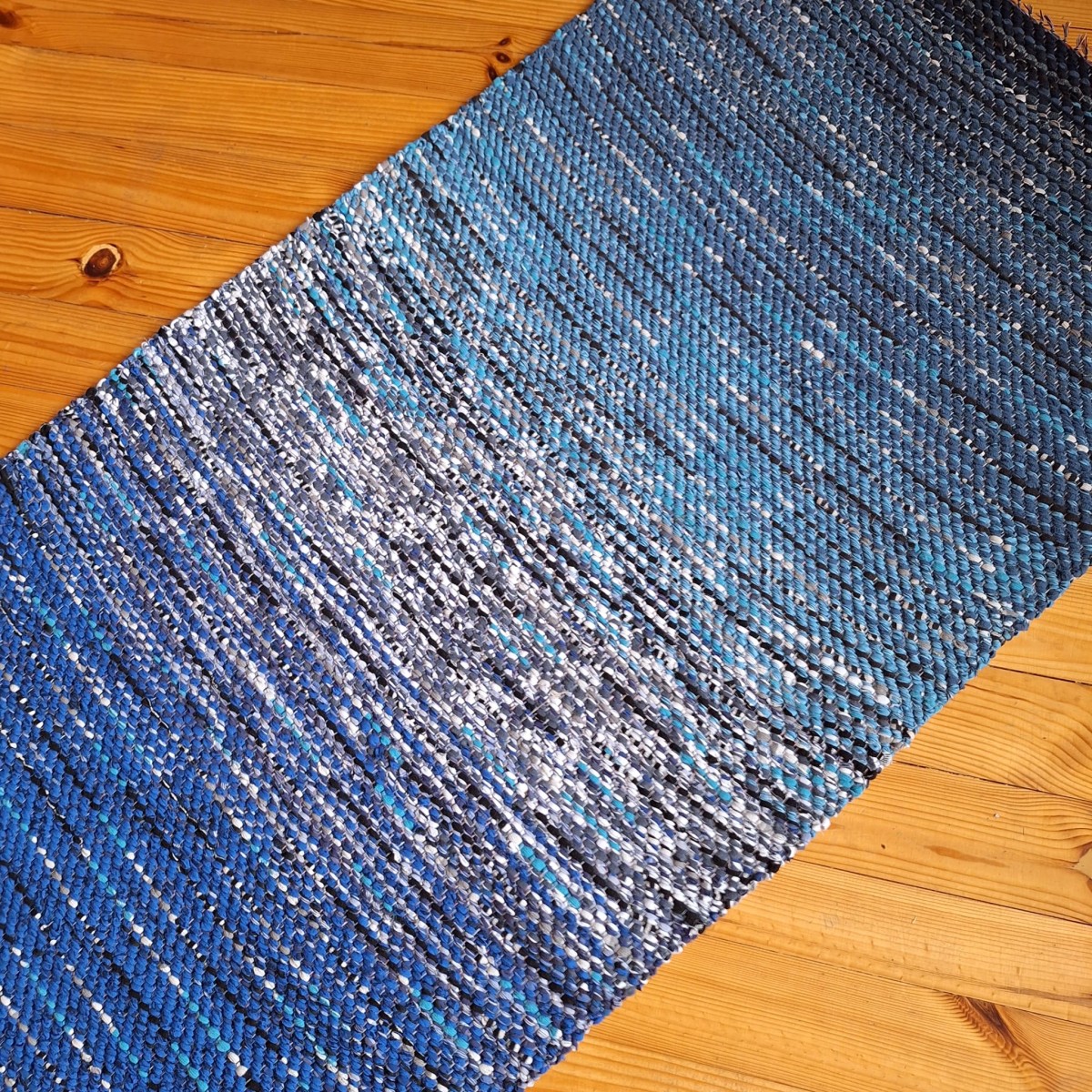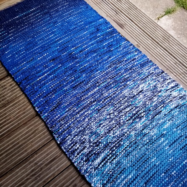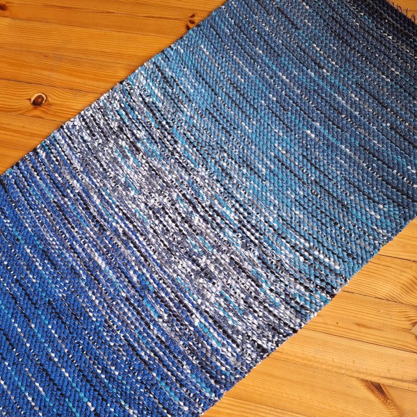 No pārstrādāta tekstila kokvilnas-linu velkos austs paklājs- grīdas celiņš zili raibās toņu pārejās. Garums 1.75m, platums 0.68m. Praktisks #lupatu_paklājs #grīdas-celiņš. Iespējams nosūtīt ar omnivu vai pēc vienošanās.