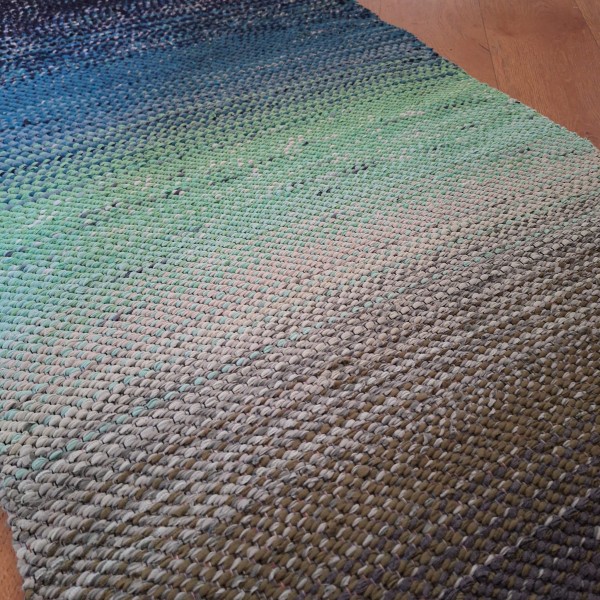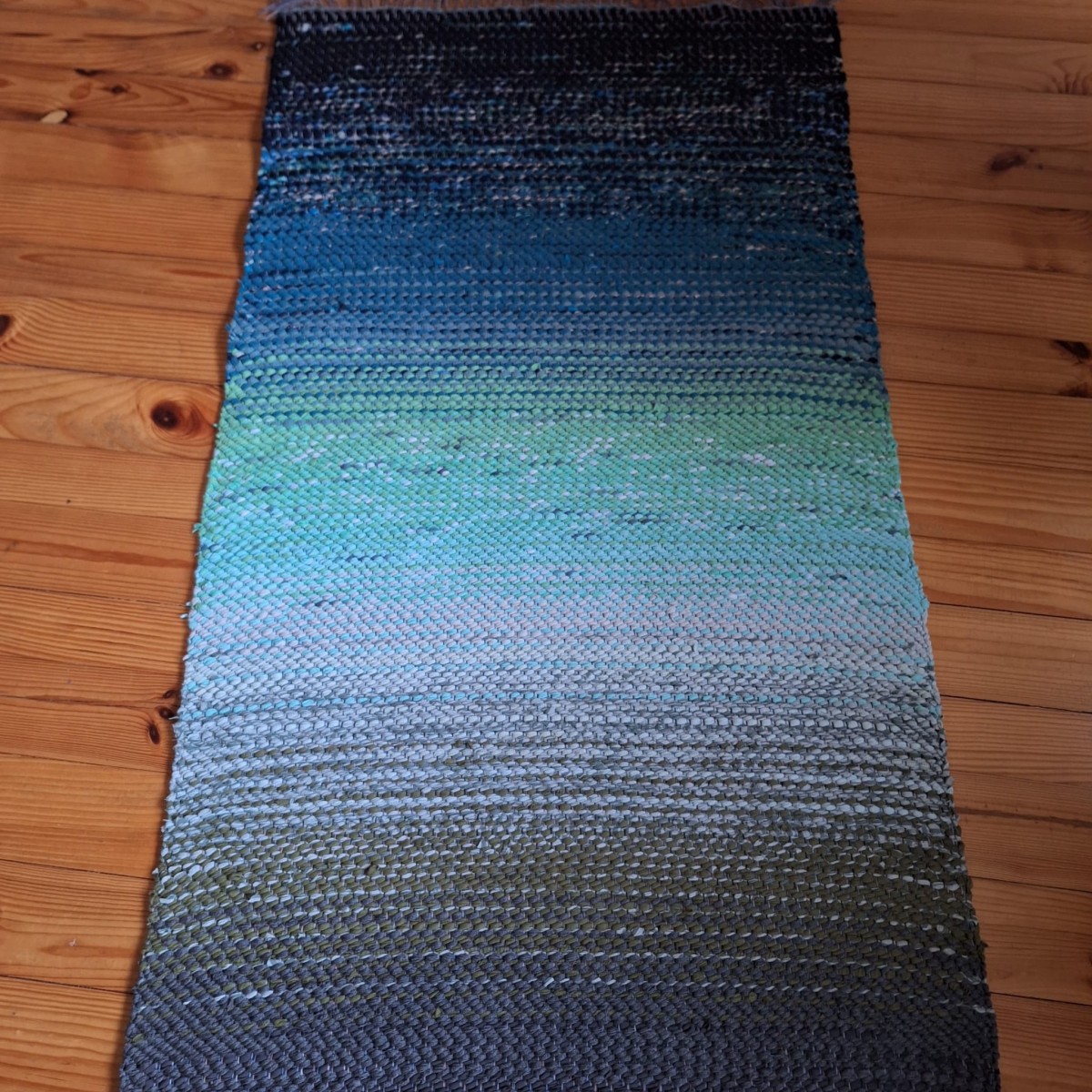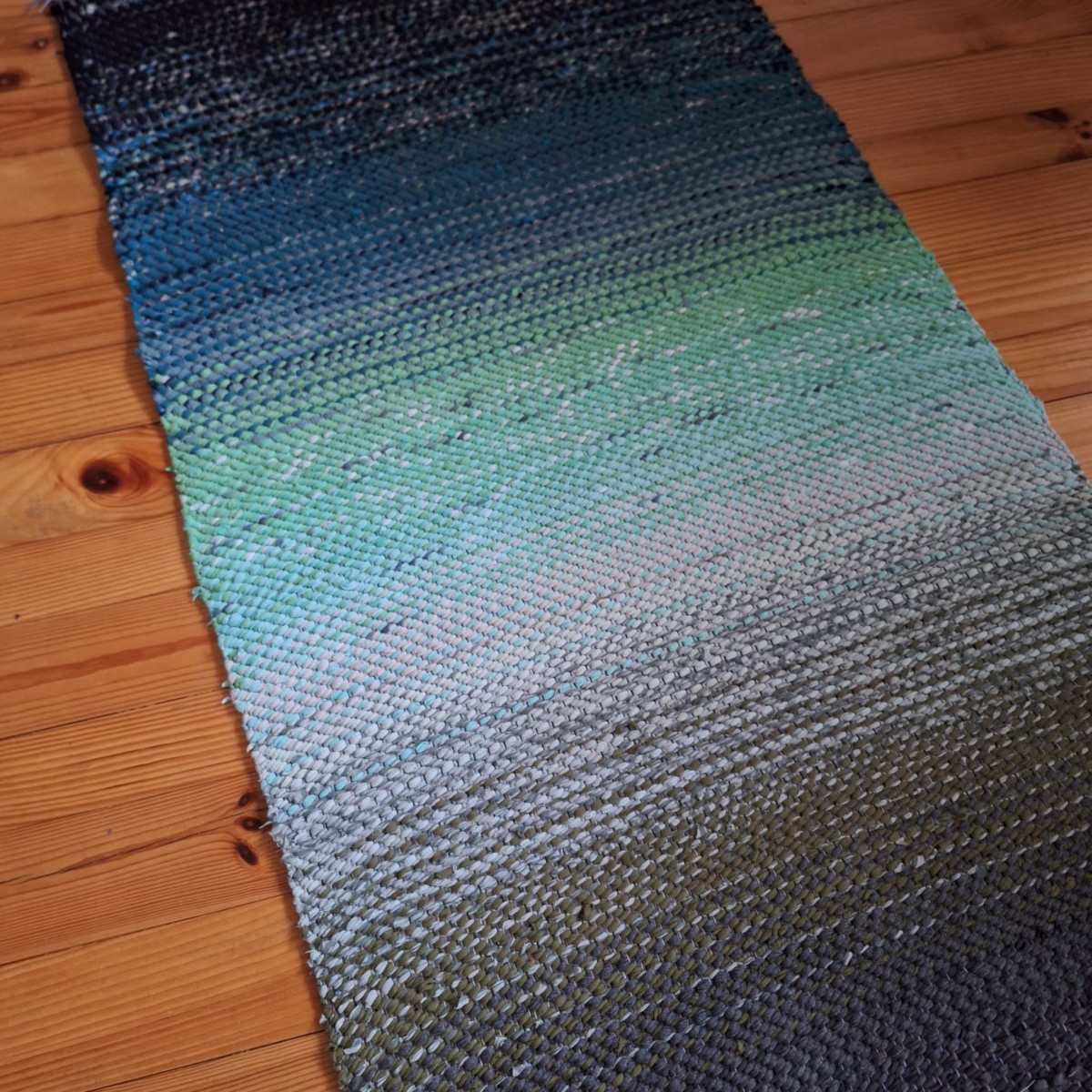 No pārstrādāta tekstila kokvilnas-linu velkos austs paklājs- grīdas celiņš zaļgano toņu pārejās. Praktisks #lupatu_paklajs #grīdas-celiņš. Iespējams nosūtīt ar omnivu vai pēc vienošanās.