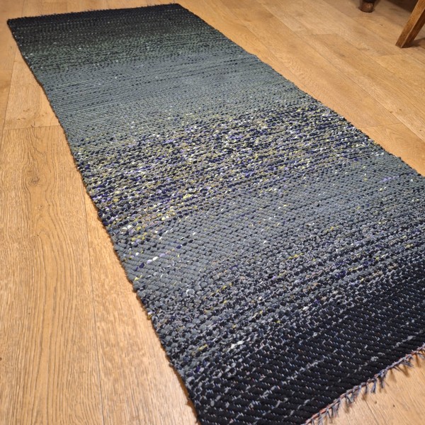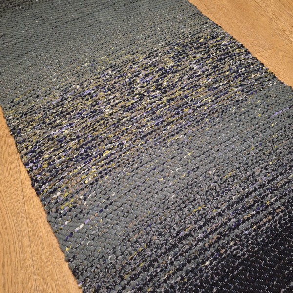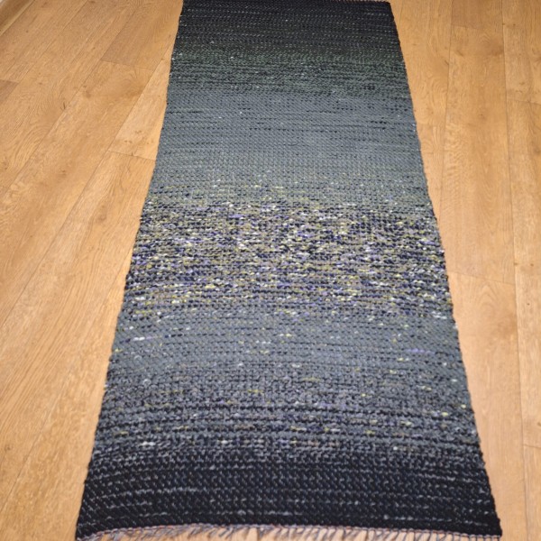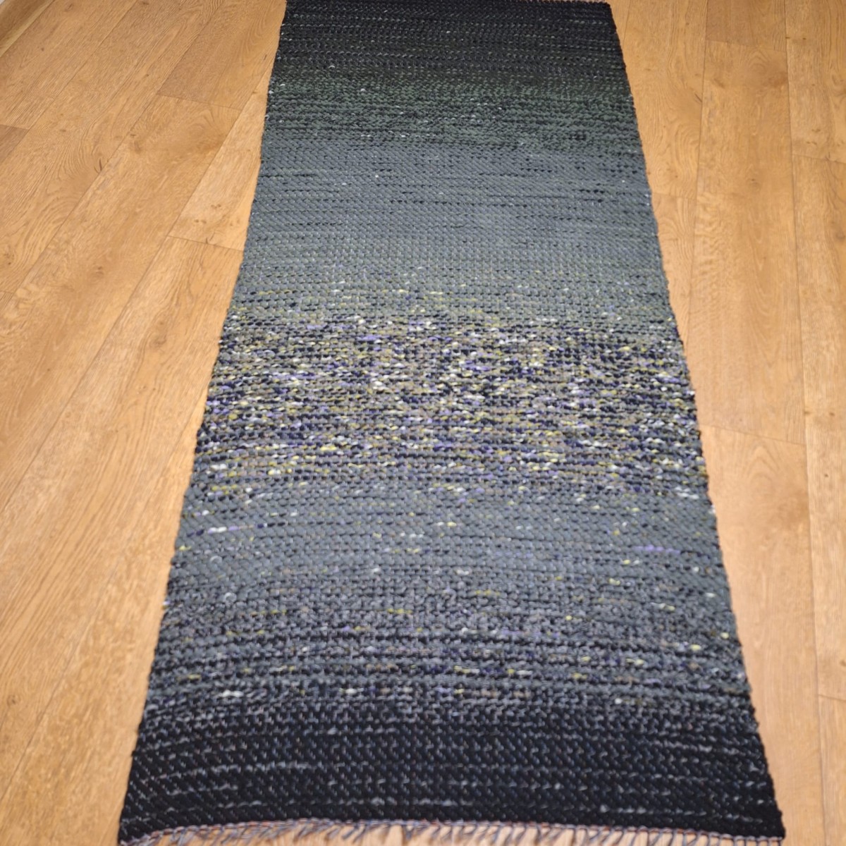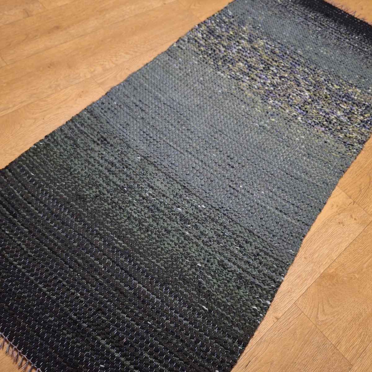 No pārstrādāta tekstila kokvilnas-linu velkos austs paklājs- grīdas celiņš . Dūmakaini zaļgani pelēkā toņu gammā. Garums 1.60m, platums 0.68m. Praktisks #lupatu_paklājs #grīdas-celiņš. Iespējams nosūtīt ar omnivu vai pēc vienošanās.
