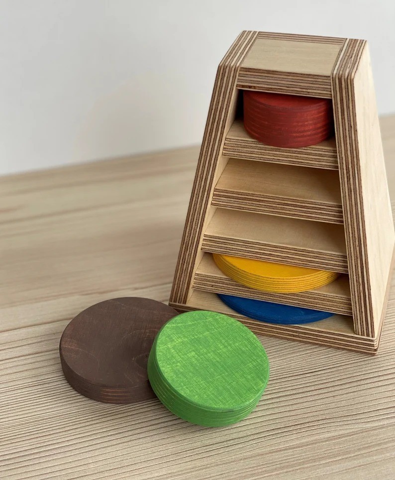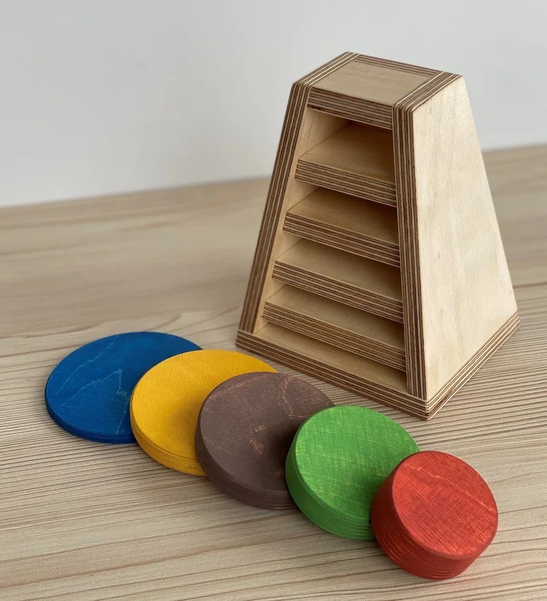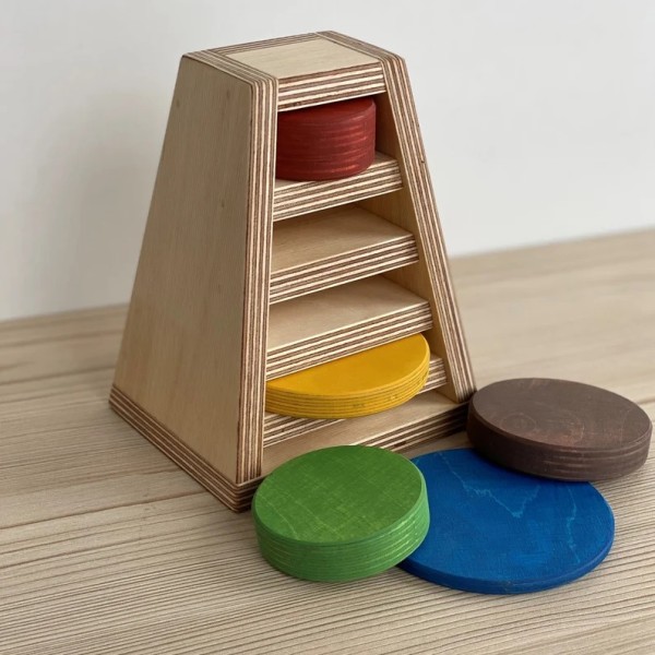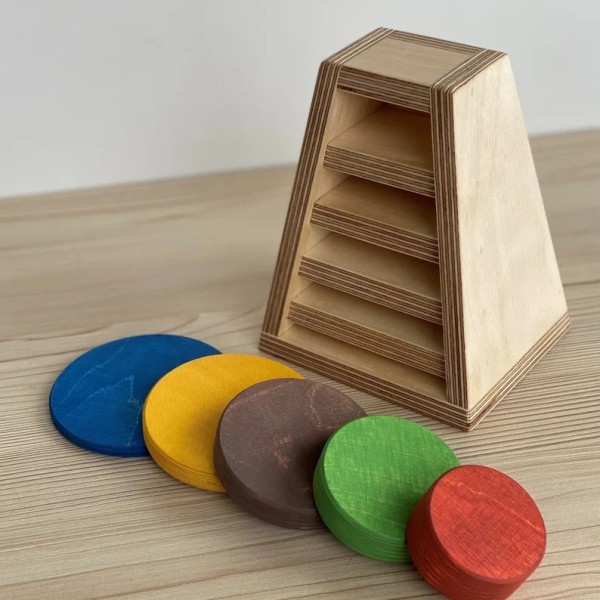 Apļu tornis satur piecu dažÄdu izmÄru un krÄsu apļus. BÄrna uzdevums ir salikt apļus atbilstoÅ”i savÄs vietÄs.