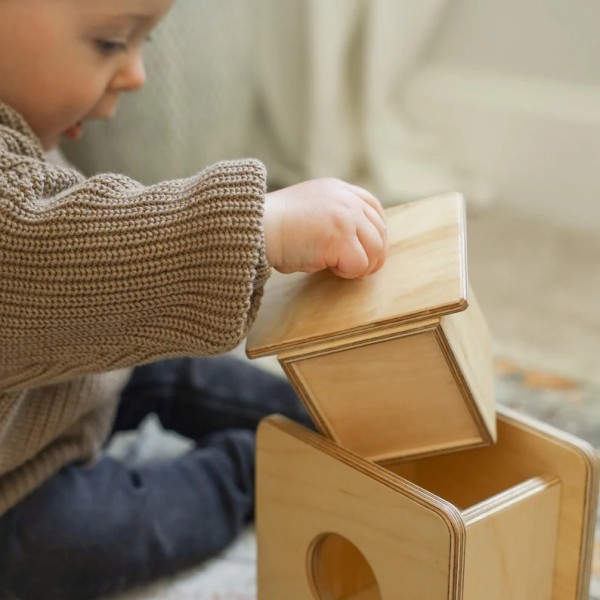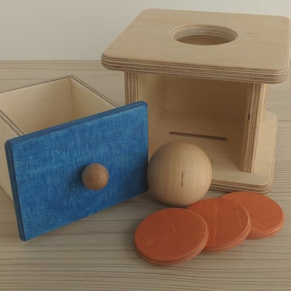 Kastītes vienā pusē ir apaļš atvērums, caur kuru lādītē var ievietot apaļu koka bumbu. Savukārt kastītes otrā pusē ir iegarena šaura atvere, caur kuru lādītē var ievietot koka aplīšus.