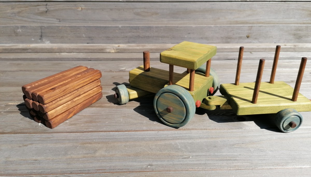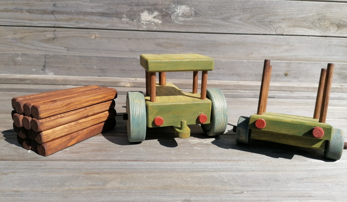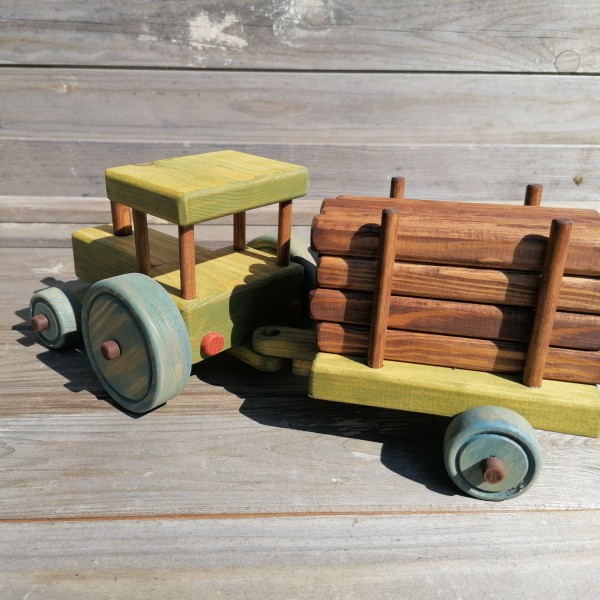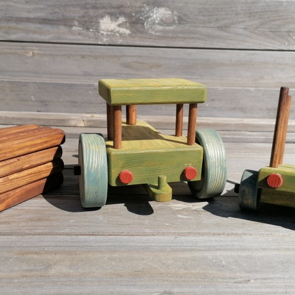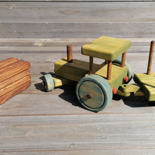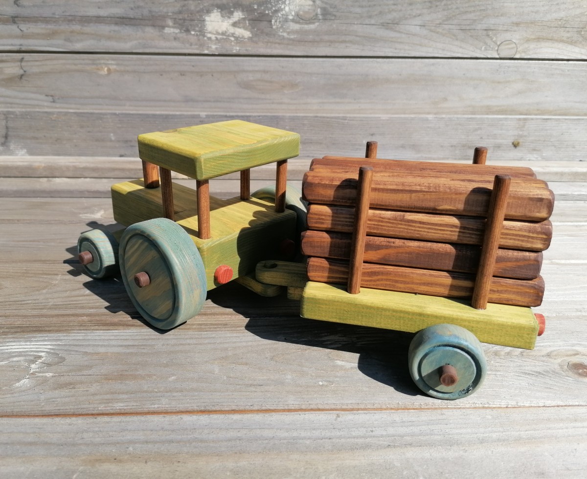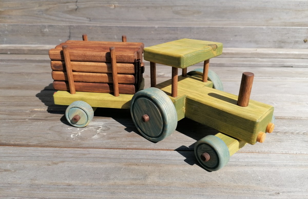 Nenopietni: Iespējams, zaļākais un latviskākais traktors pasaulē! Bērnu rotaļu traktors ar piekabi un spēļu baļķiem! Par latviskumu liecina – 1) gatavots no Latvijas koka, 2) krāsots ar Latvijā ražotām ekoloģiskām lineļļas beicēm, 3) gatavojis latvietis, 4) nākamais īpašnieks, iespējams, būs latvietis! BRĪDINĀJUMS – vecākiem bez jaunā īpašnieka atļaujas spēlēties kategoriski aizliegts! Garums – 35 cm; augstums – 13cm; platums – 15cm.