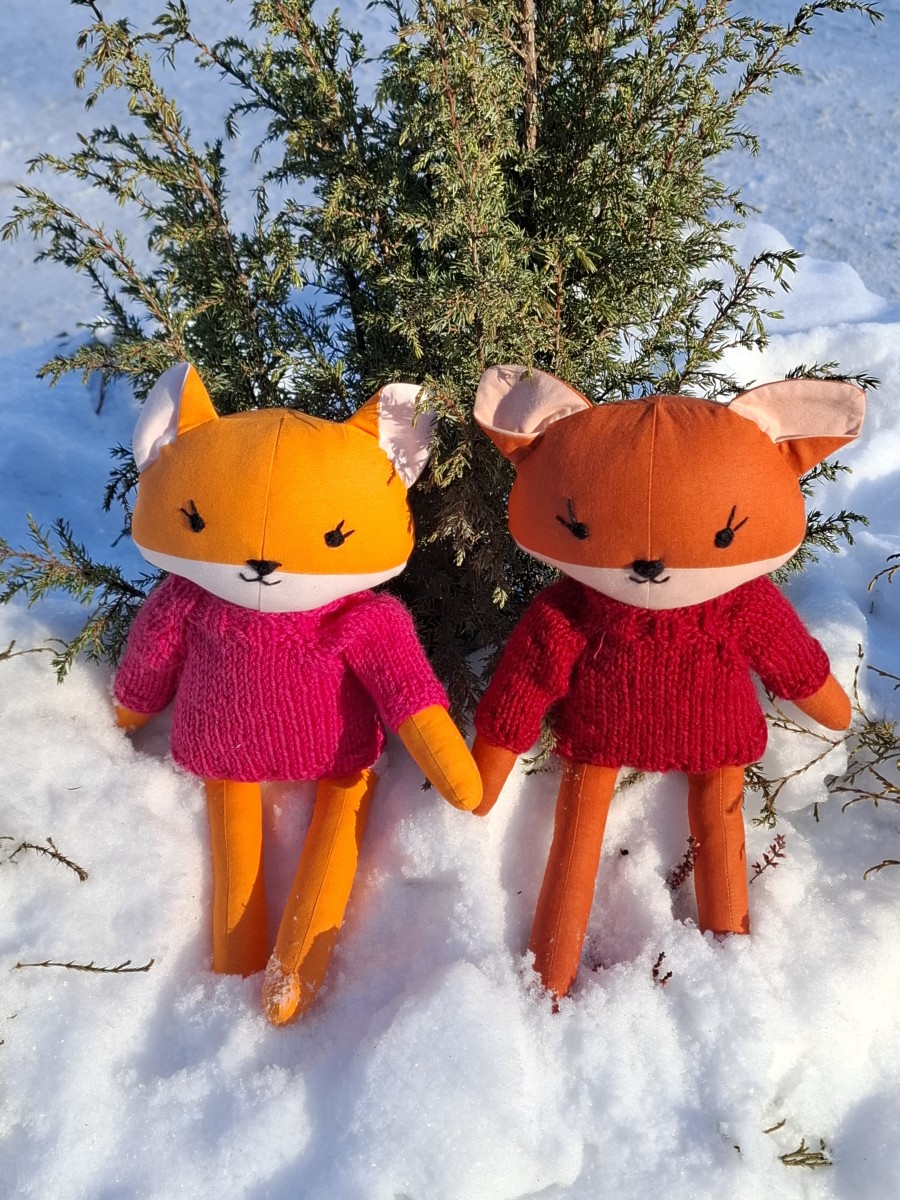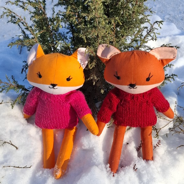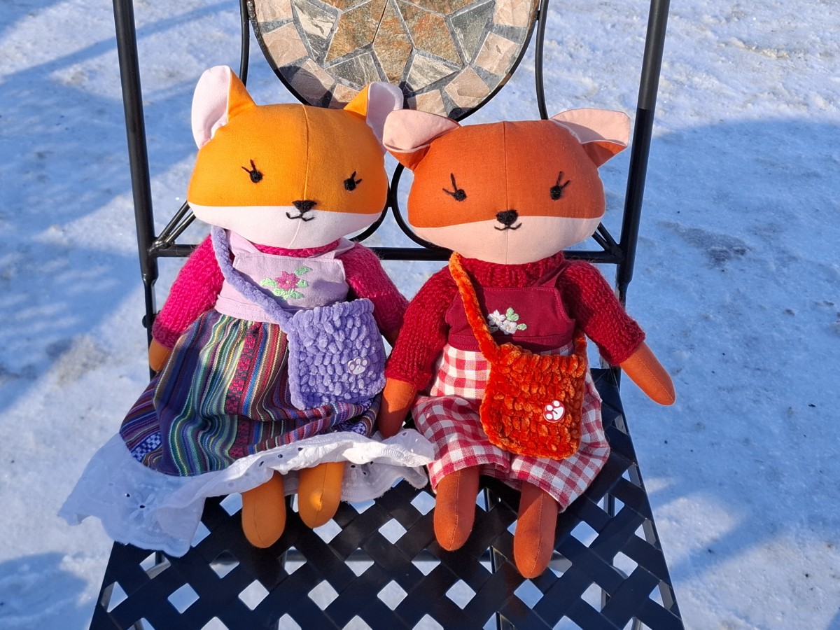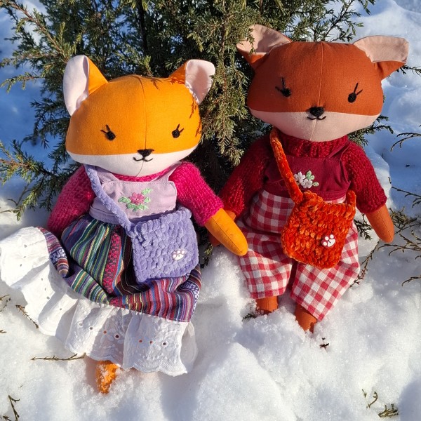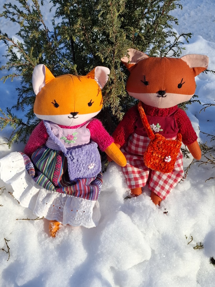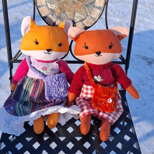 No auduma šūtas lapsiņas. Pildījums sintepons. Garums 38 cm. Lapsiņai komplektā kleita/kombinezons, adīts džemperis un somiņa. Sūtot ar omnivu +sūtīšanas izmaksas