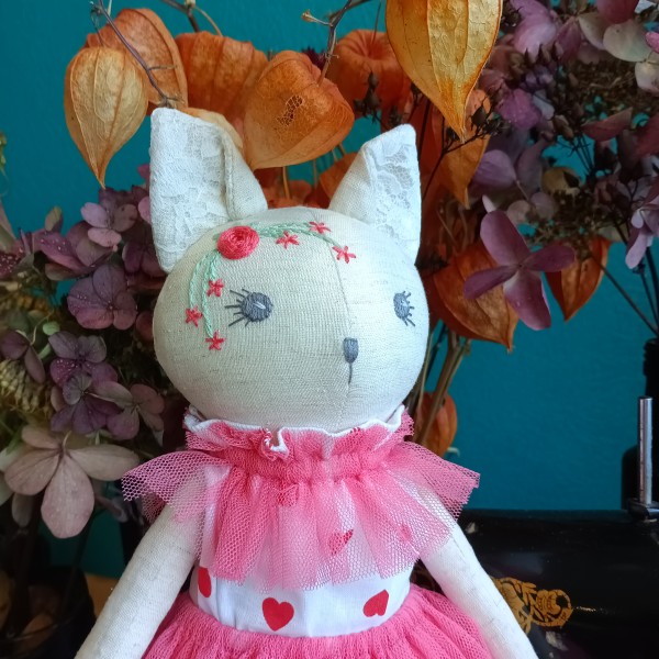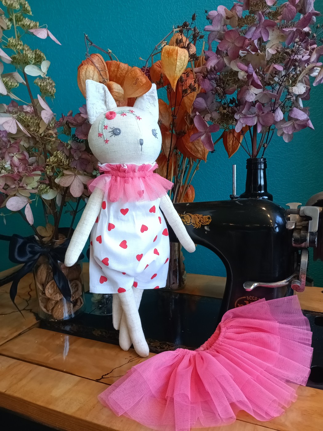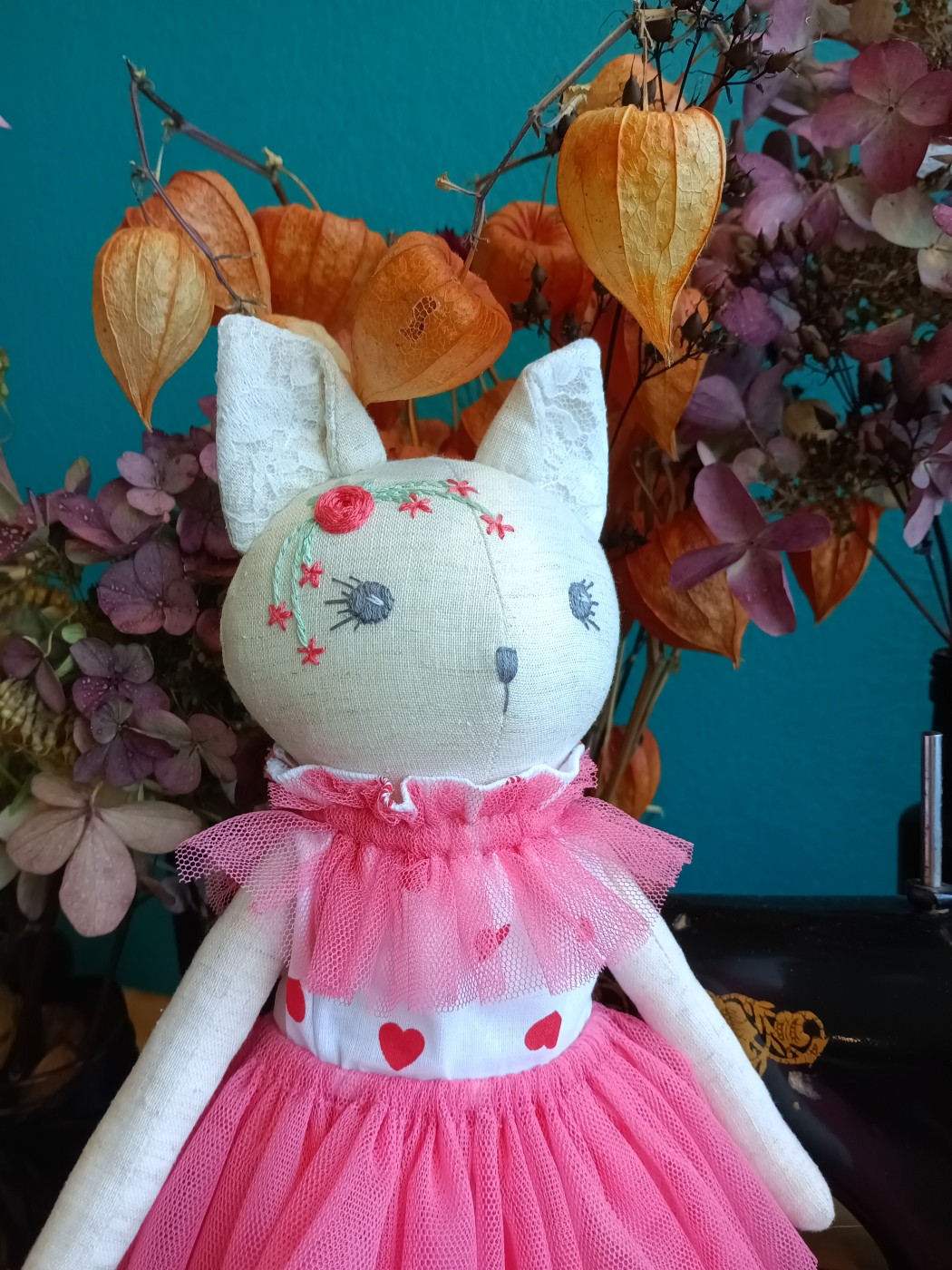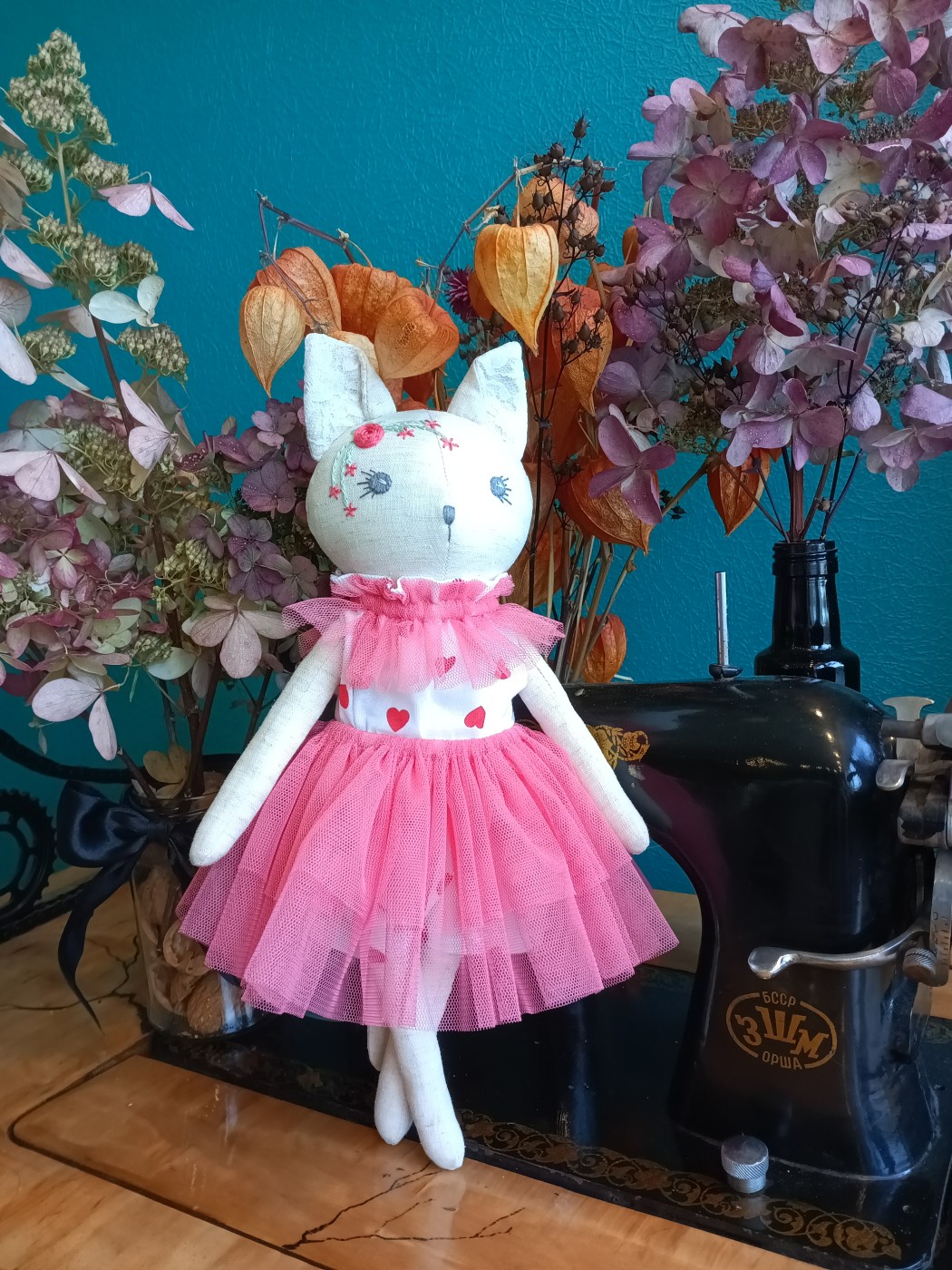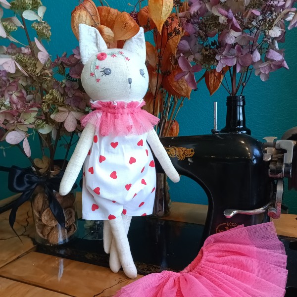 Lelle Kaķenīte- Izgatavota no lina, pildīta ar sinteponu (antialerģisks materiāls), garums 31cm + 4cm ausis, izšūta ar rokām, kombinezonu, svārkus un apakšbikses var novilkt.