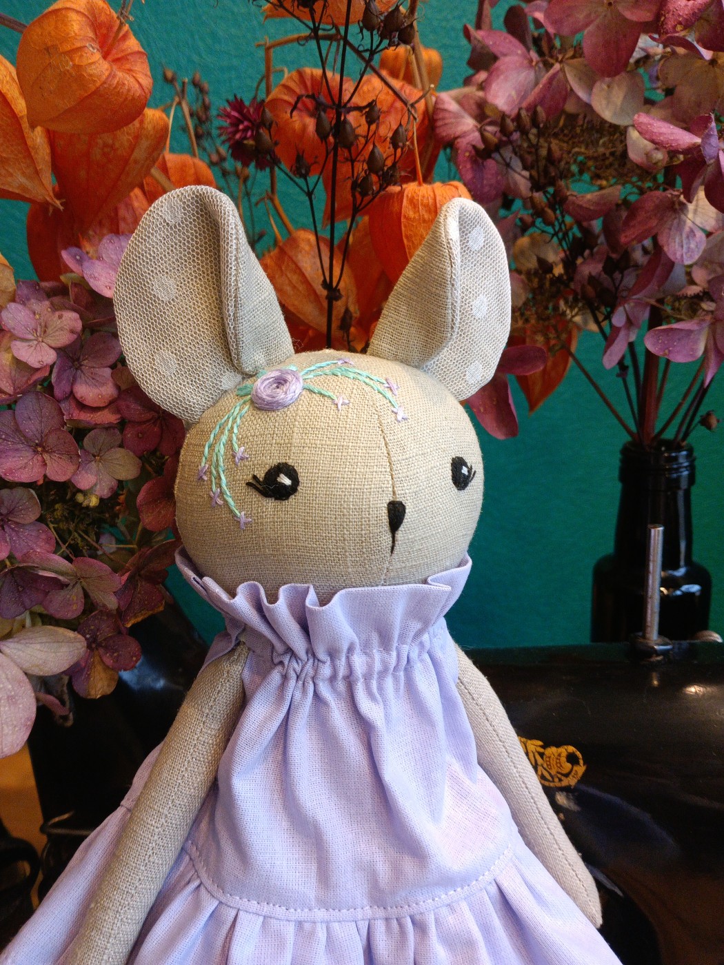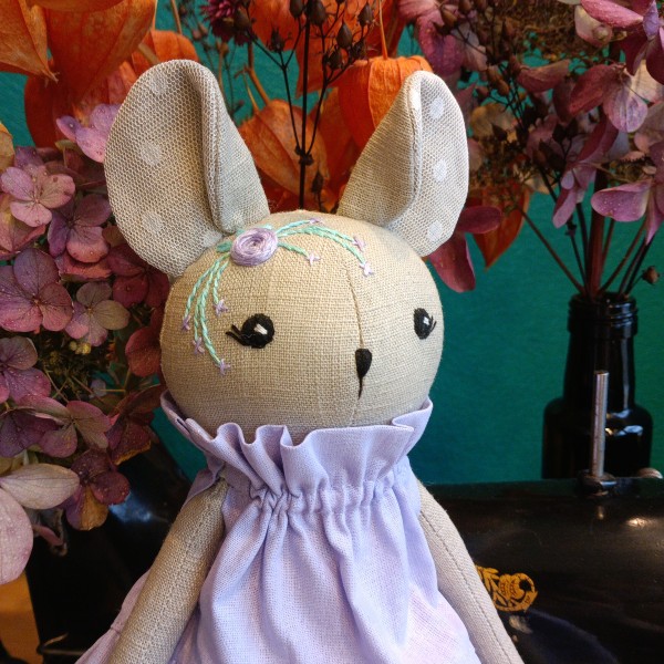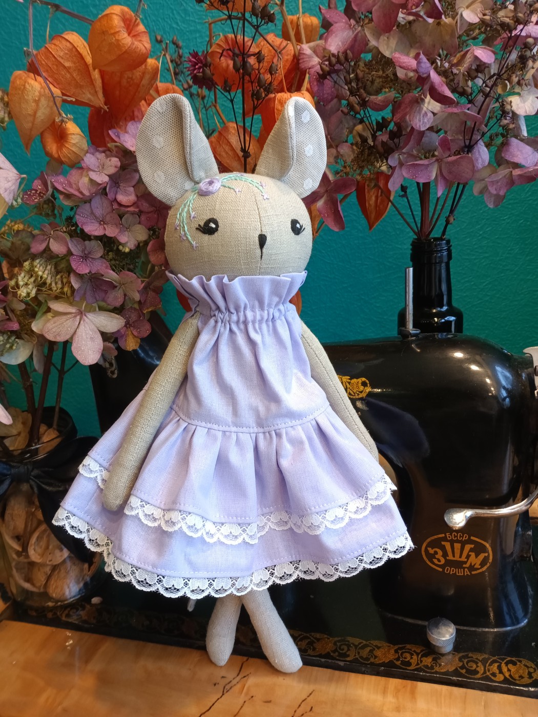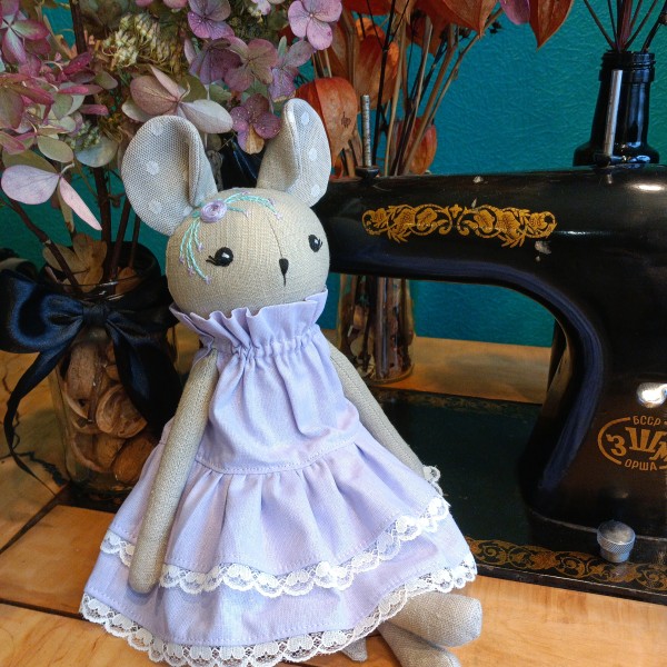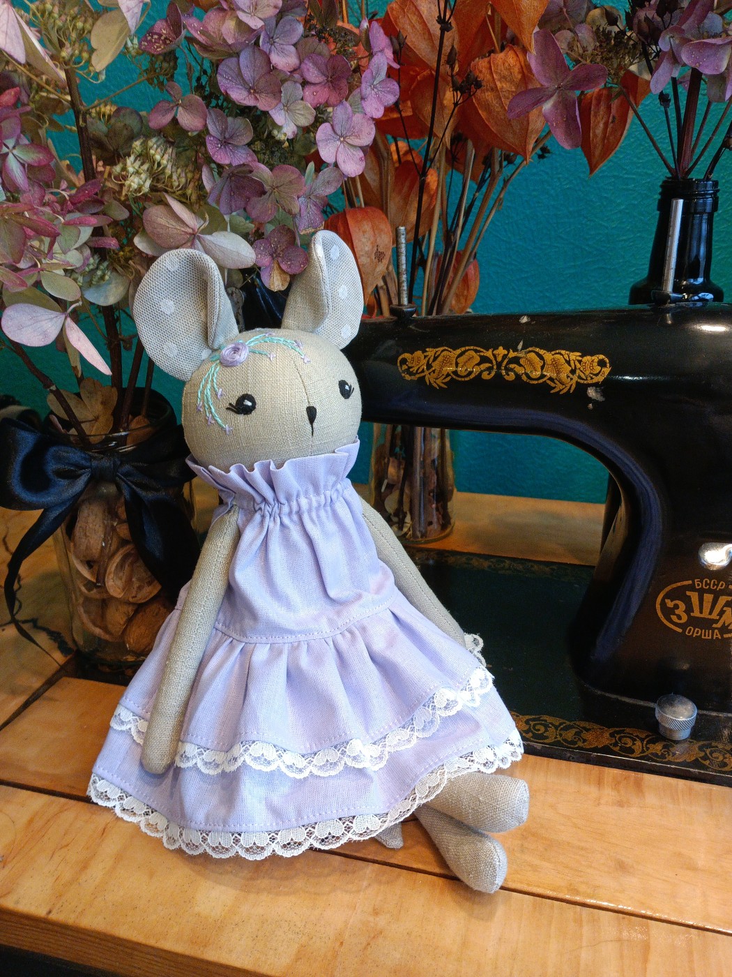 Lellīte Pelīte - Izgatavota no lina, pildīta ar sinteponu (antialerģisks materiāls), garums 30-31cm + 4,5cm ausis, izšūta ar rokām, kleitu un apakšbikses var novilkt. Nesatur sīkas detaļas.