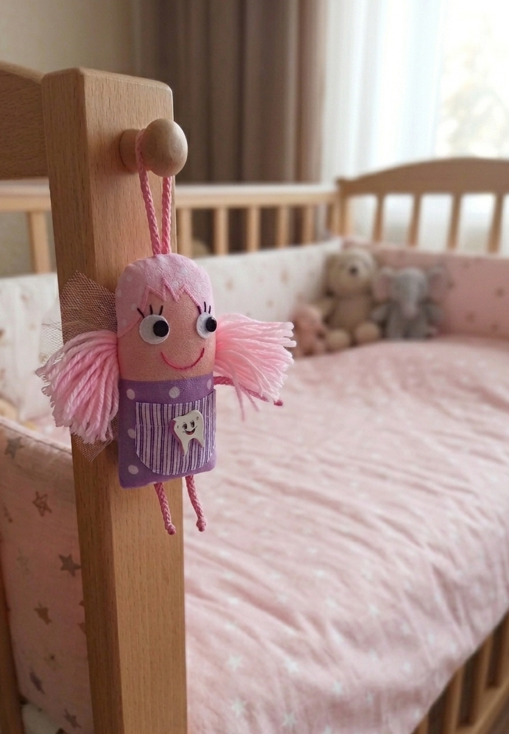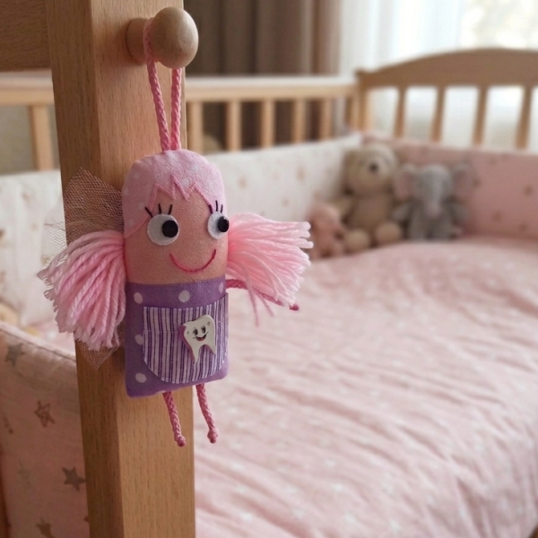 Zobu feja. Viņai ir īpaša kabata, kurā var ielikt pazaudēto zobu. Apmaiņā viņa tev atnesīs naudiņu! Augšpusē ir cilpa, lai tu varētu feju piekarināt, piemēram, pie savas gultiņas.