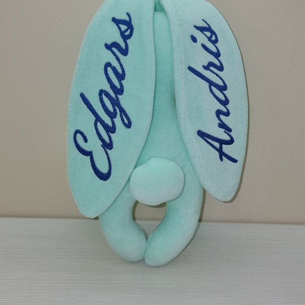 Izšūta mantiņa, zaķēns ar vārdu uz ausīm