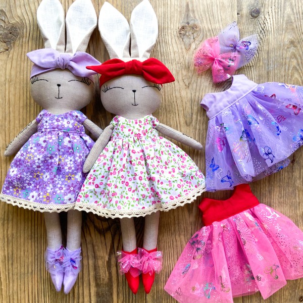 Skaistās zaķu meitenes fifīgajās kleitiņās, klāt apaviņi un galvas rotas. Apģērbs iespējams vairākās krāsās. Dāmu augums mērot ar ausīm 43cm. Viss apģērbs ir noģērbjams. Var pasūtīt arī papildus tērpus vai veselu garderobi.
