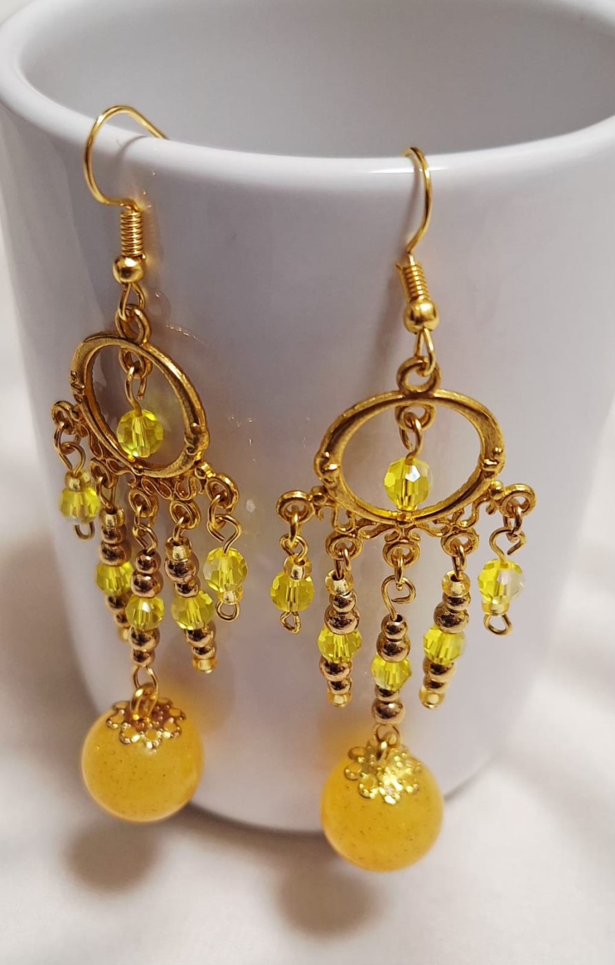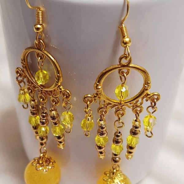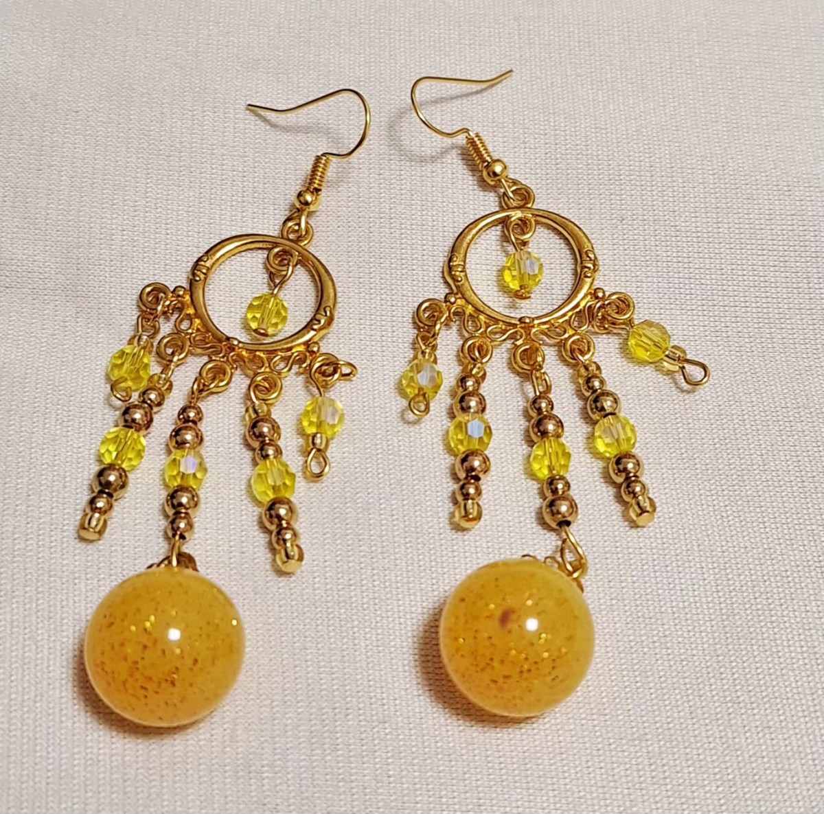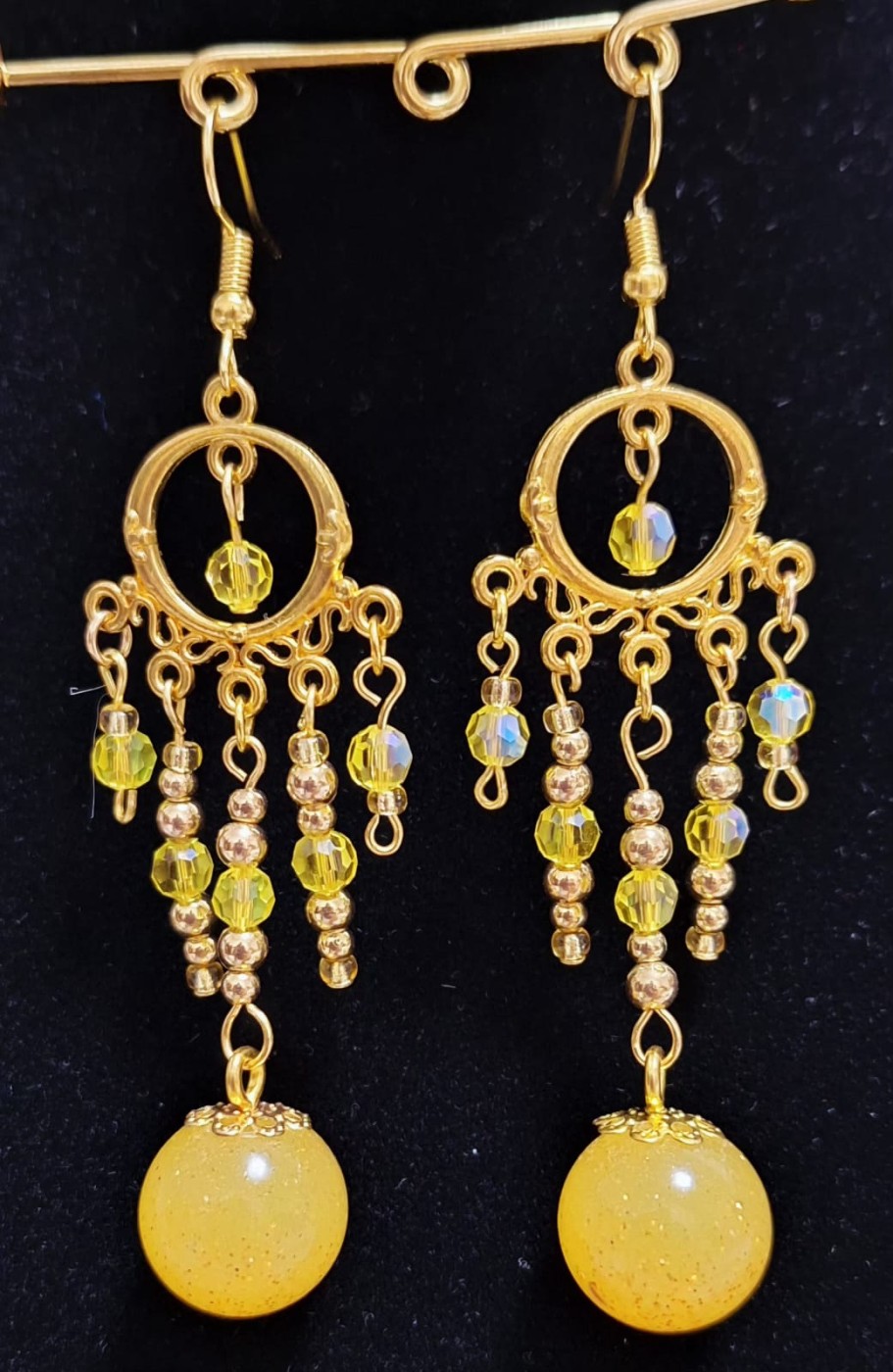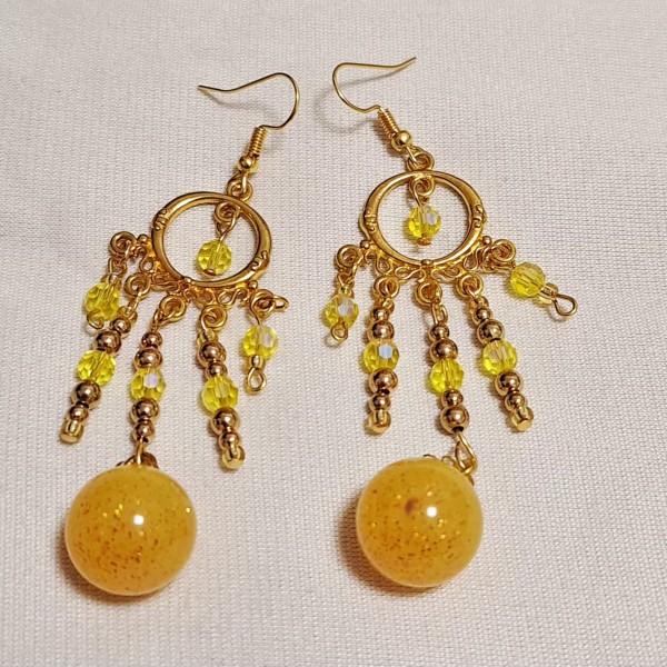 Auskaru lielākā pērle izgatavota no epoksīda sveķiem (roku darbs), pārējais sastāvdaļas: Primero kristāli (Austrija), metāliskas zelta krāsas pērlītes (Ķīna), apzeltīta metāla furnitūra. Auskaru garums kopā ar auskaru āķi 9 cm.